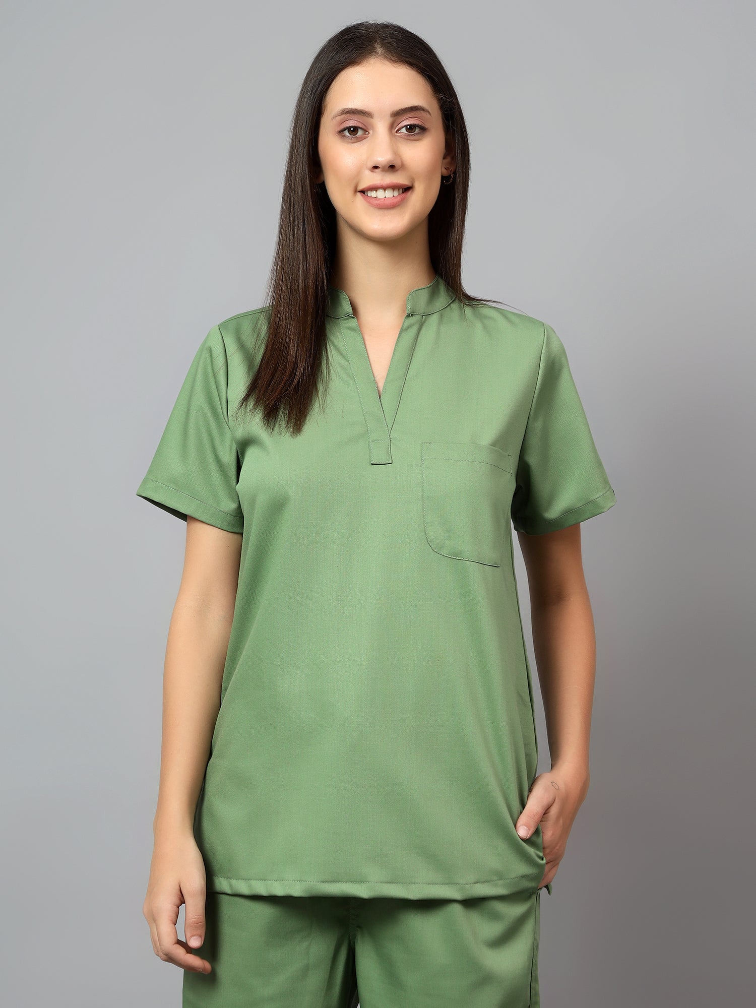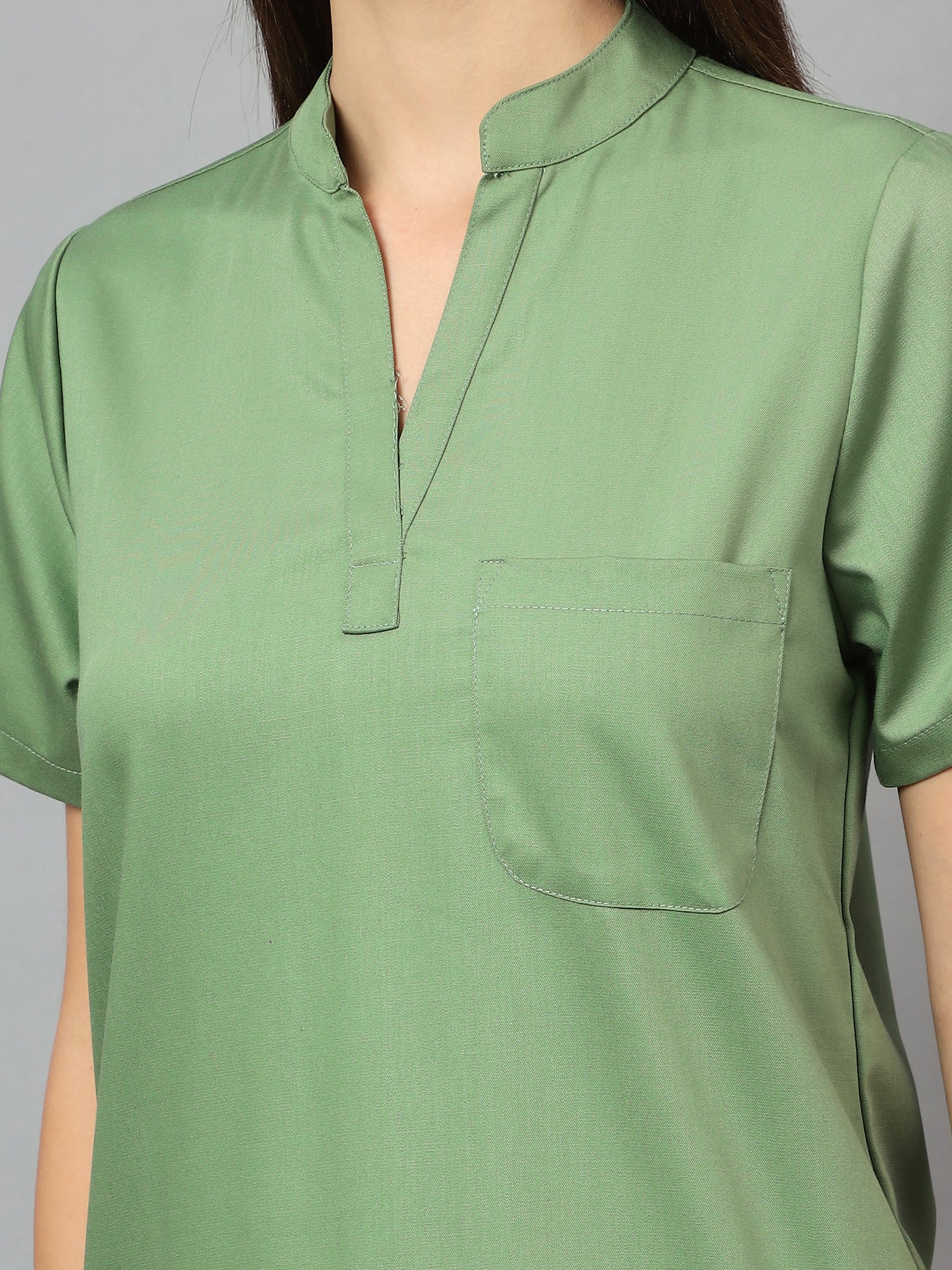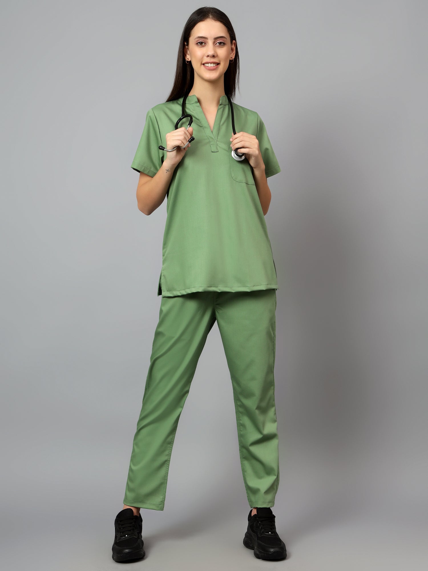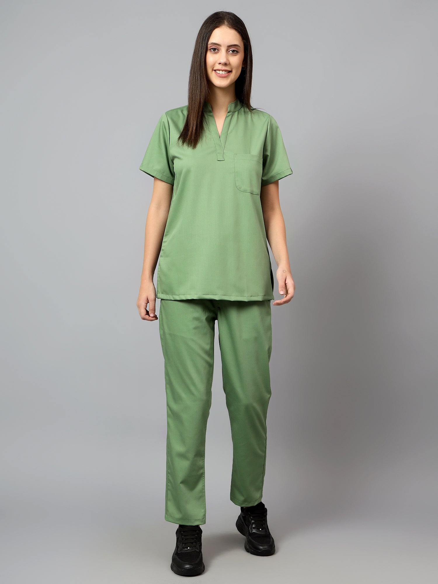 Stretchable (2Way) Female Pista Green Mandarin Neck With Straight Pant Scrub Set