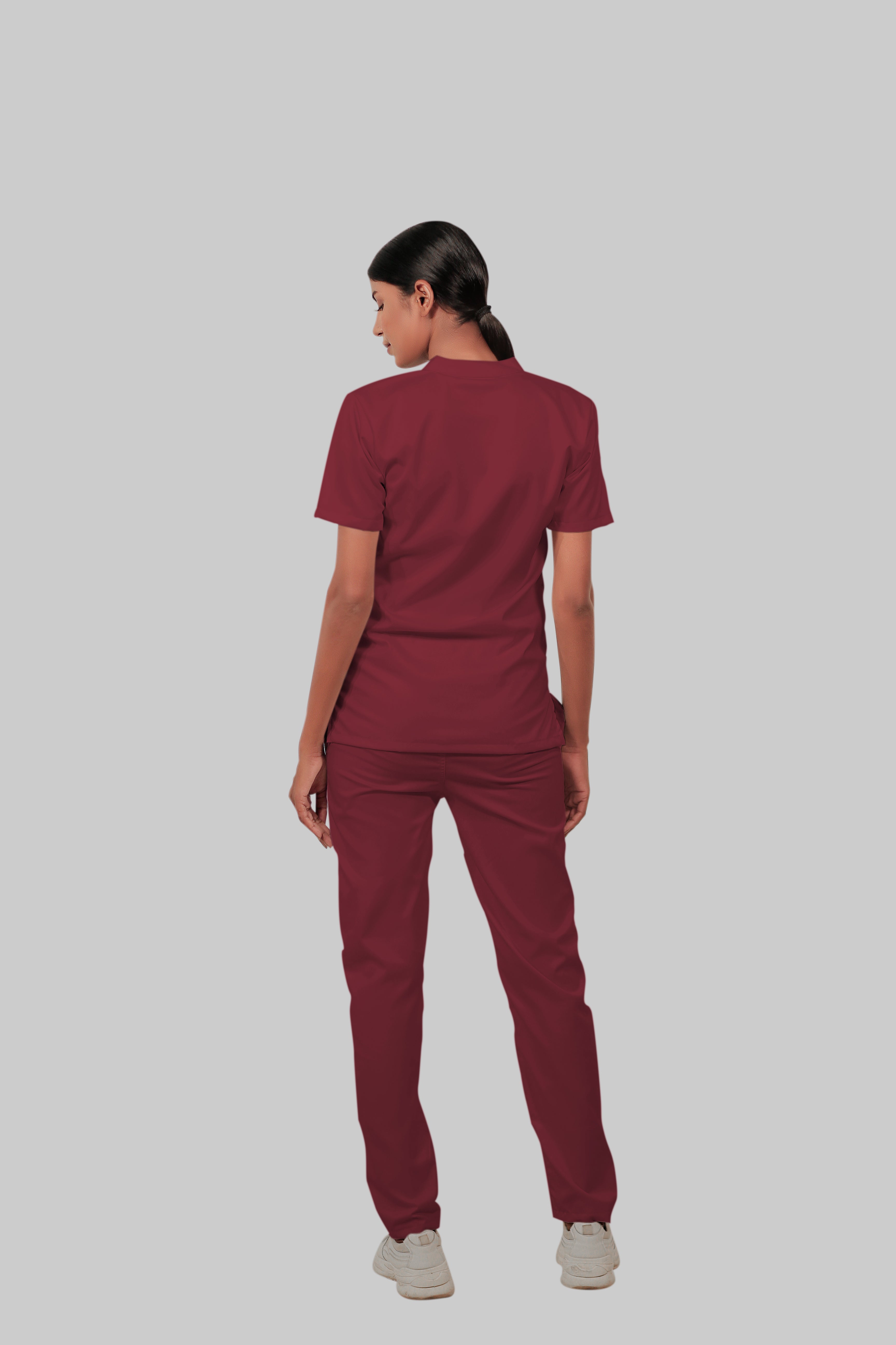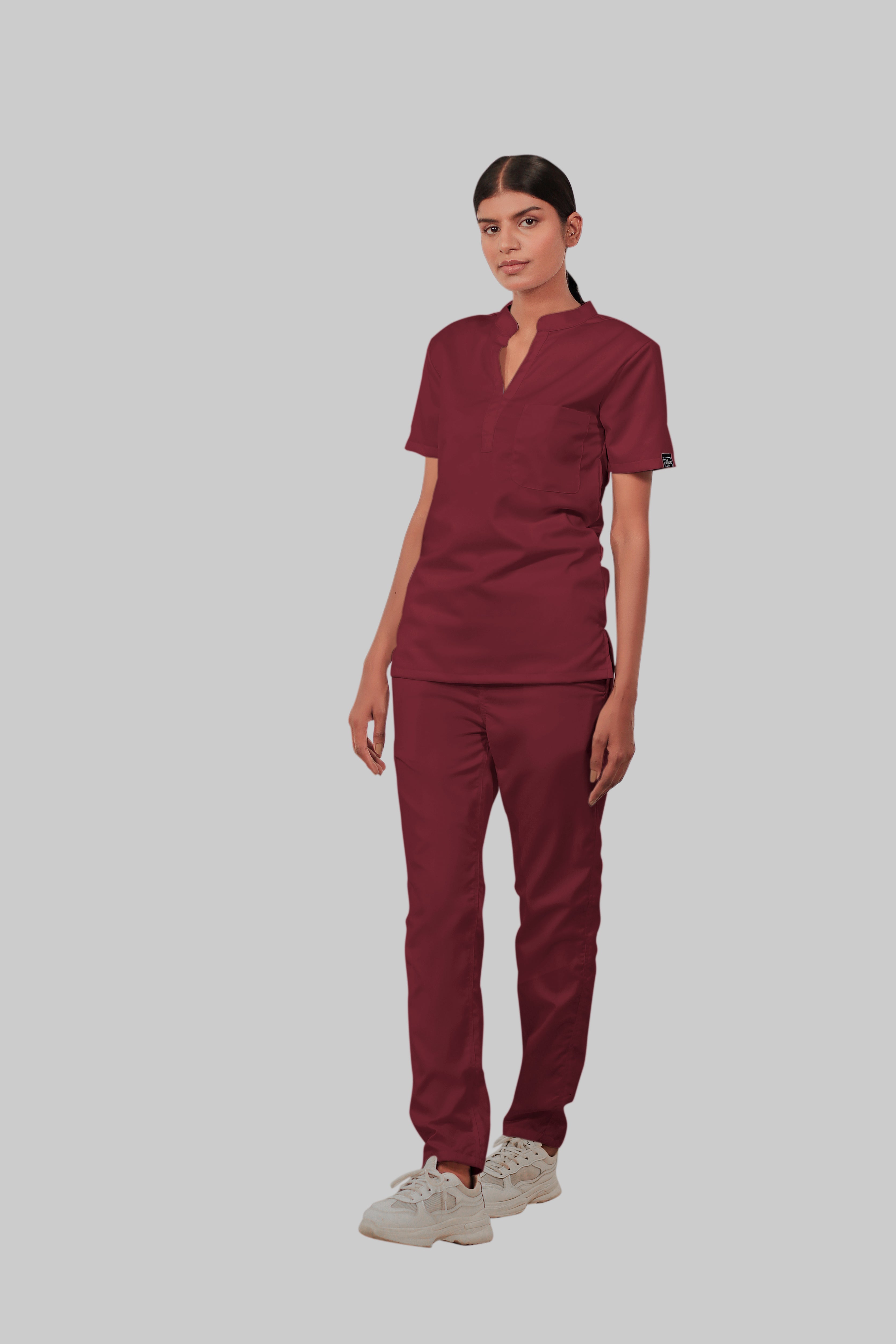 Stretchable (2Way) Female Maroon Mandarin Neck With Straight Pant Scrub Set