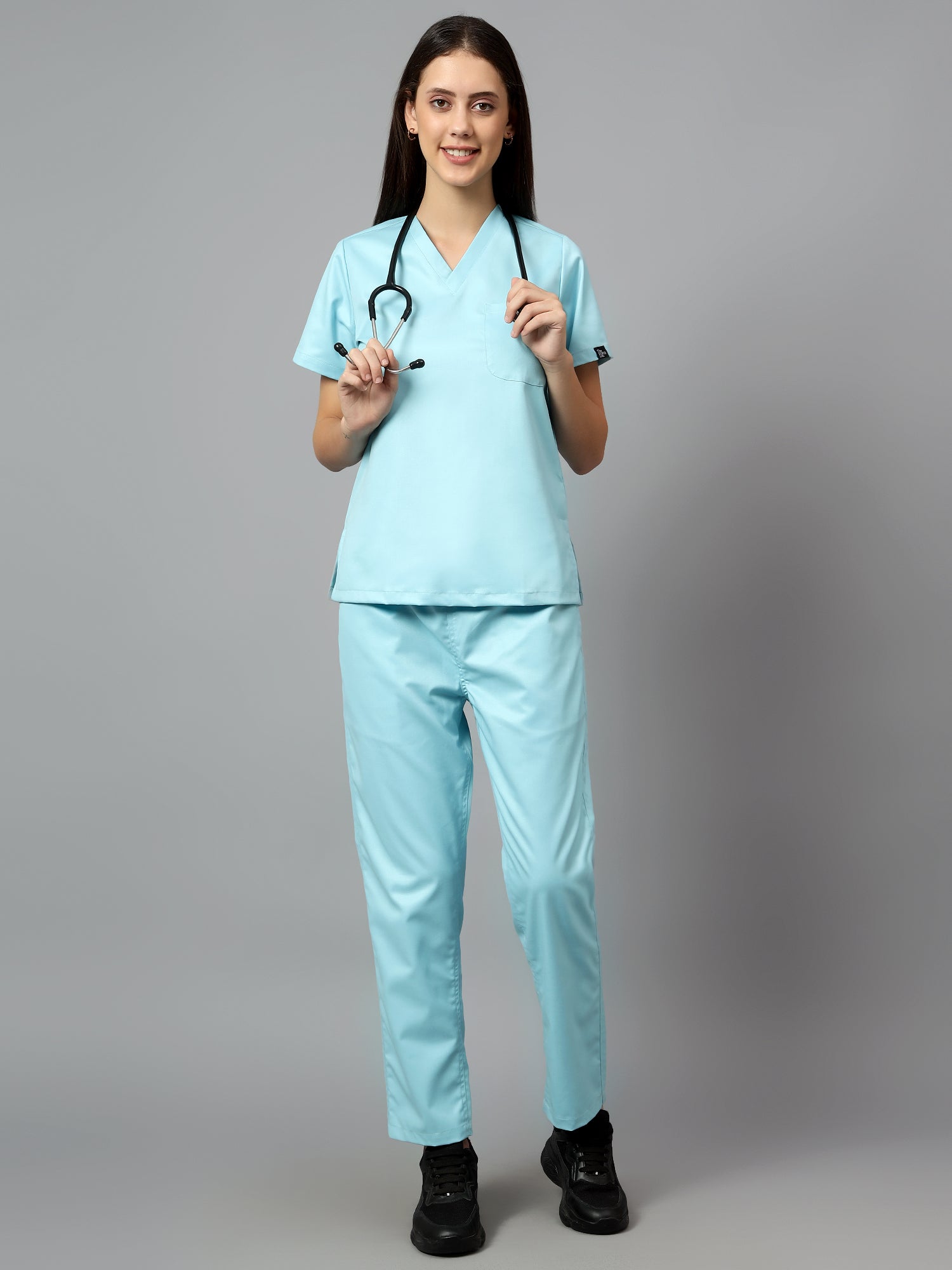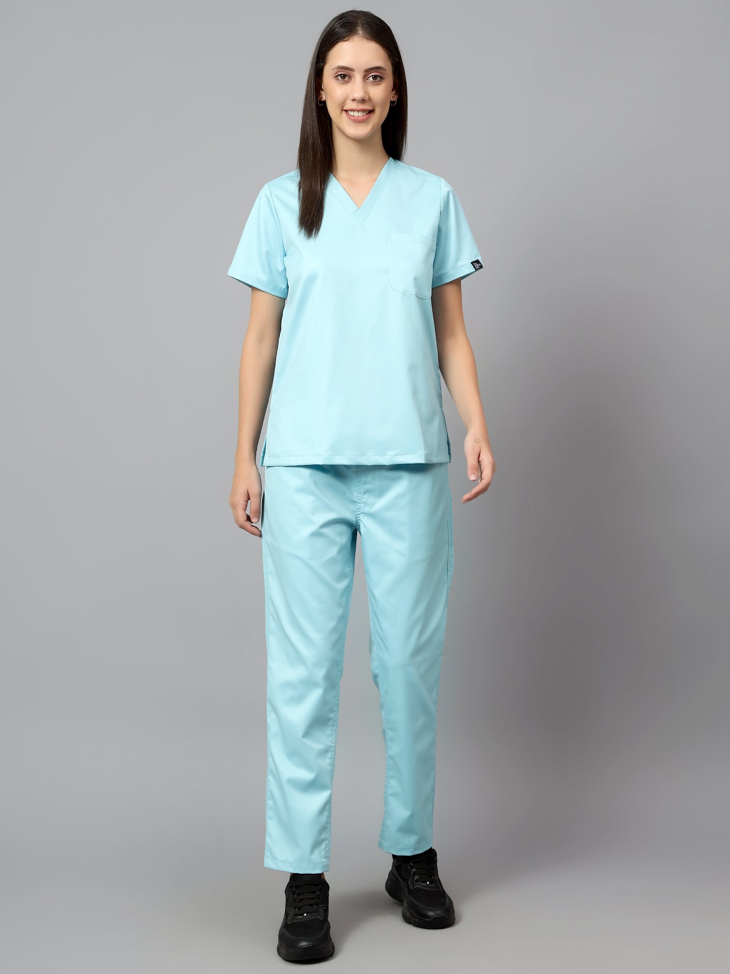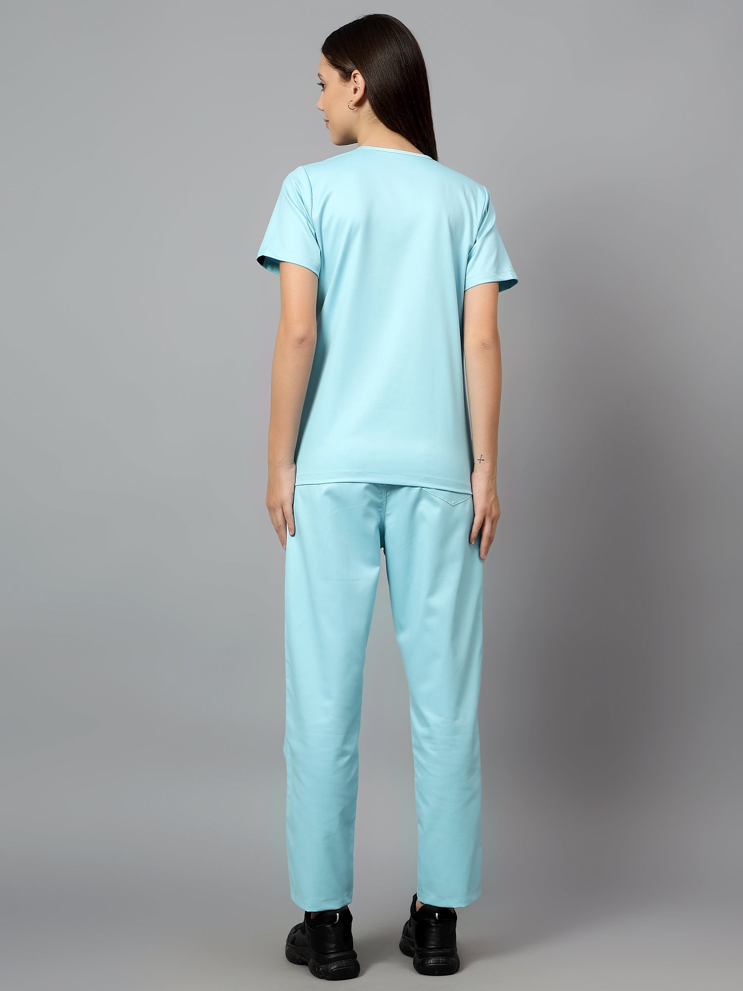 Stretchable (2Way) Female Aqua Blue V-Neck With Straight Pant Scrub Set