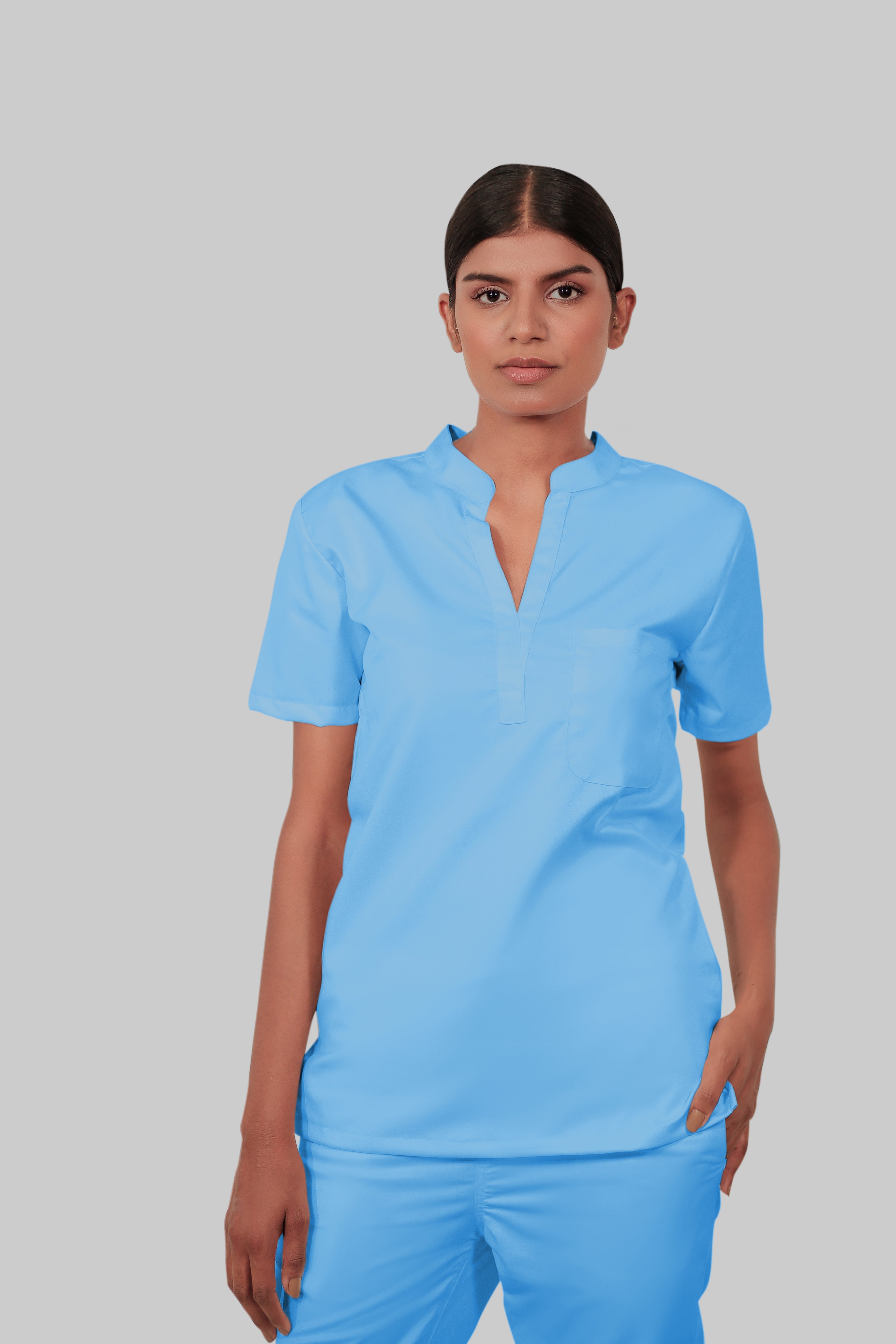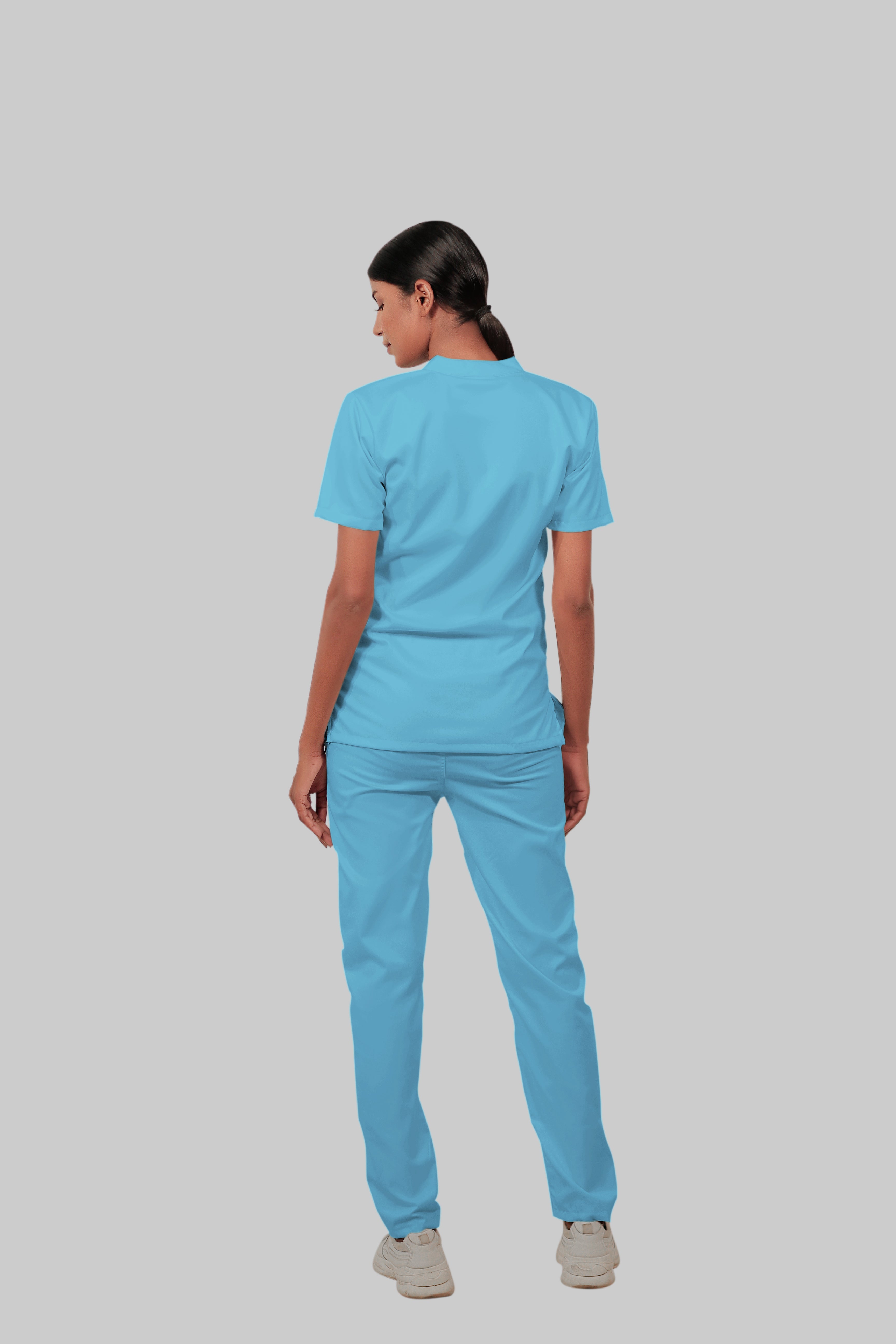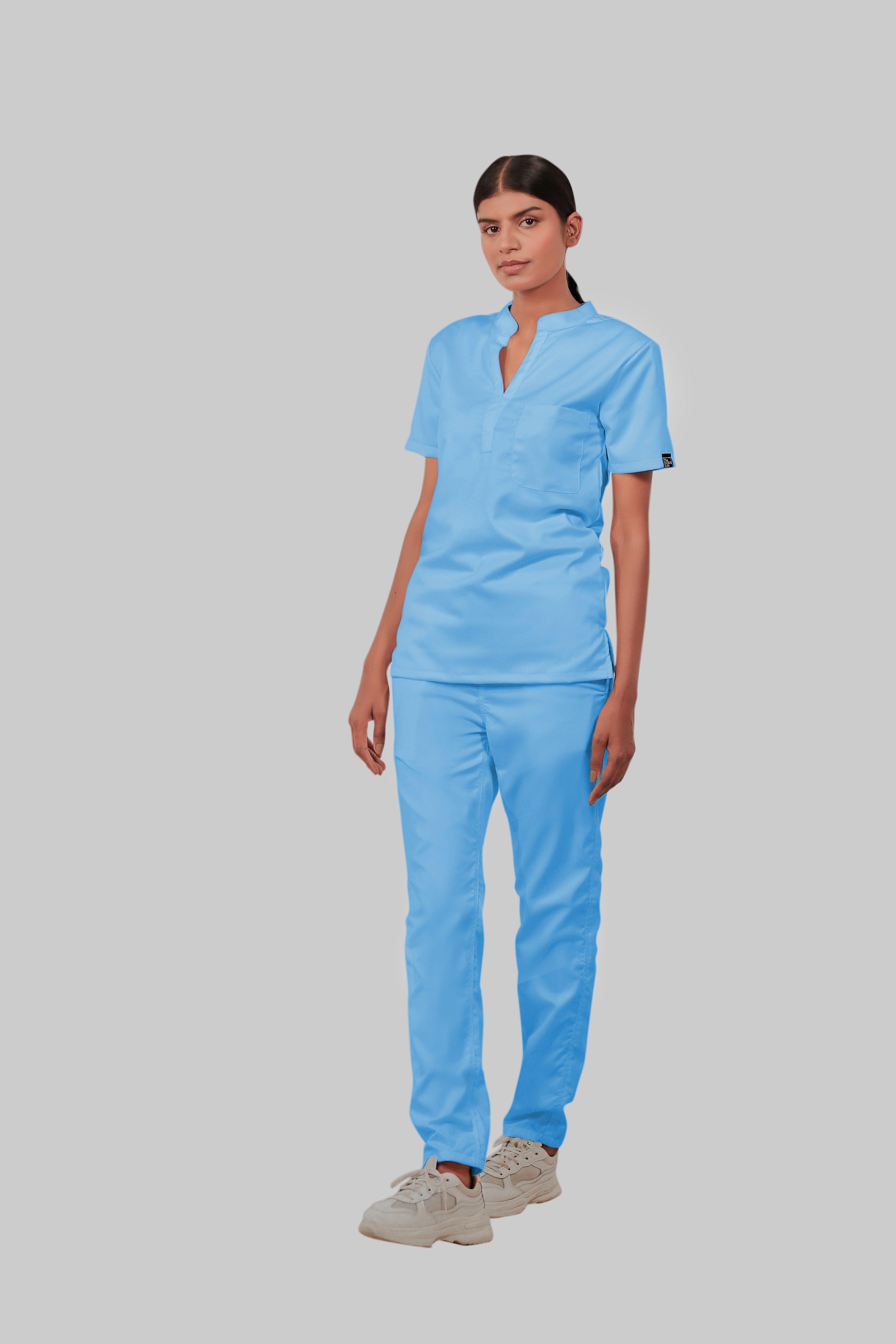 Stretchable (2Way) Female Light Blue Mandarin Neck With Straight Pant Scrub Set