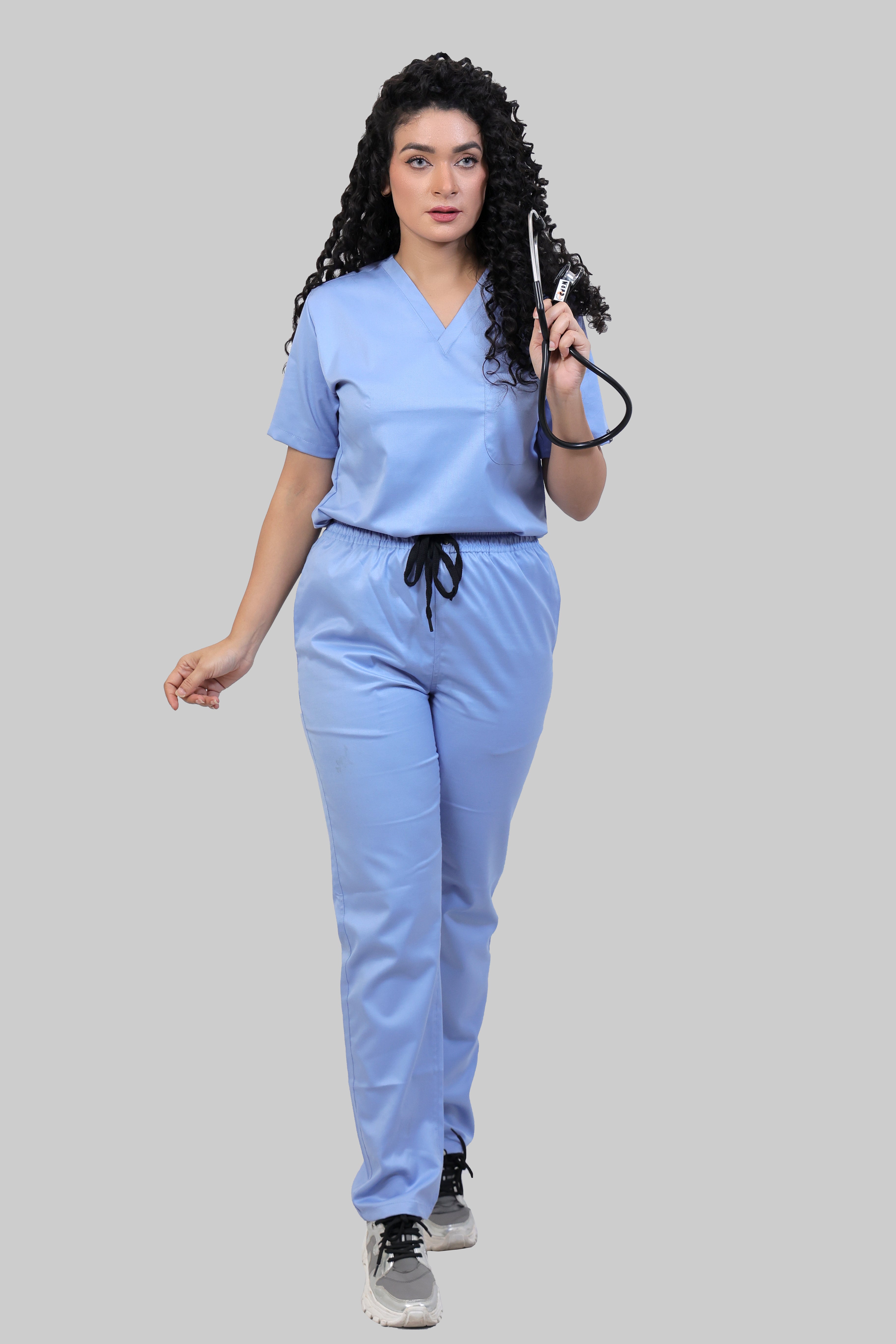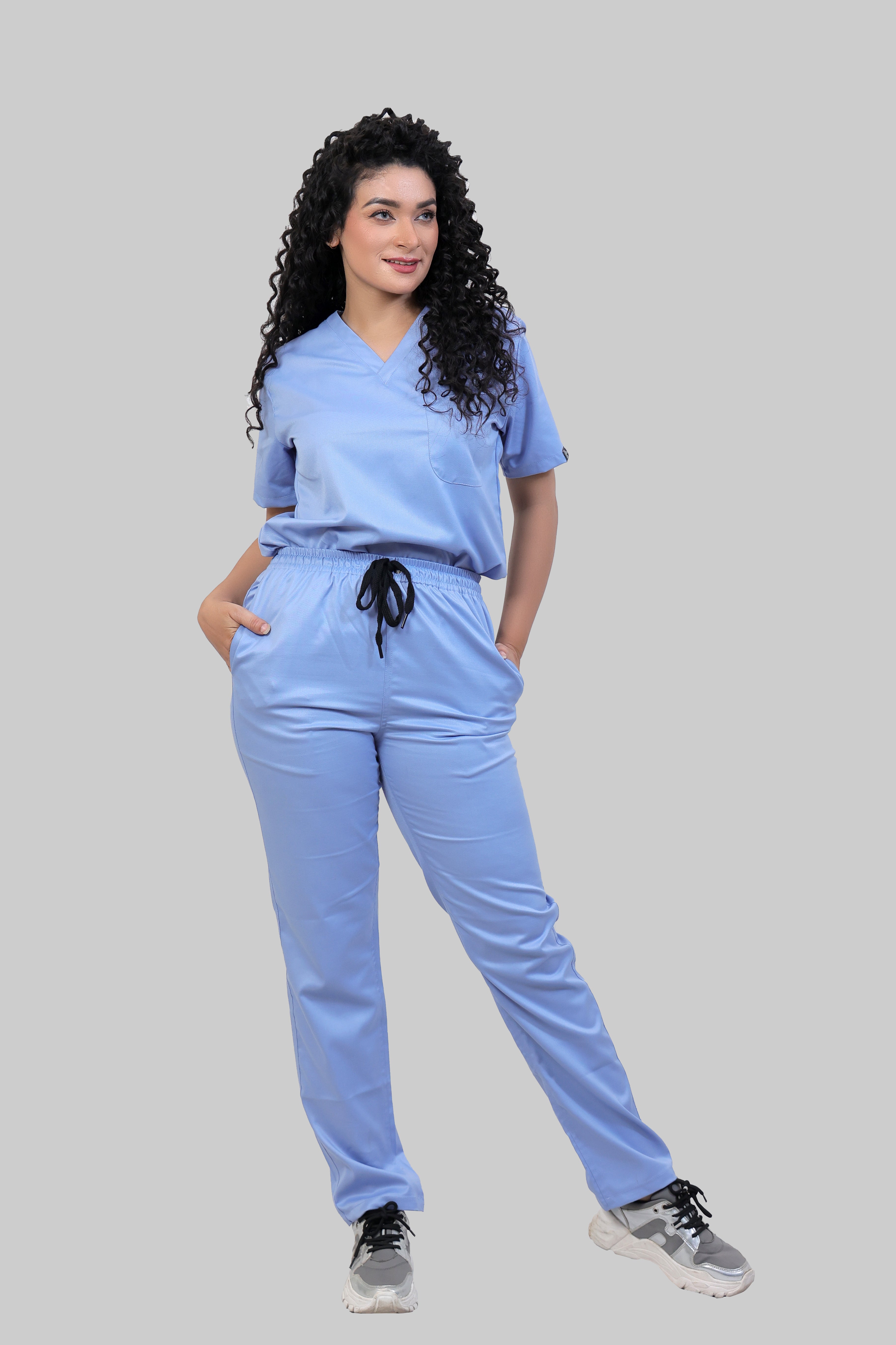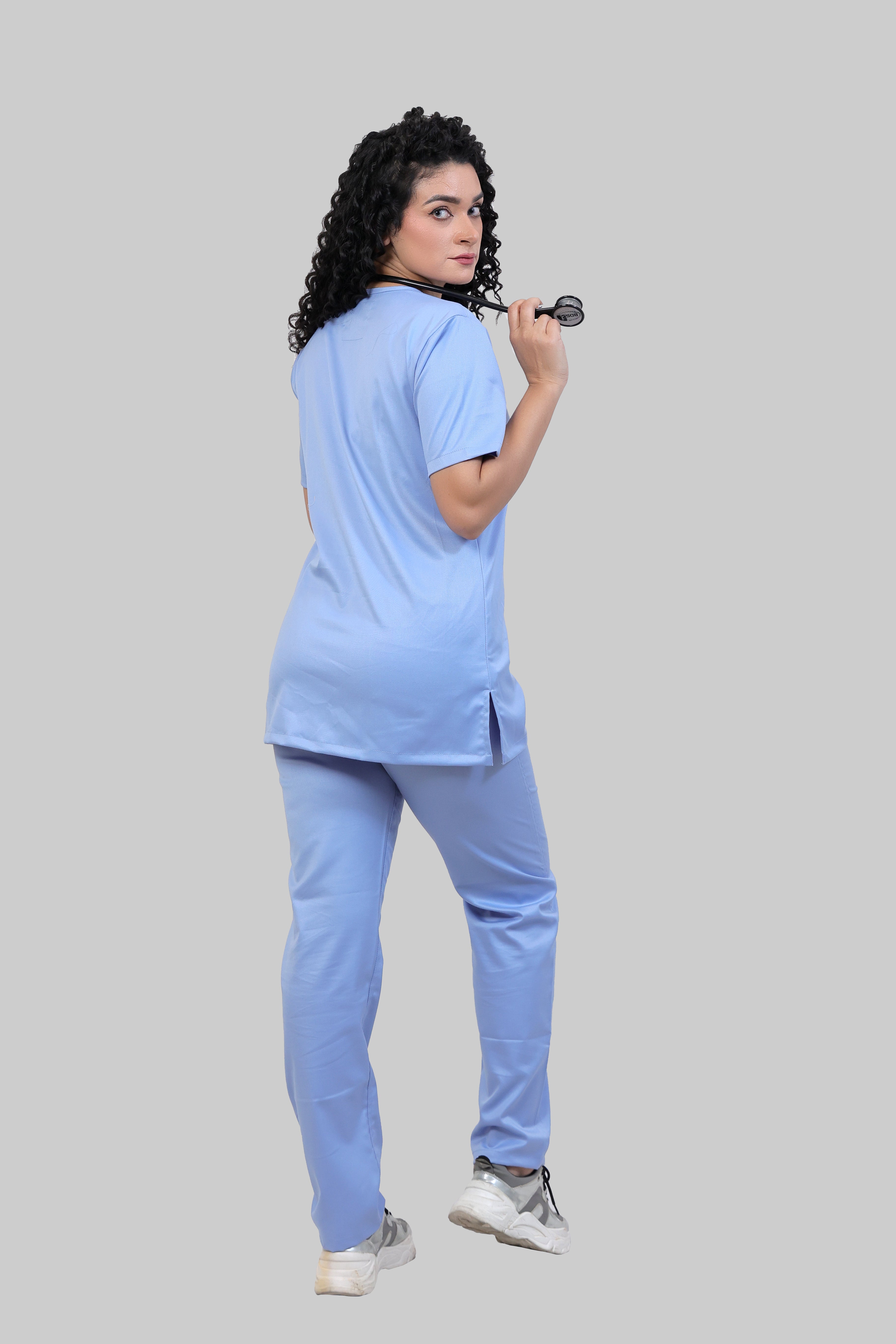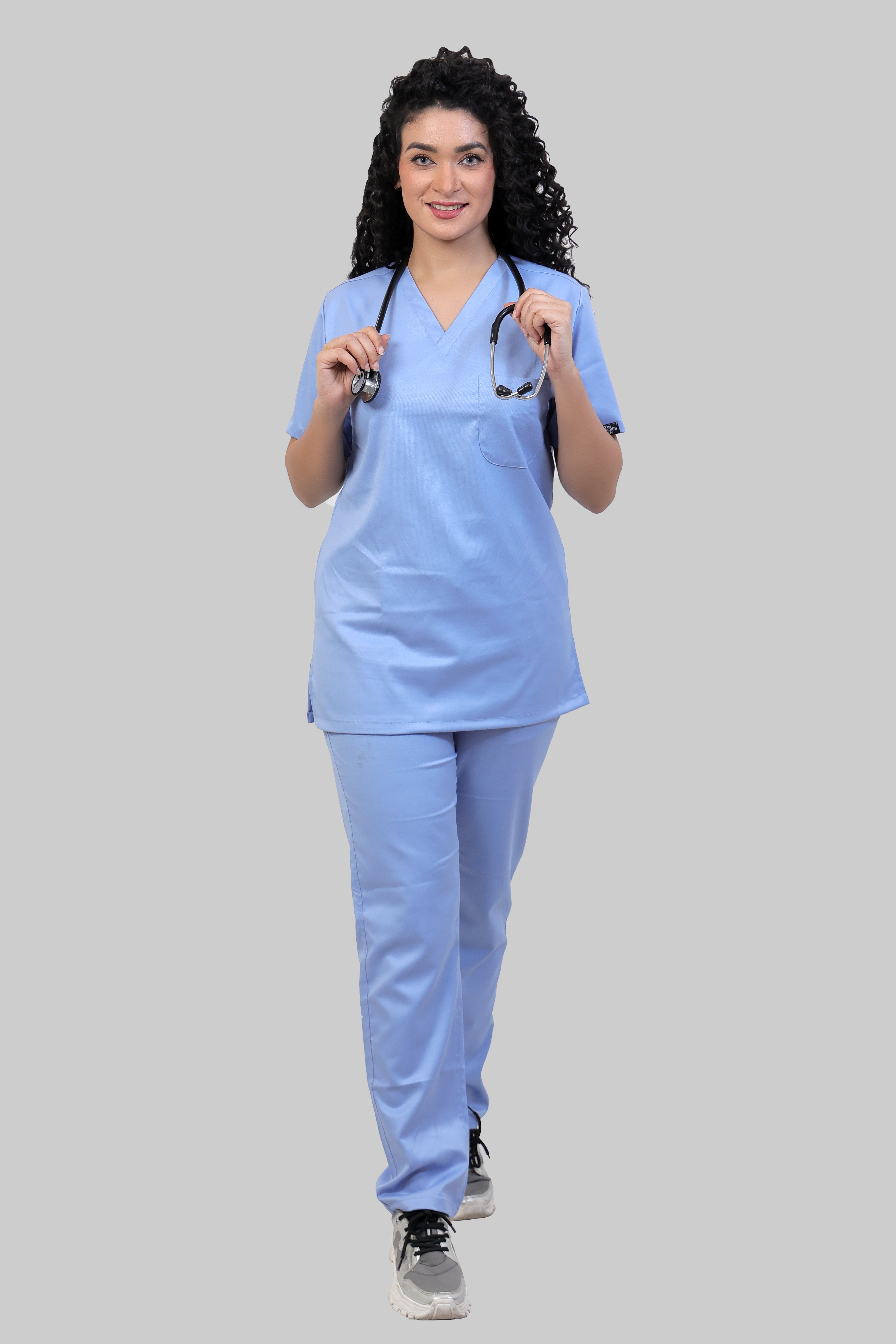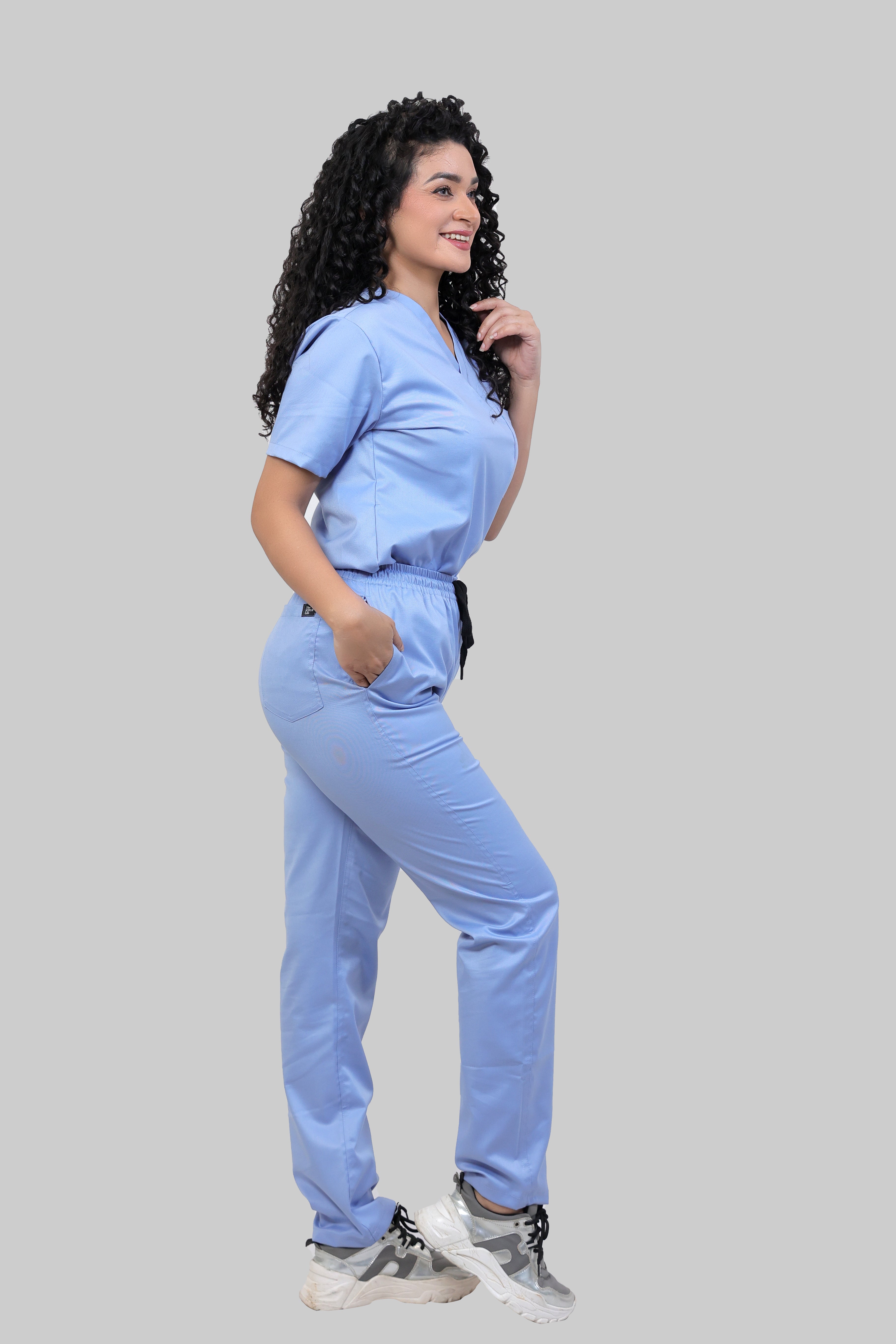Stretchable (2Way) Female Light Blue V-Neck With Straight Pant Scrub Set