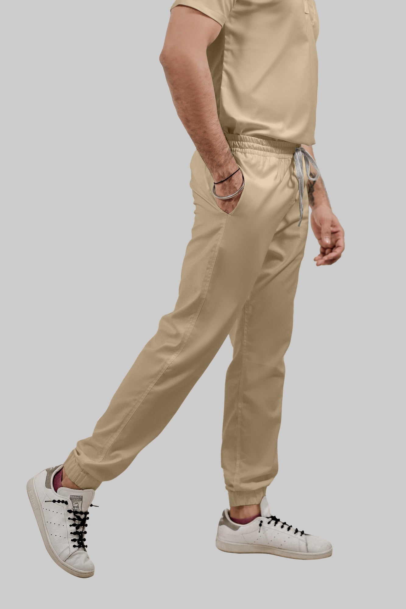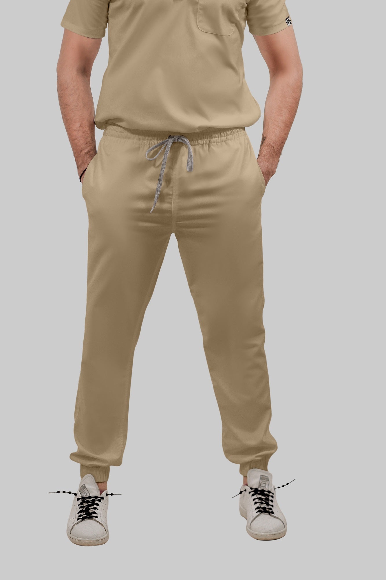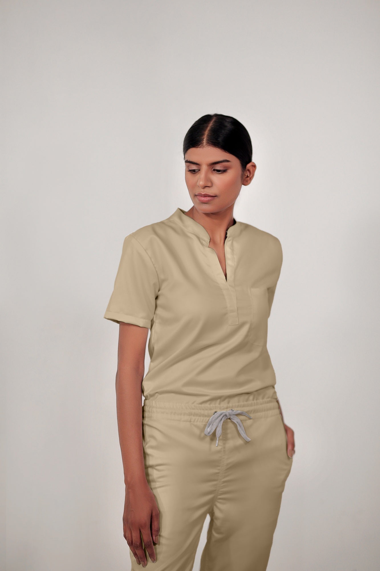 Stretchable (4Way) Female Beige Mandarin Neck With Jogger Scrub Scrub Set