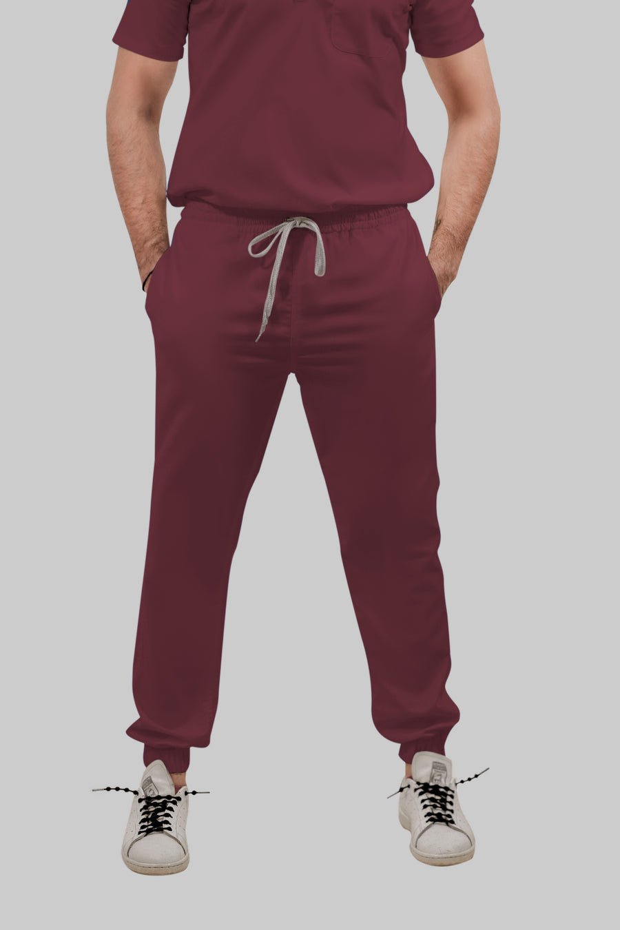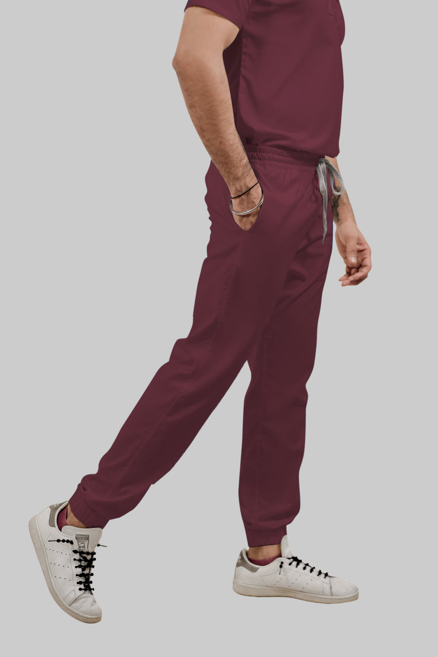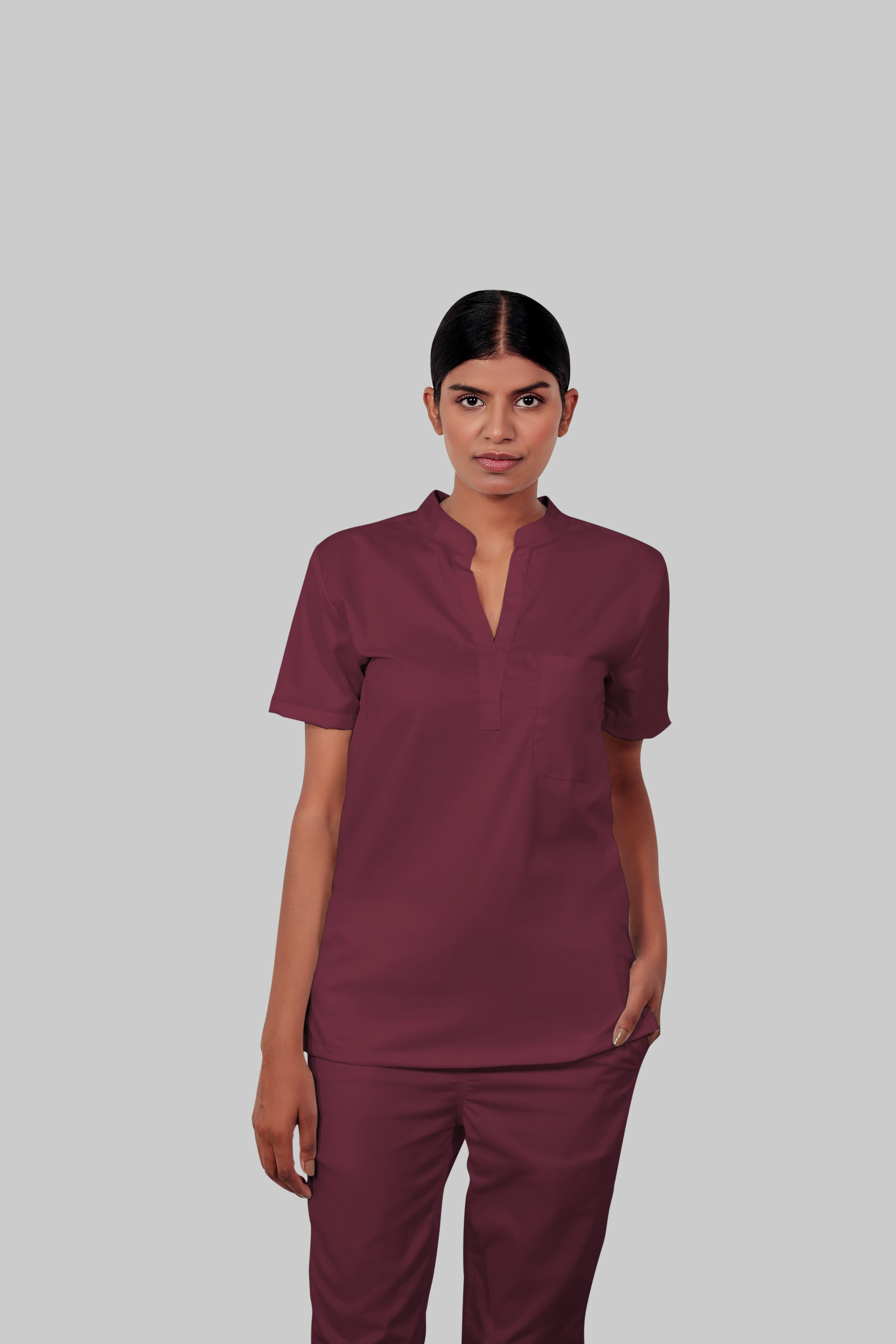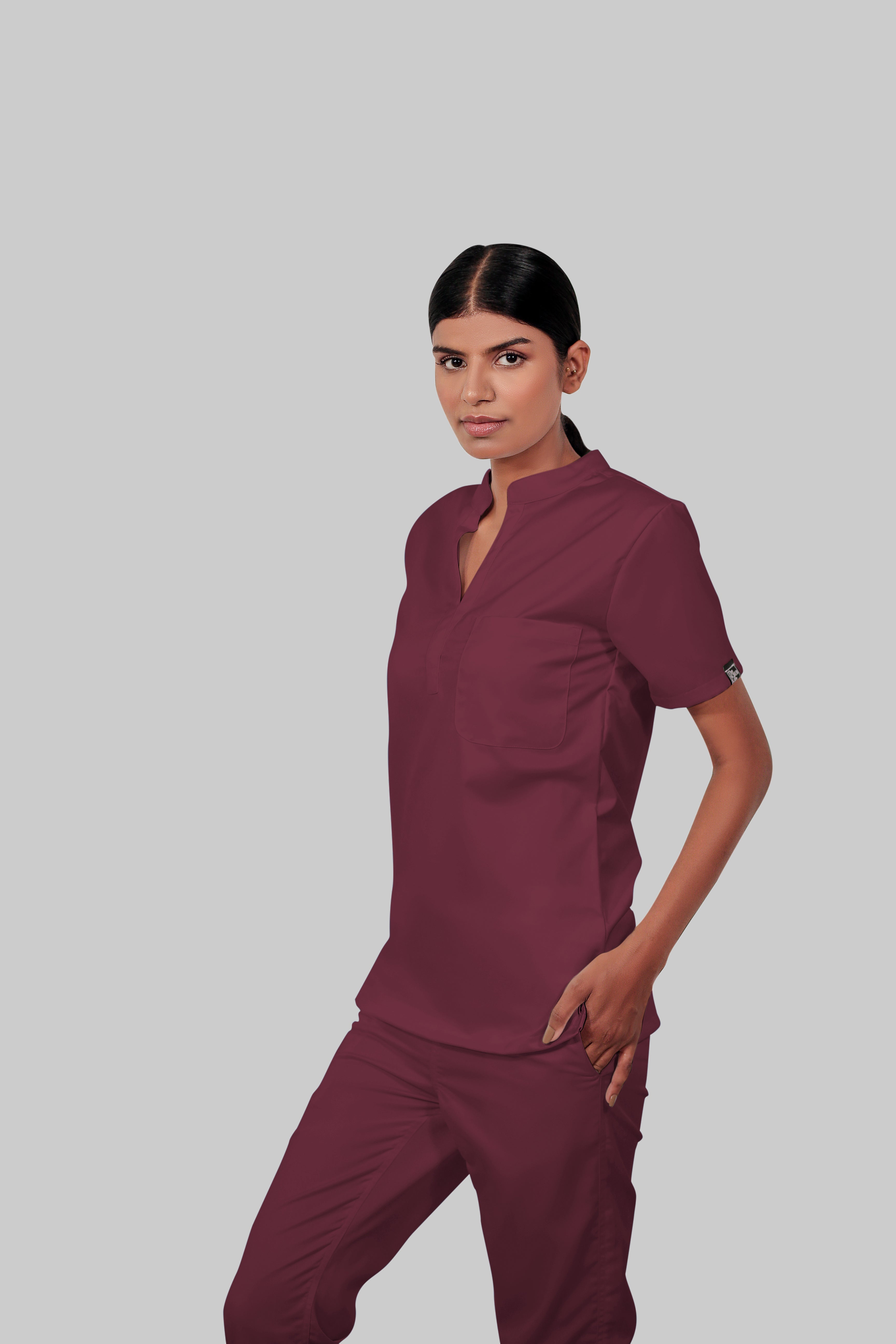 Stretchable (4Way) Female Burgundy Mandarin Neck With Jogger Scrub Set