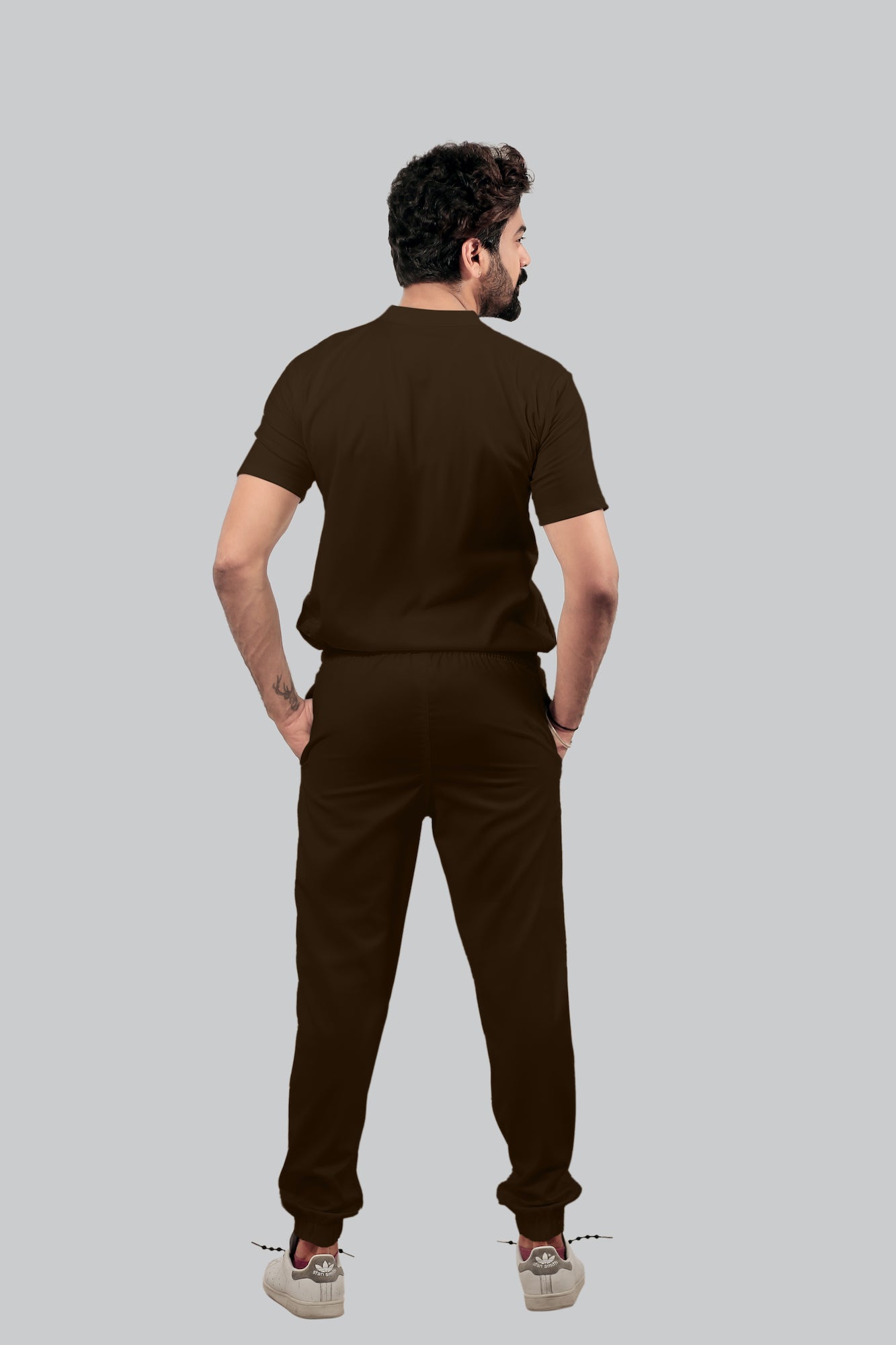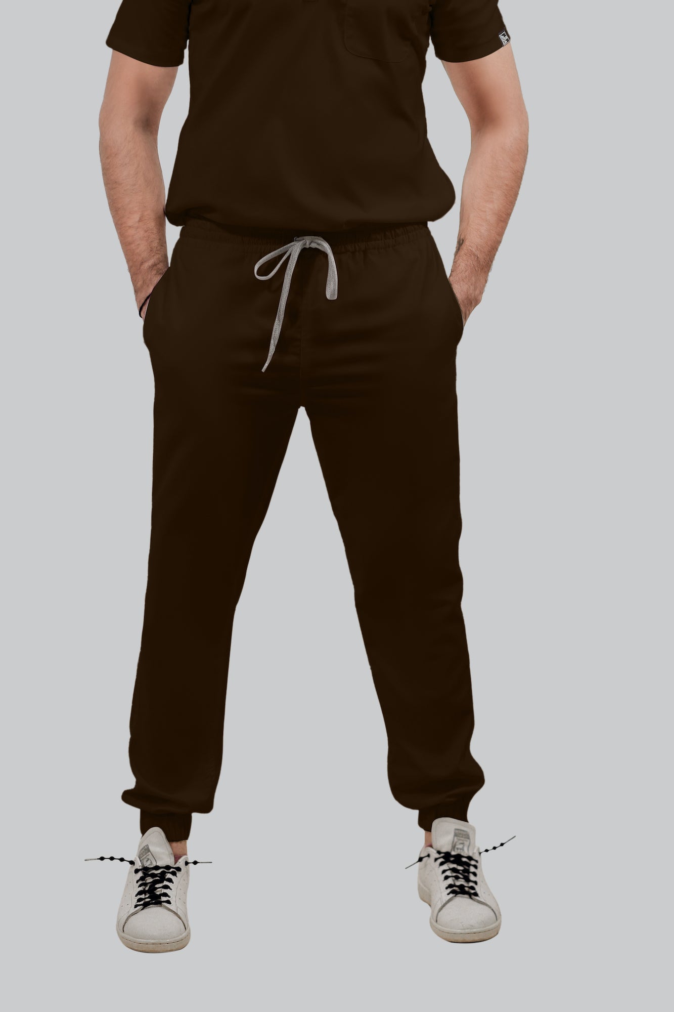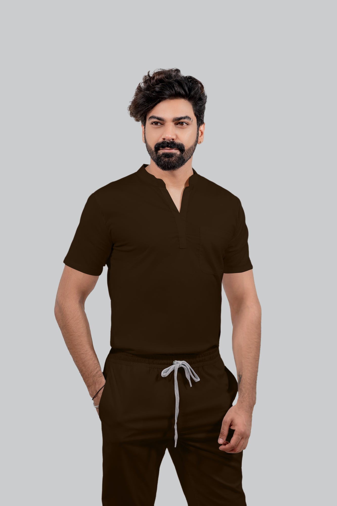 Stretchable (4Way) Male Brown Mandarin Neck with Jogger Scrub Set