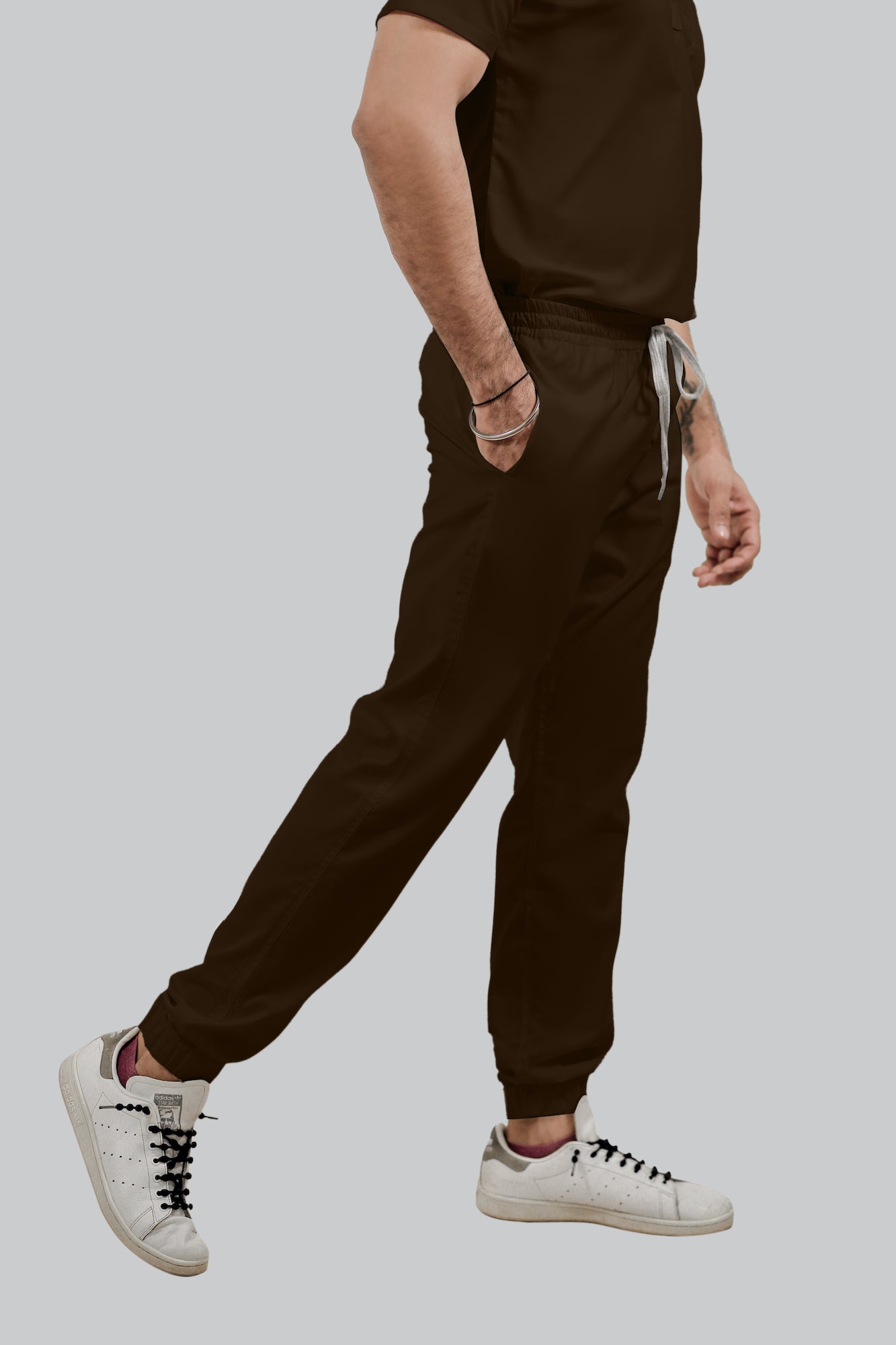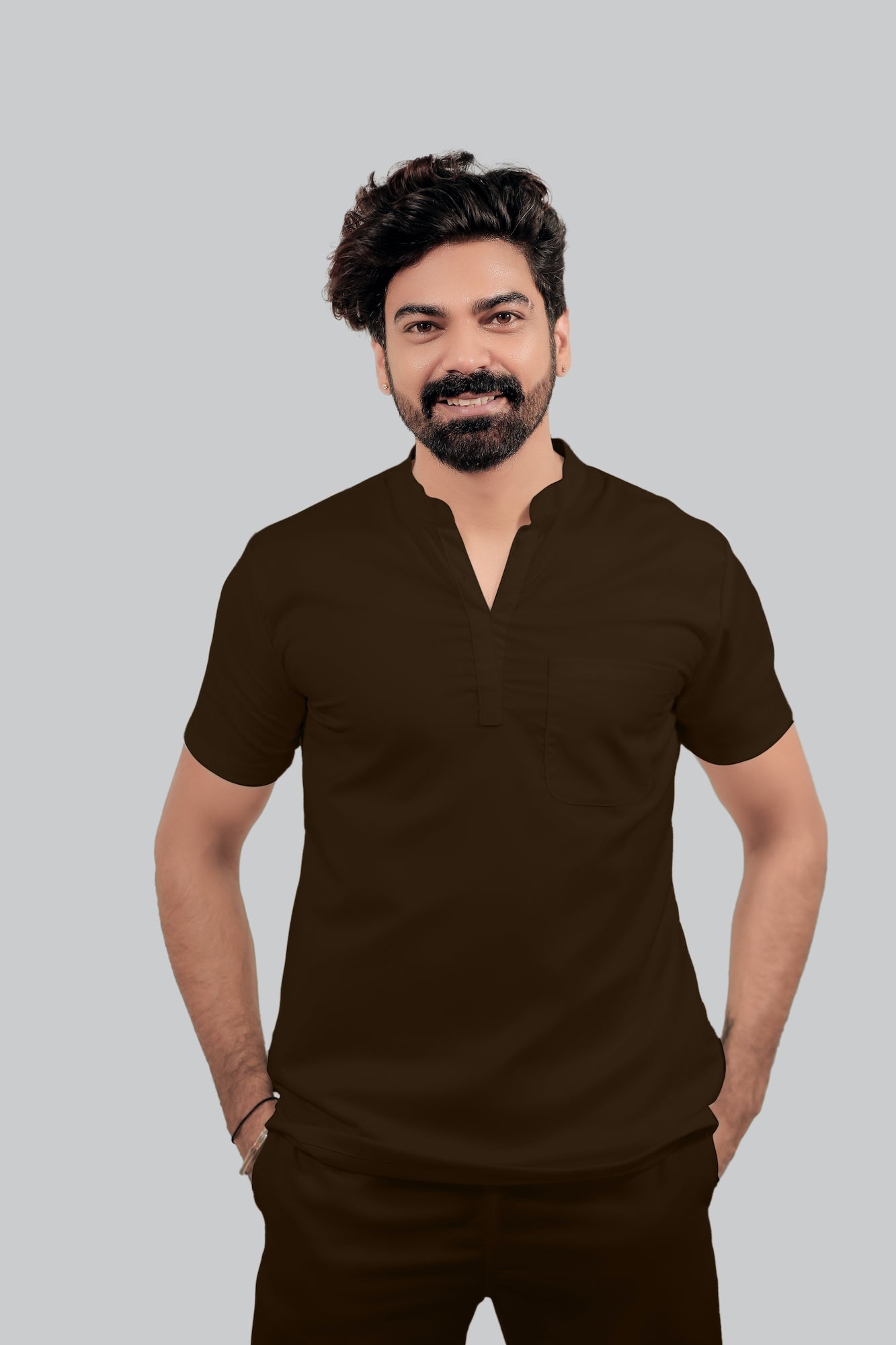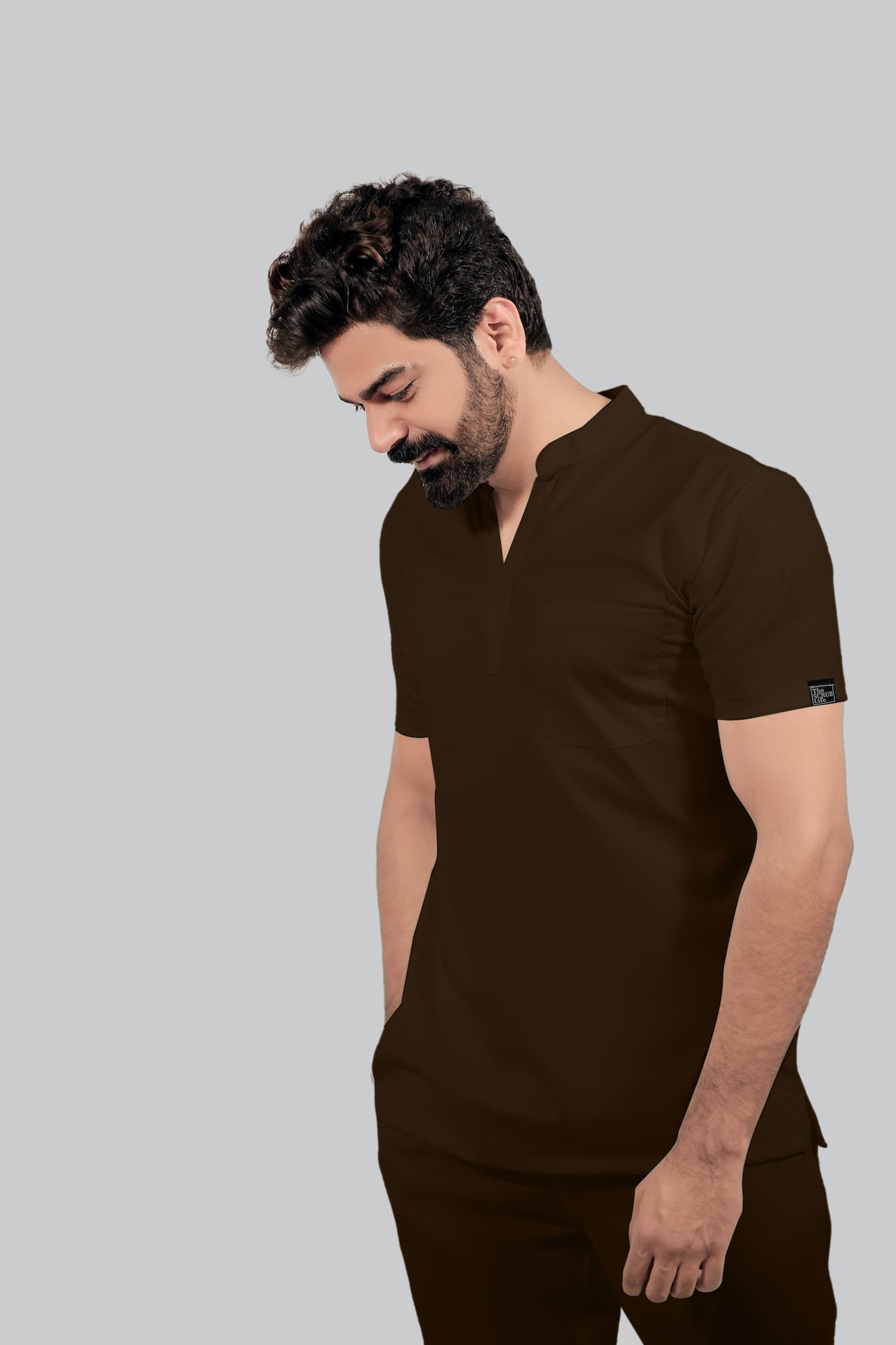 Stretchable (4Way) Male Brown Mandarin Neck with Jogger Scrub Set