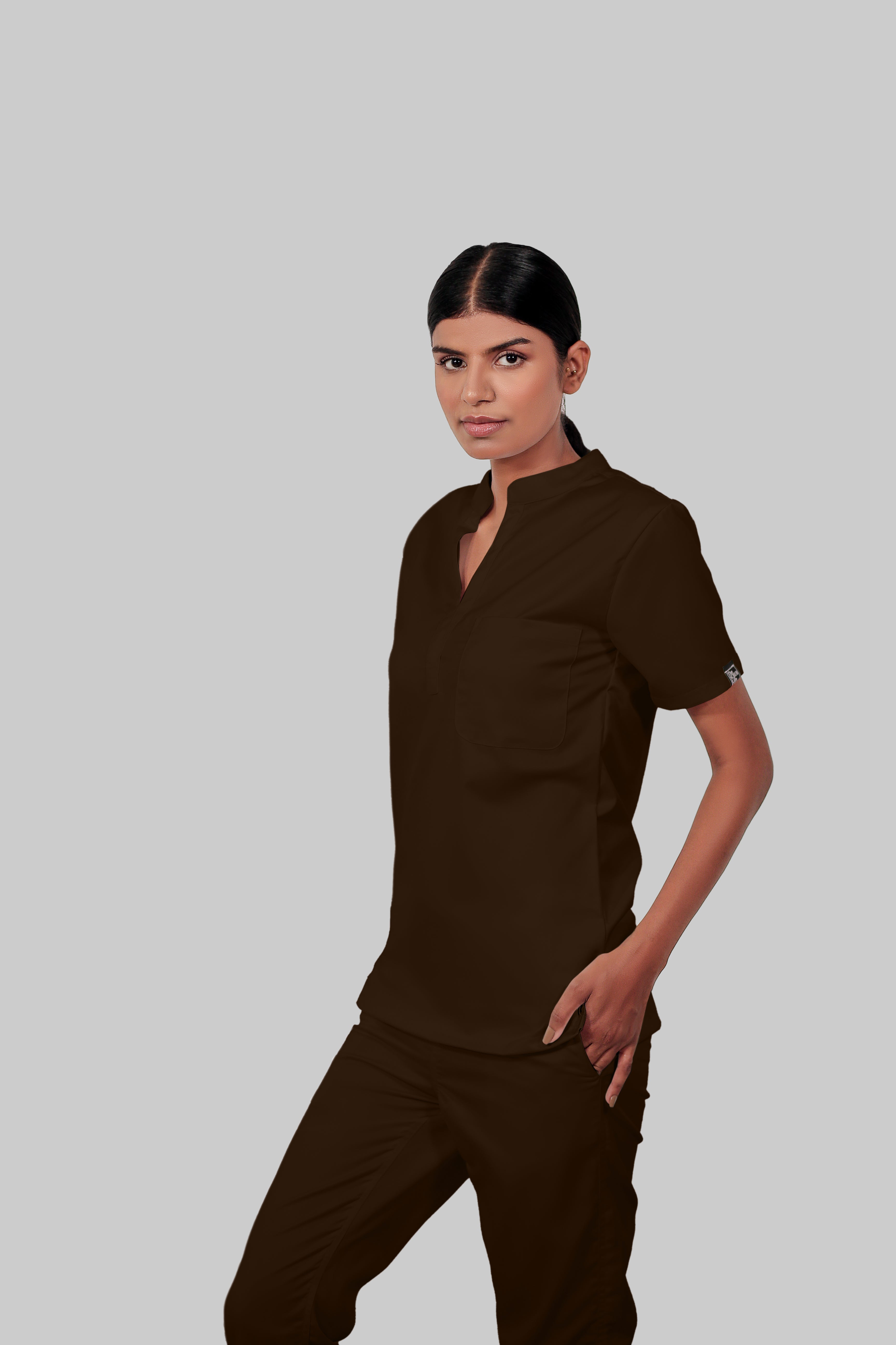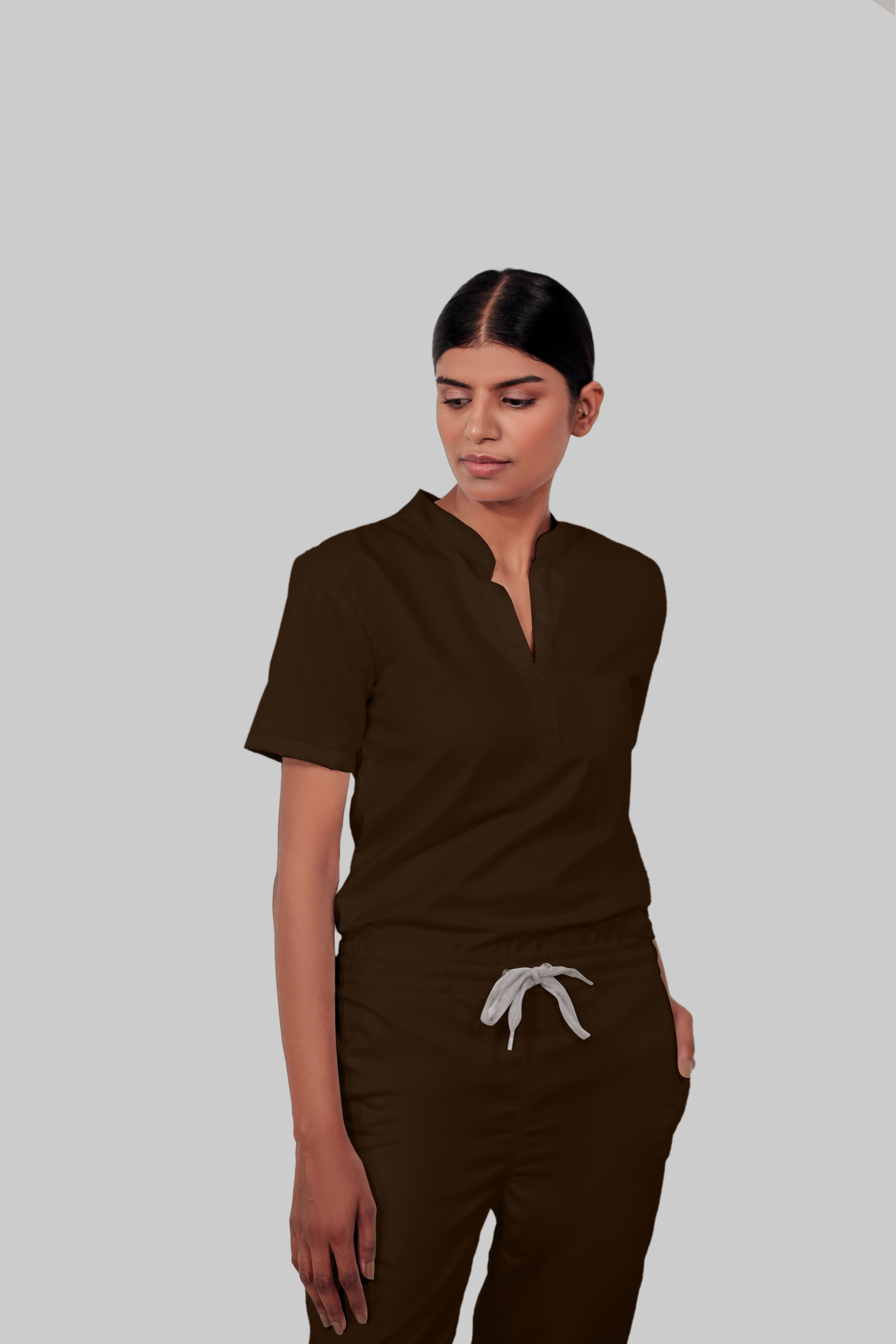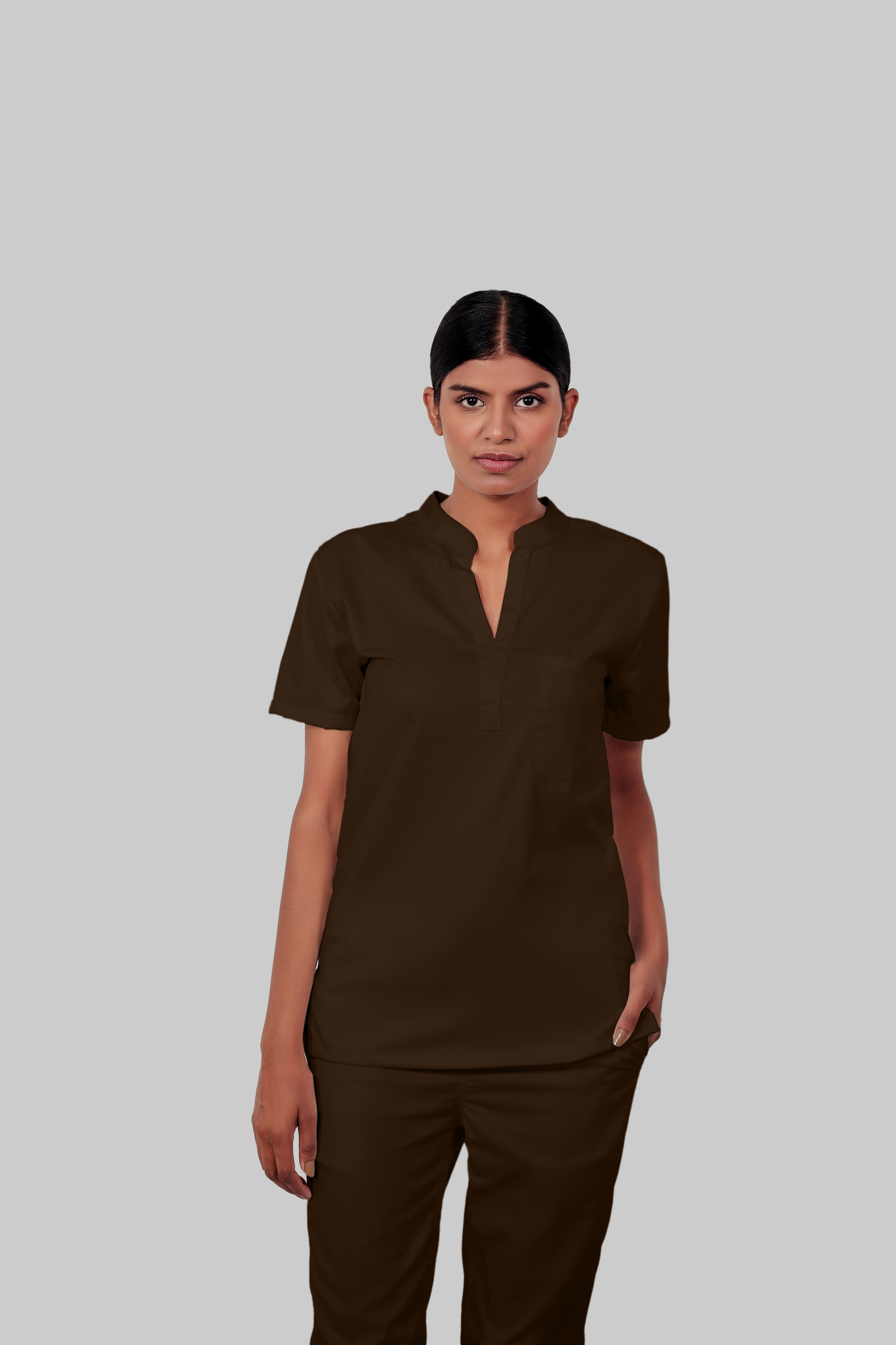 Stretchable (4Way) Female Brown Mandarin Neck Scrub Top