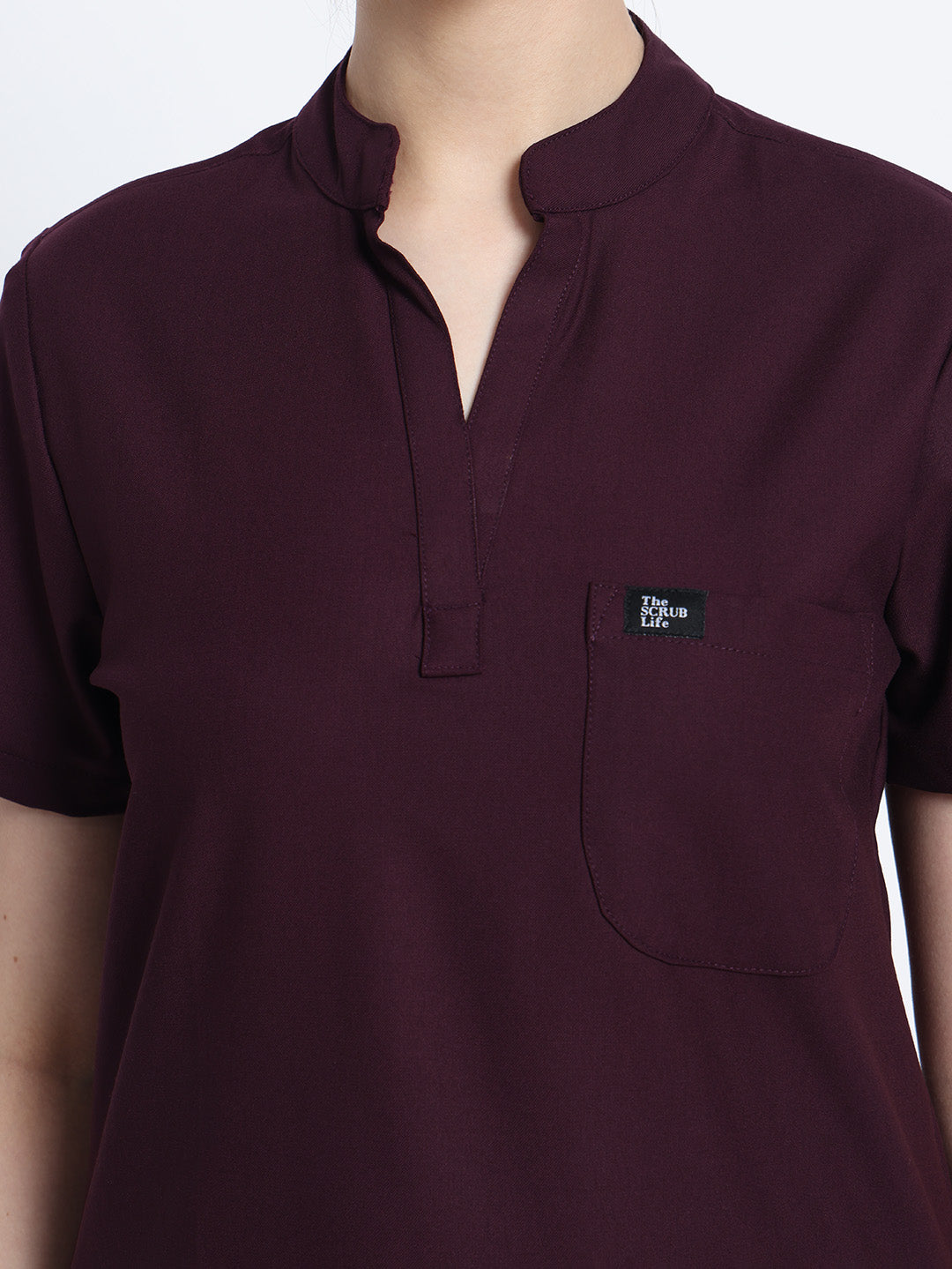 Stretchable (4Way) Female Wine Mandarin Neck Scrub Top