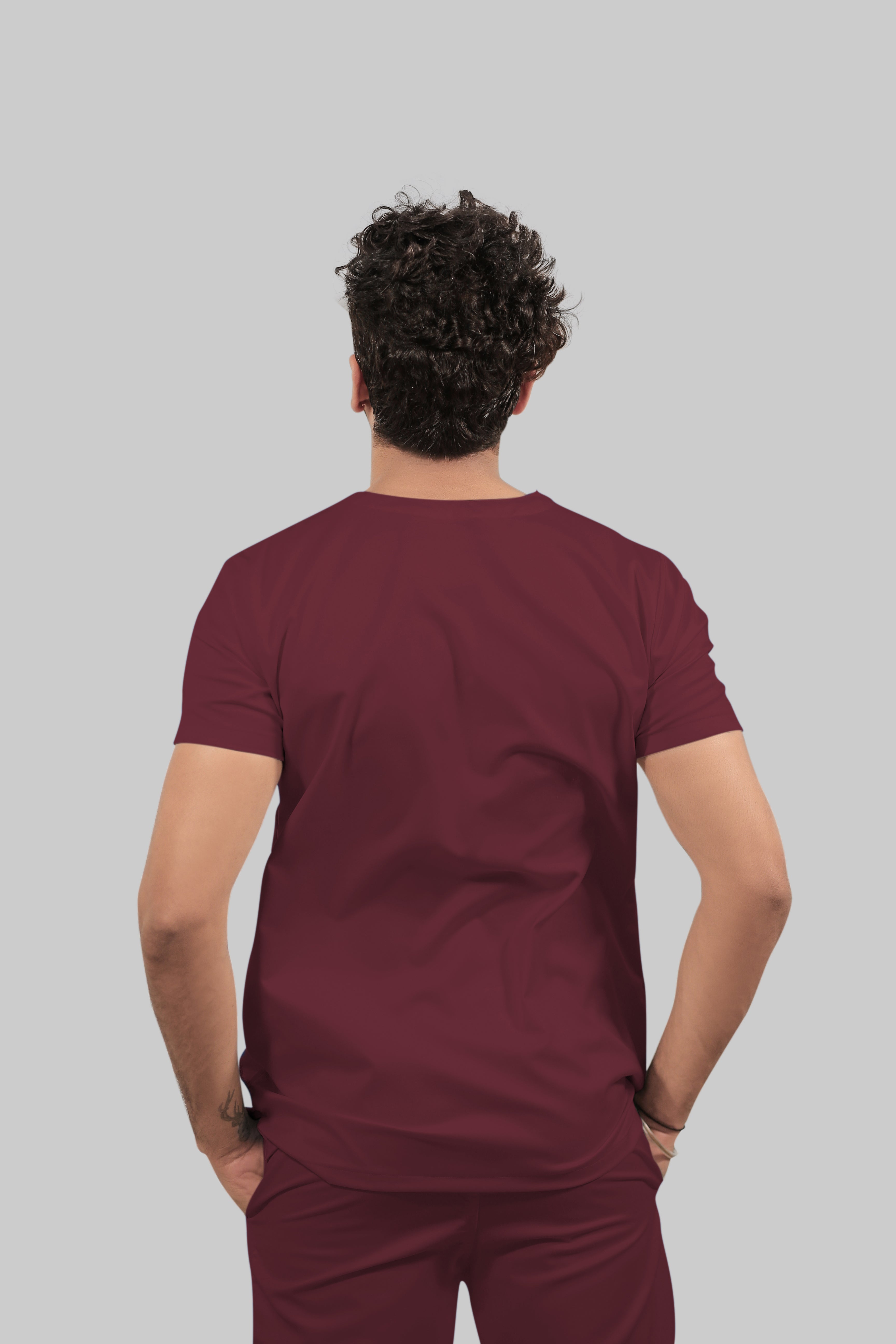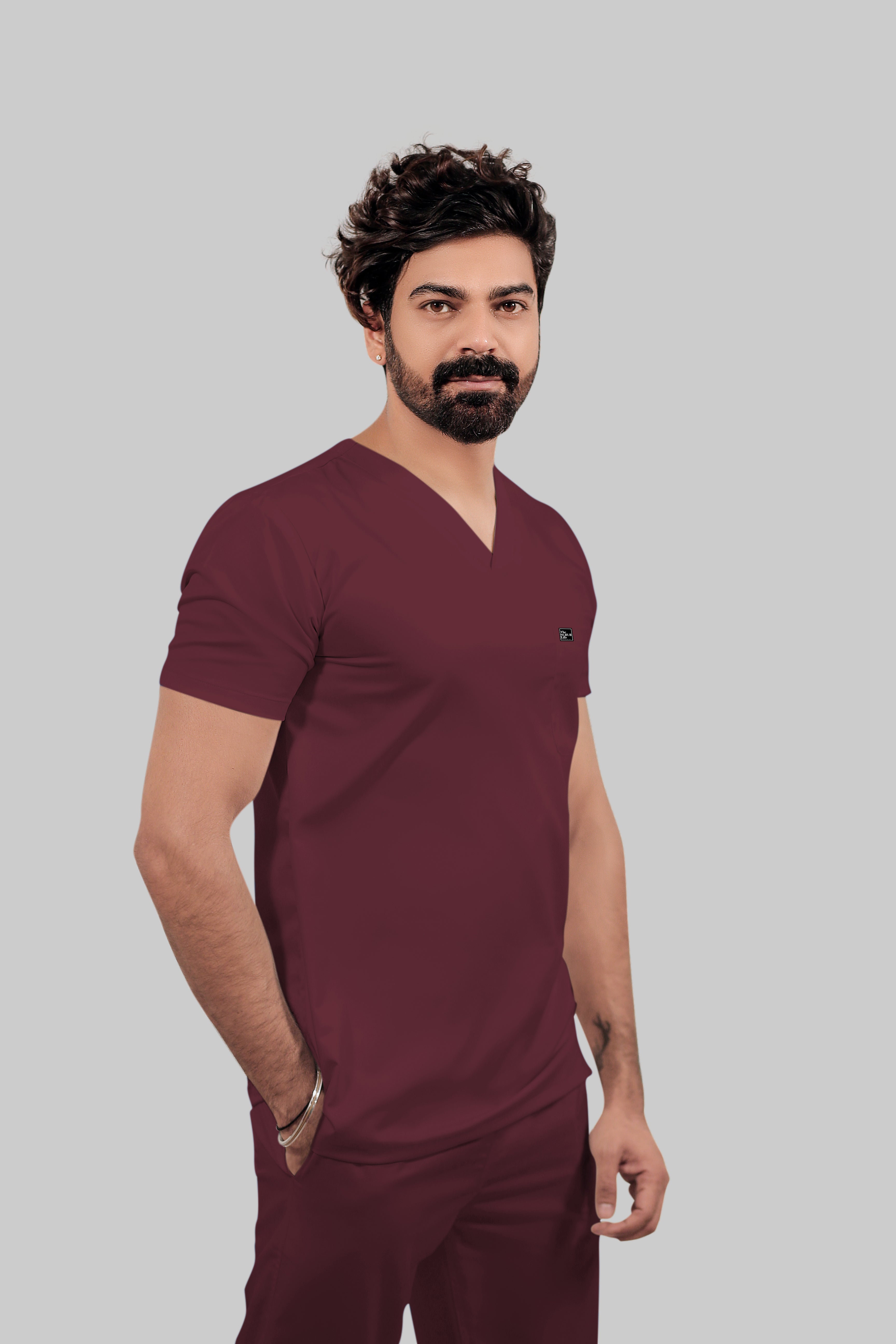 Stretchable (4Way) Male Burgundy V-Neck With Straight Pant Scrub Set