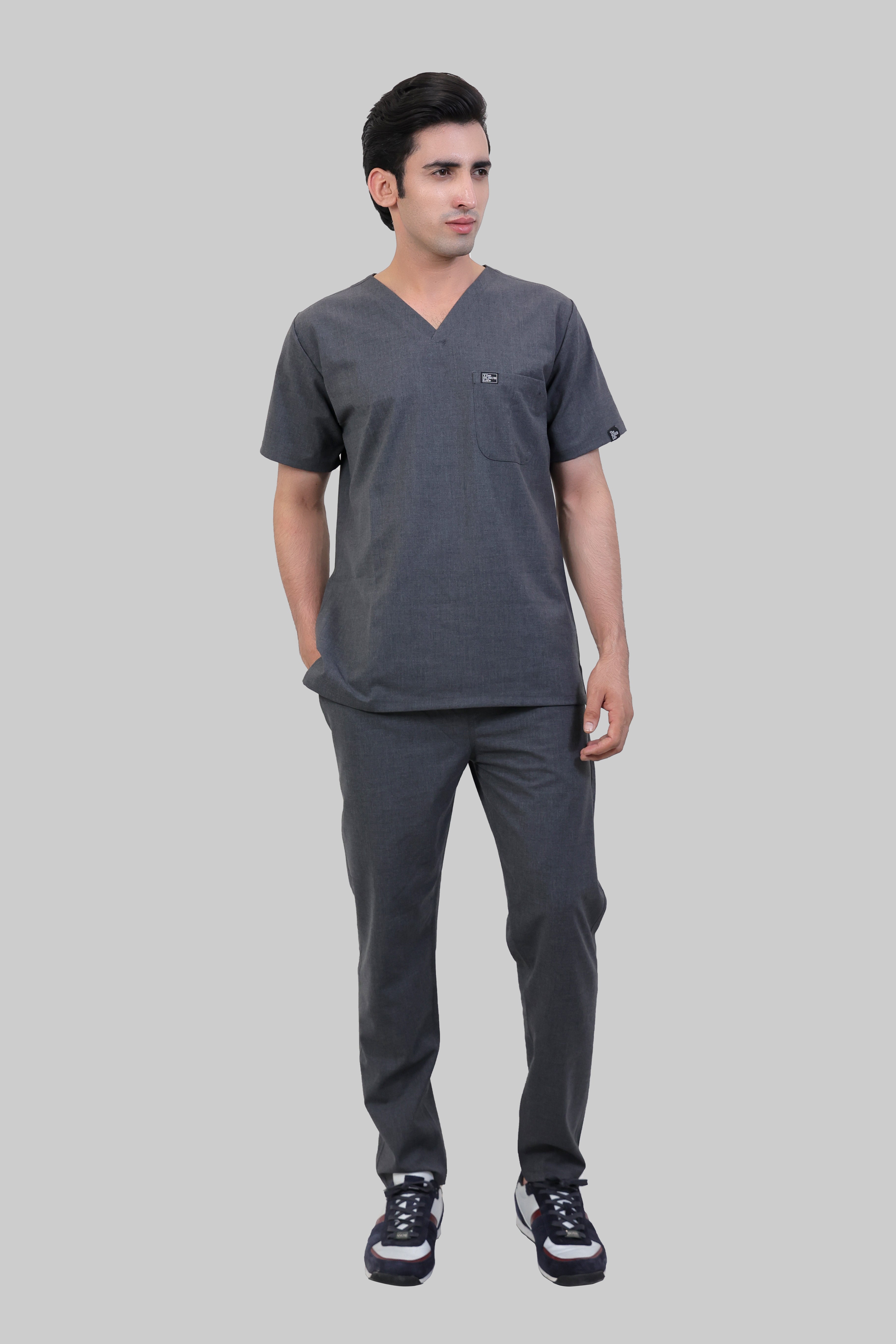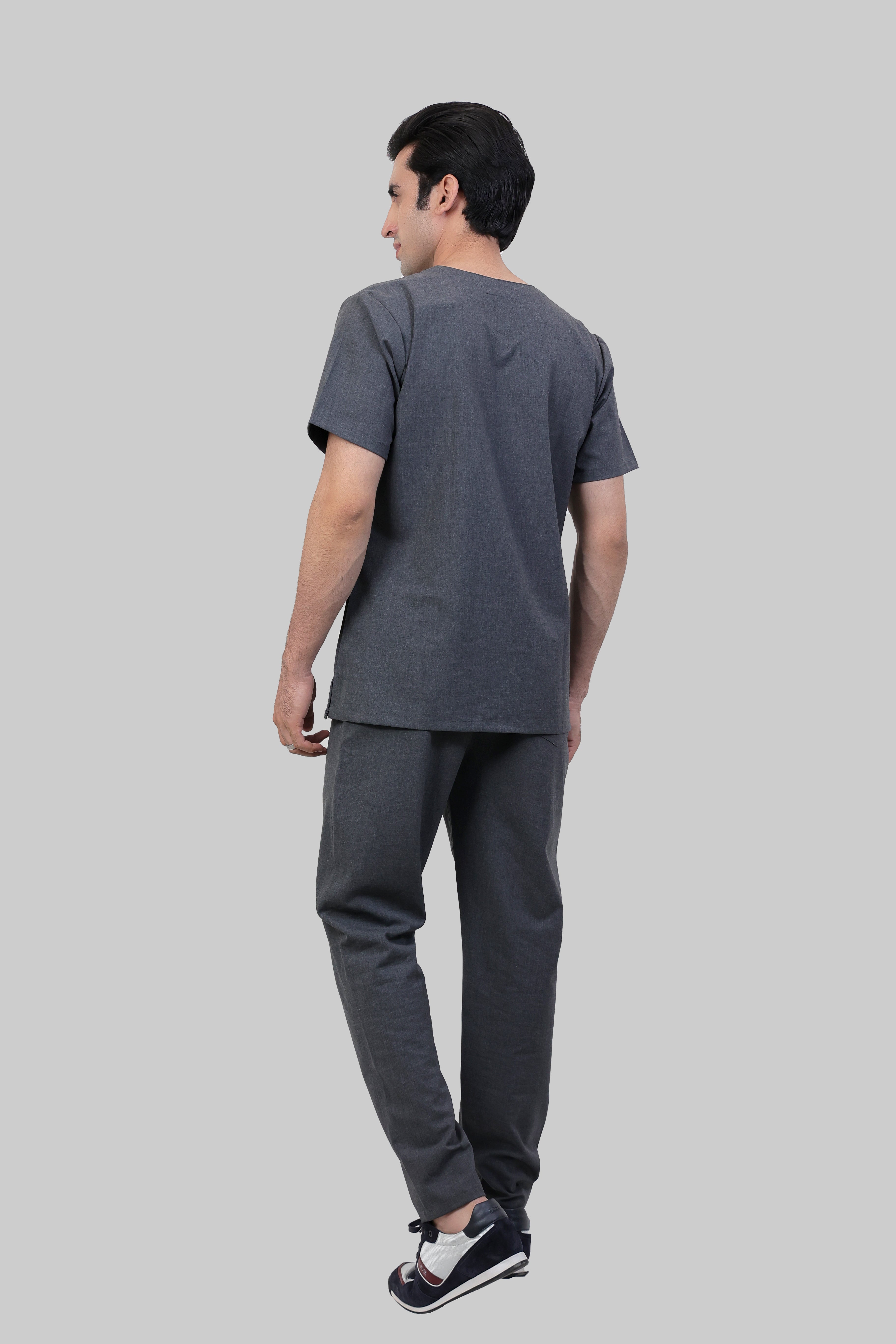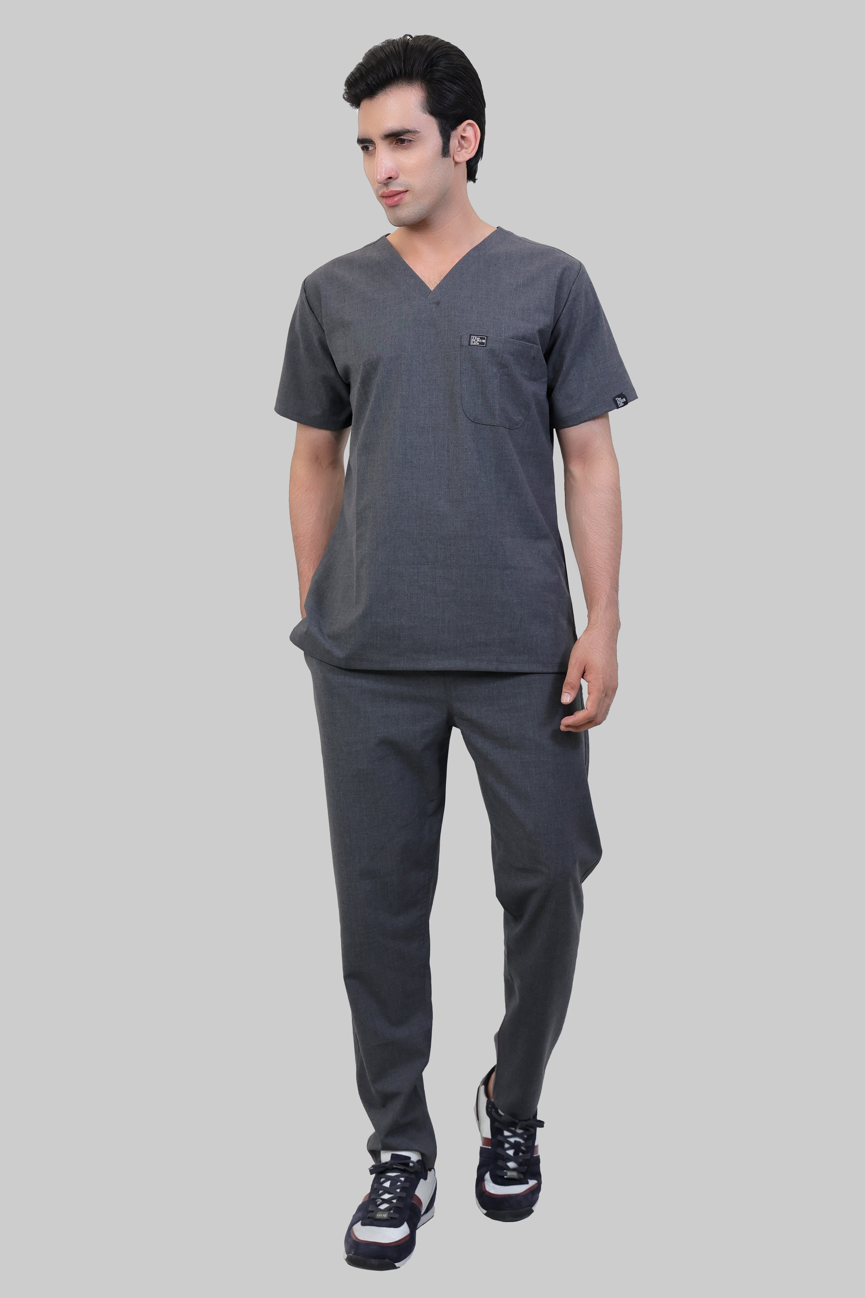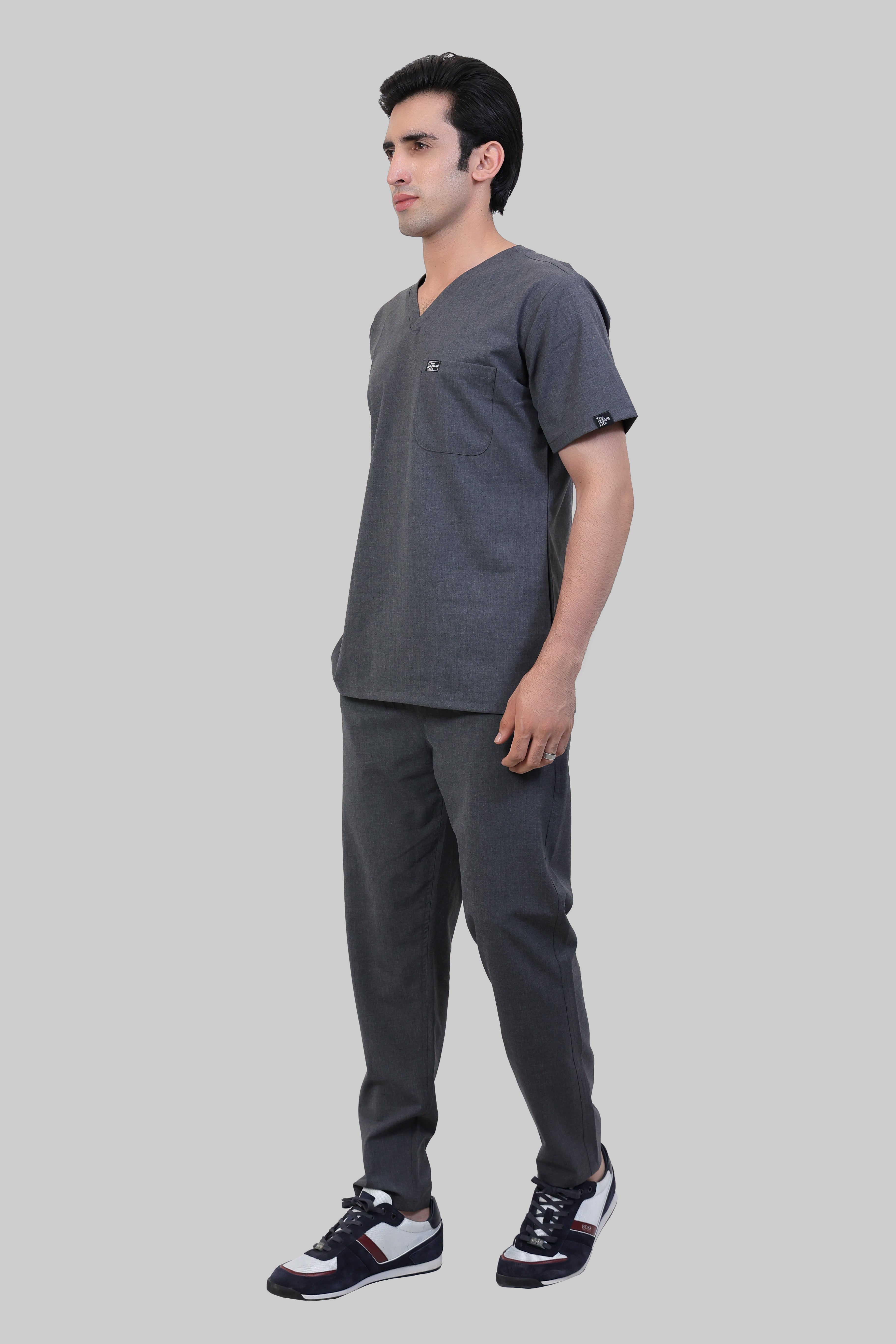 Stretchable (4Way) Male Grey V-Neck With Straight Pant Scrub Set