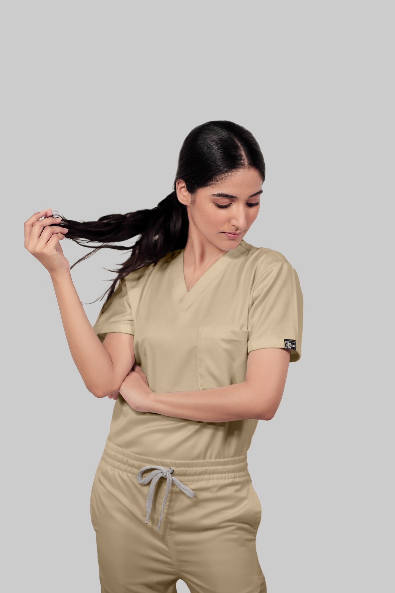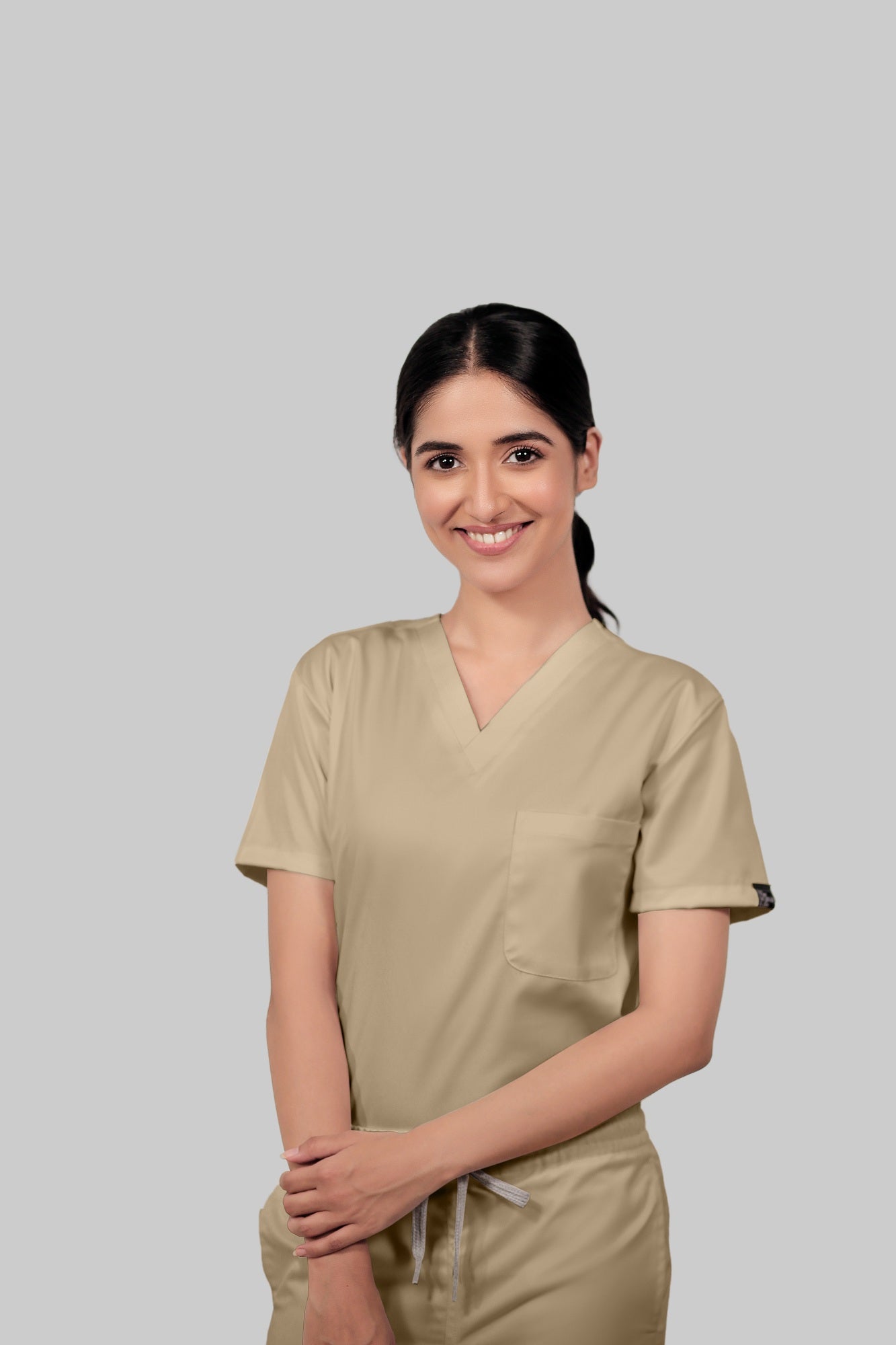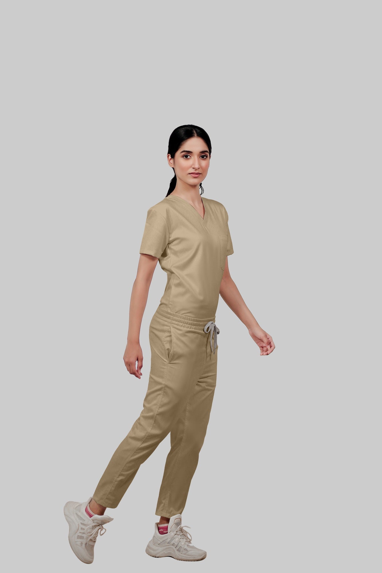 Stretchable (4Way) Female Beige V-Neck With Straight Pant Scrub Set