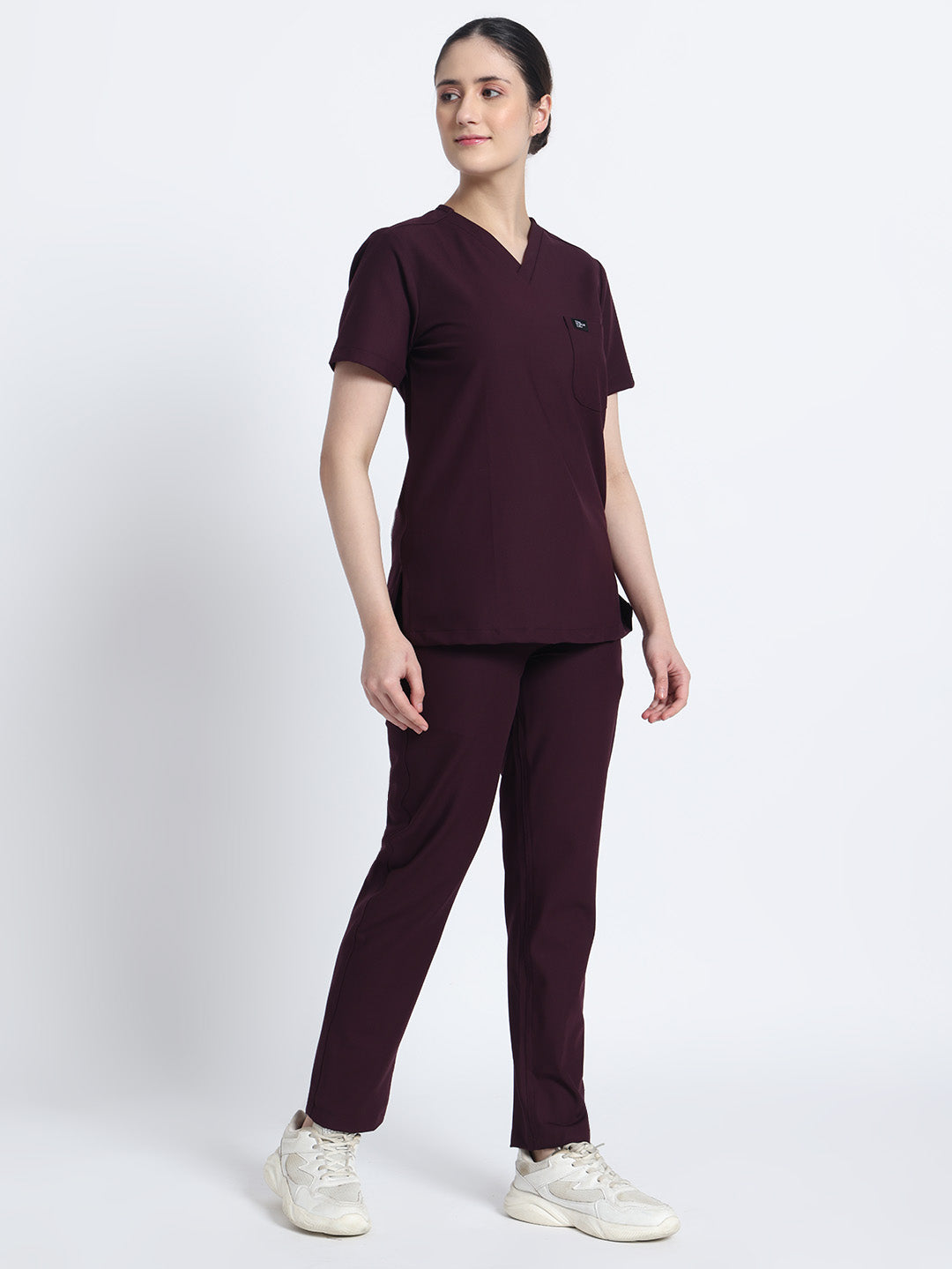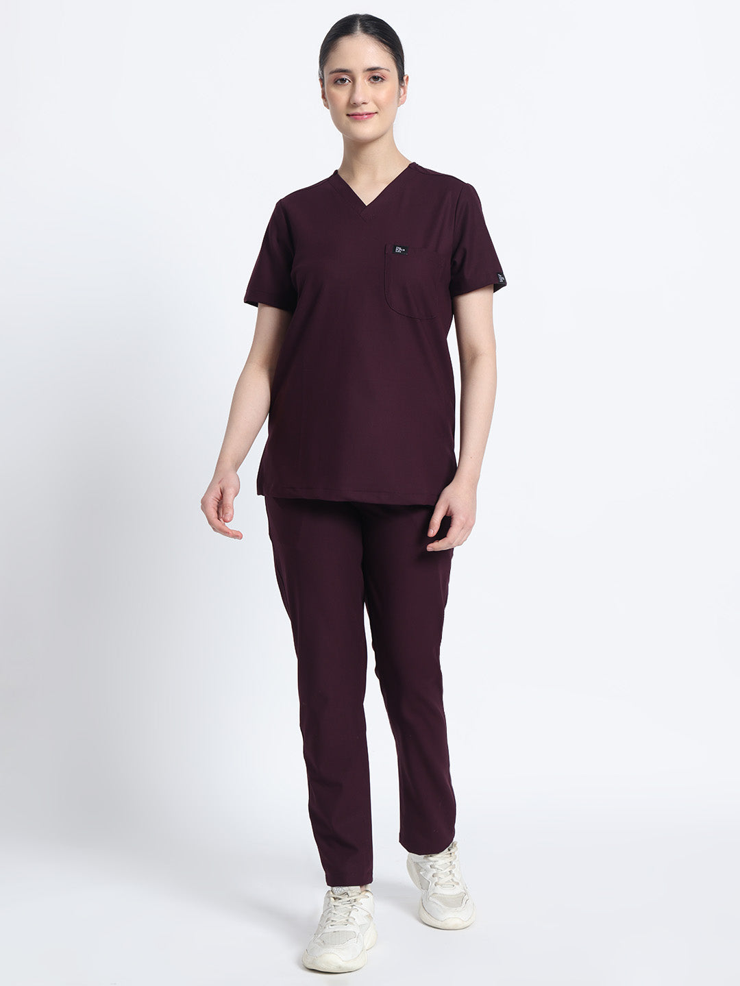 Stretchable (4Way) Female Wine V-Neck With Straight Pant Scrub Set