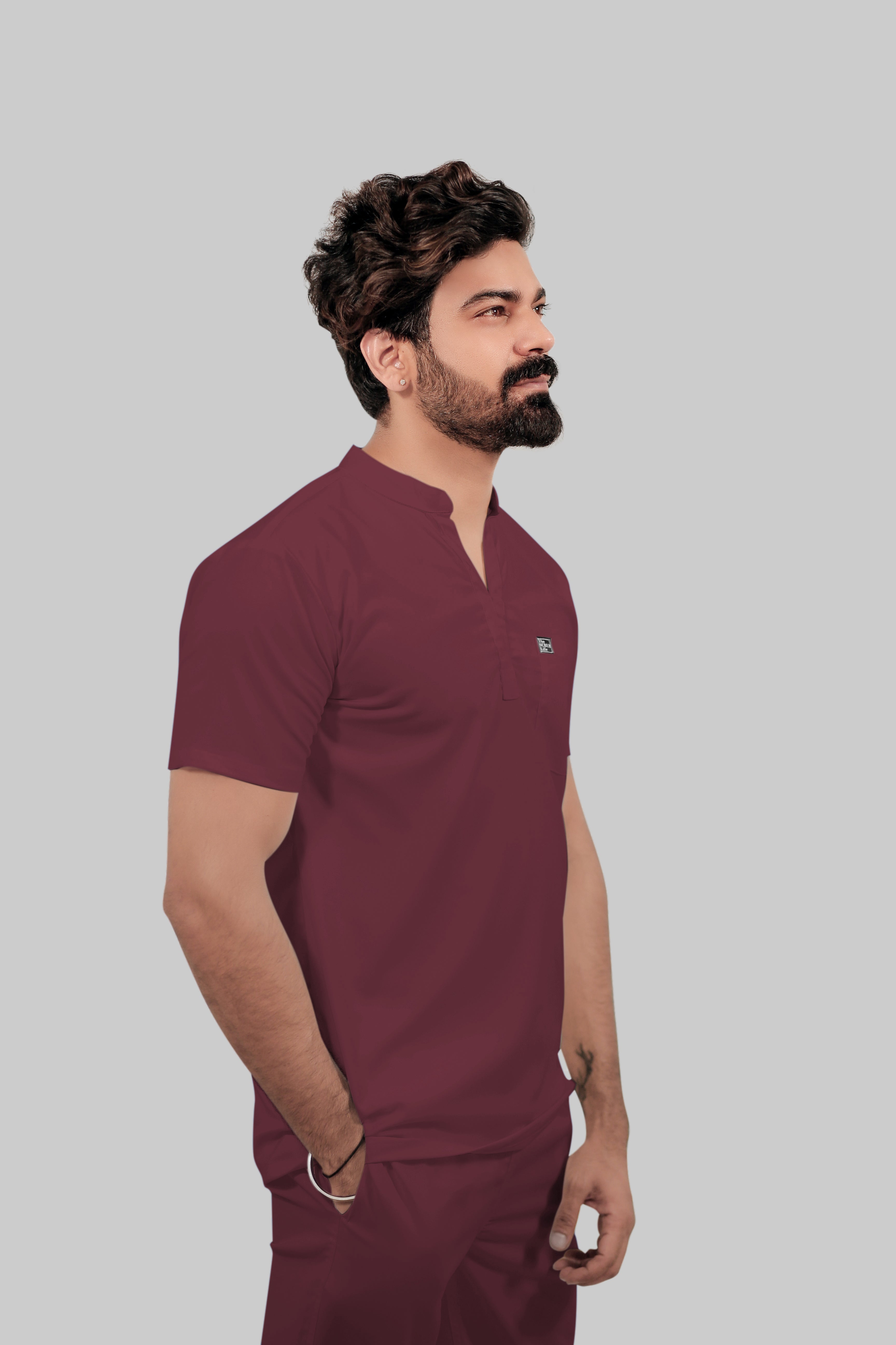 Stretchable (4Way) Male Mandarin Neck Burgundy Scrub Top