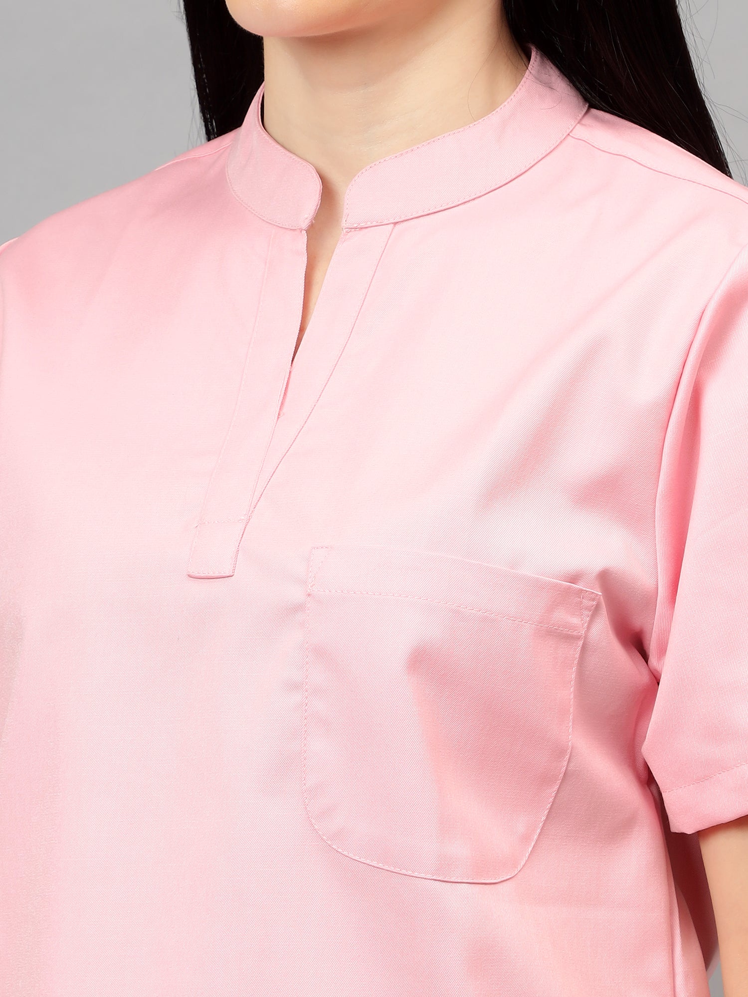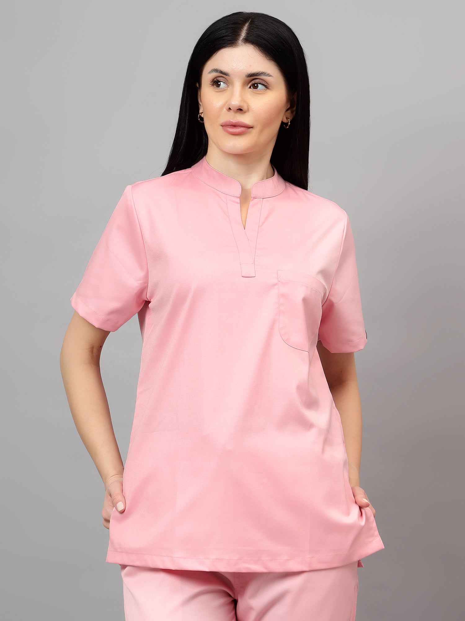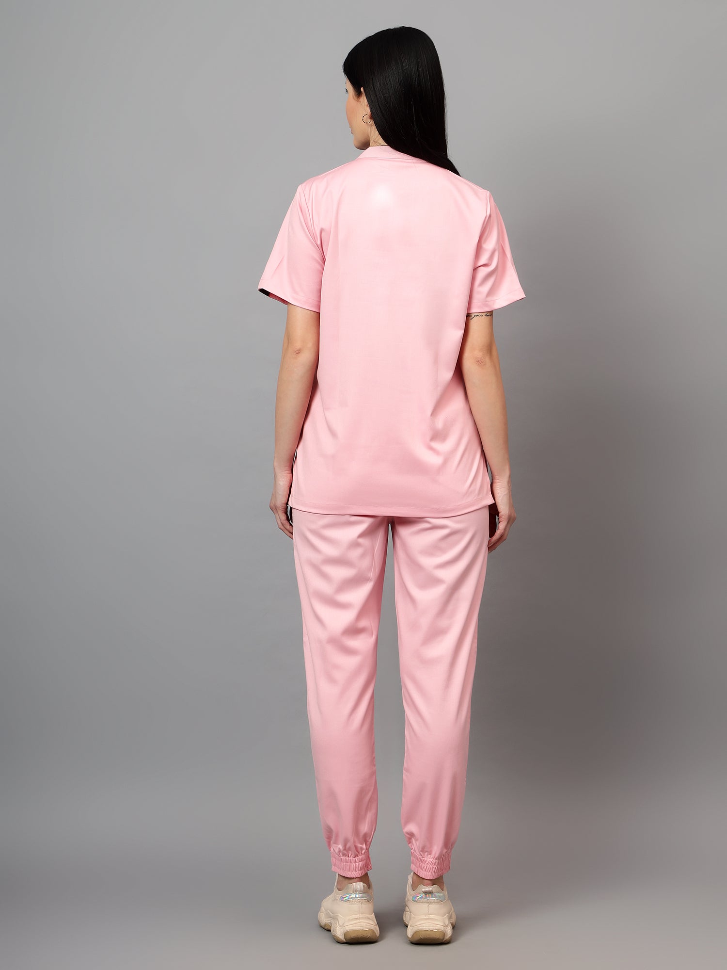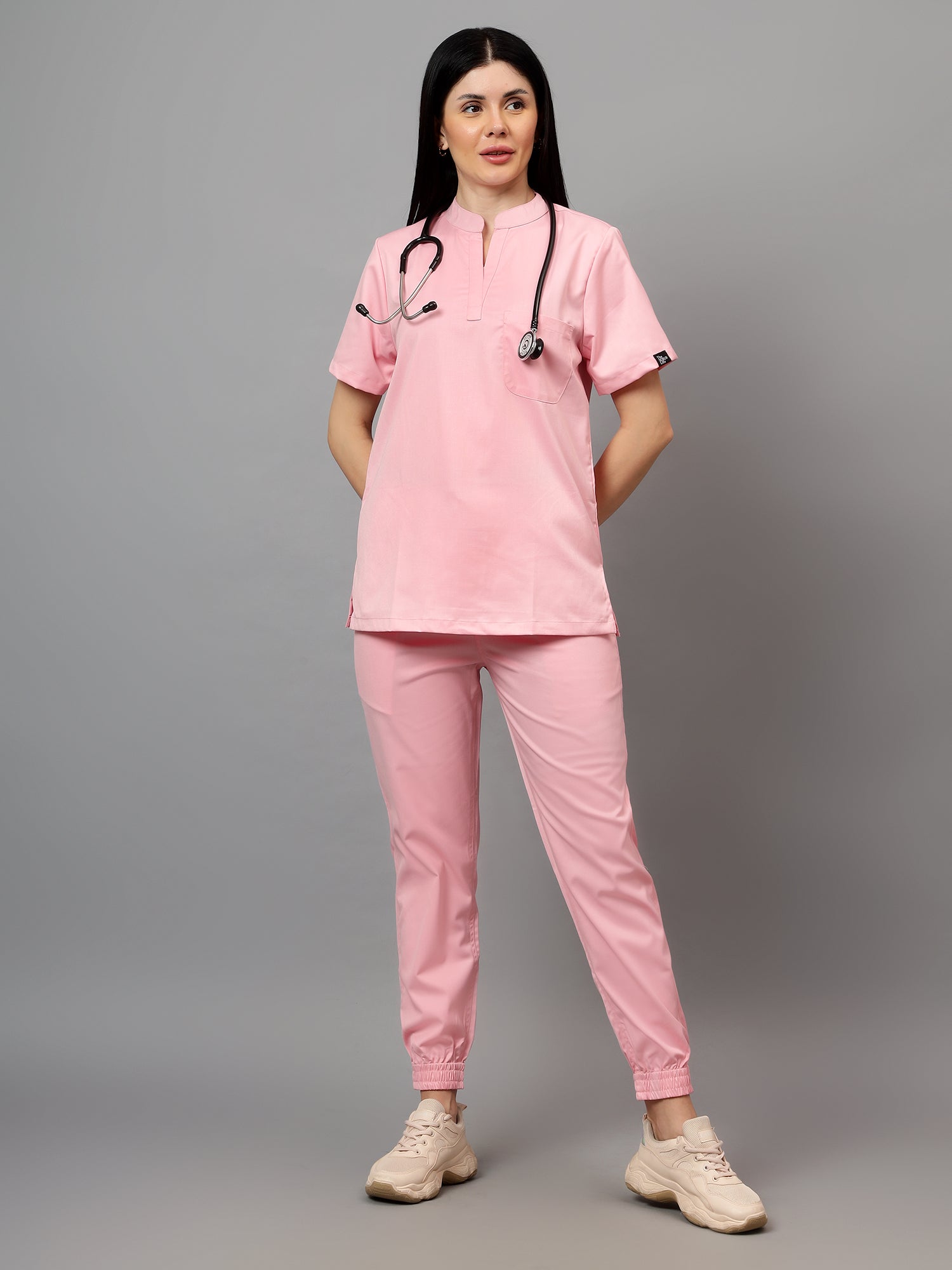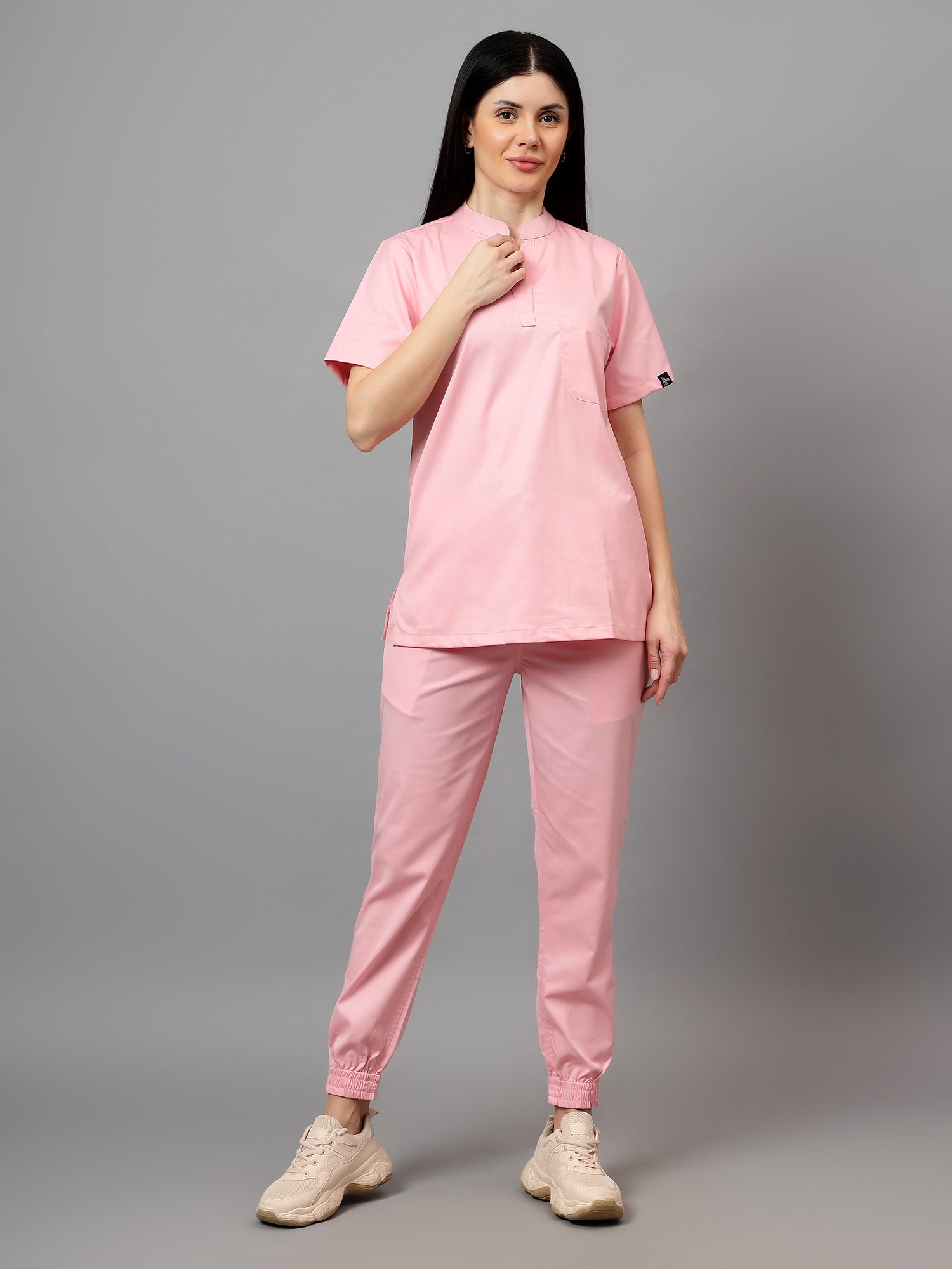 Stretchable (2Way) Female Powder Pink Mandarin Neck With Jogger Scrub Set
