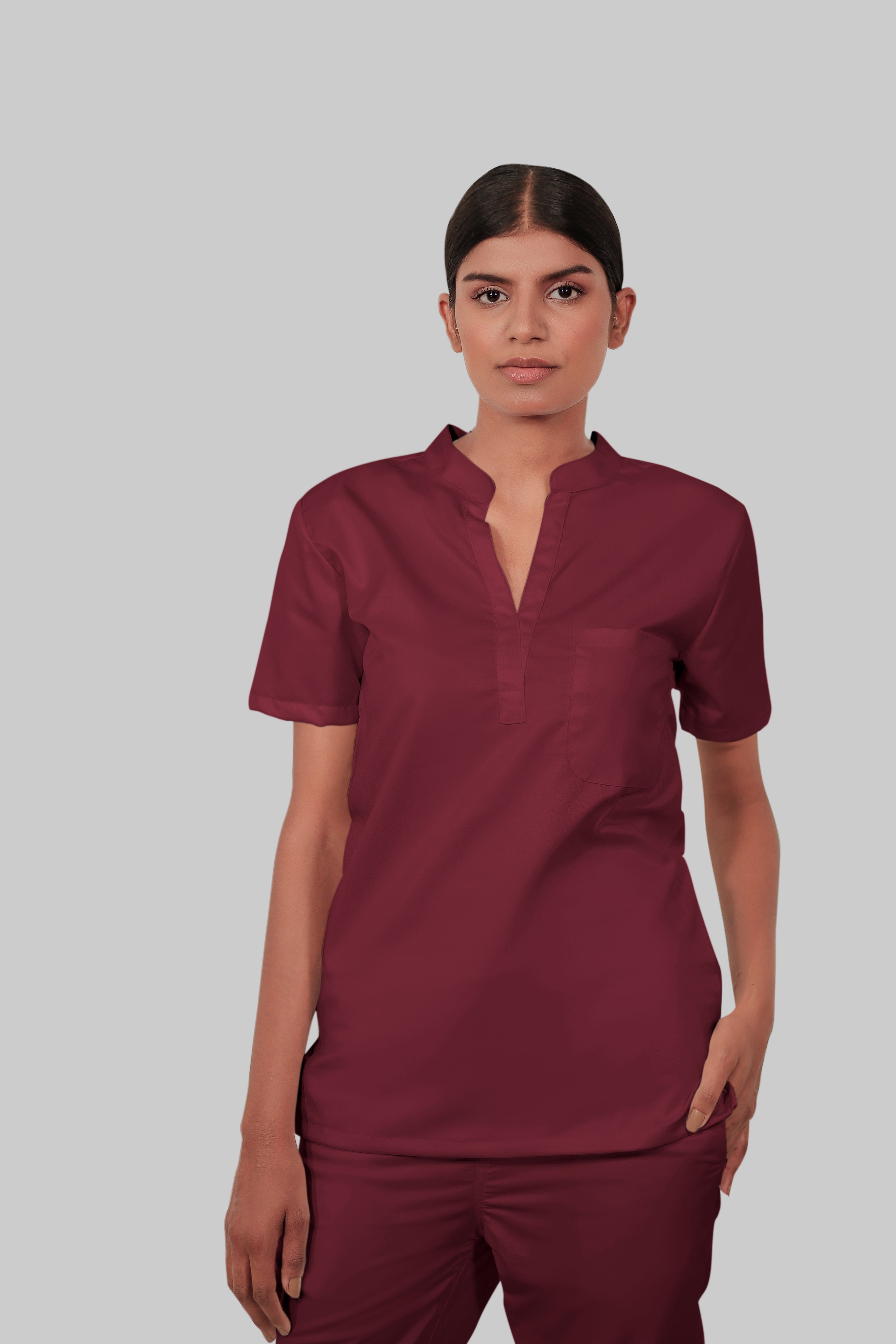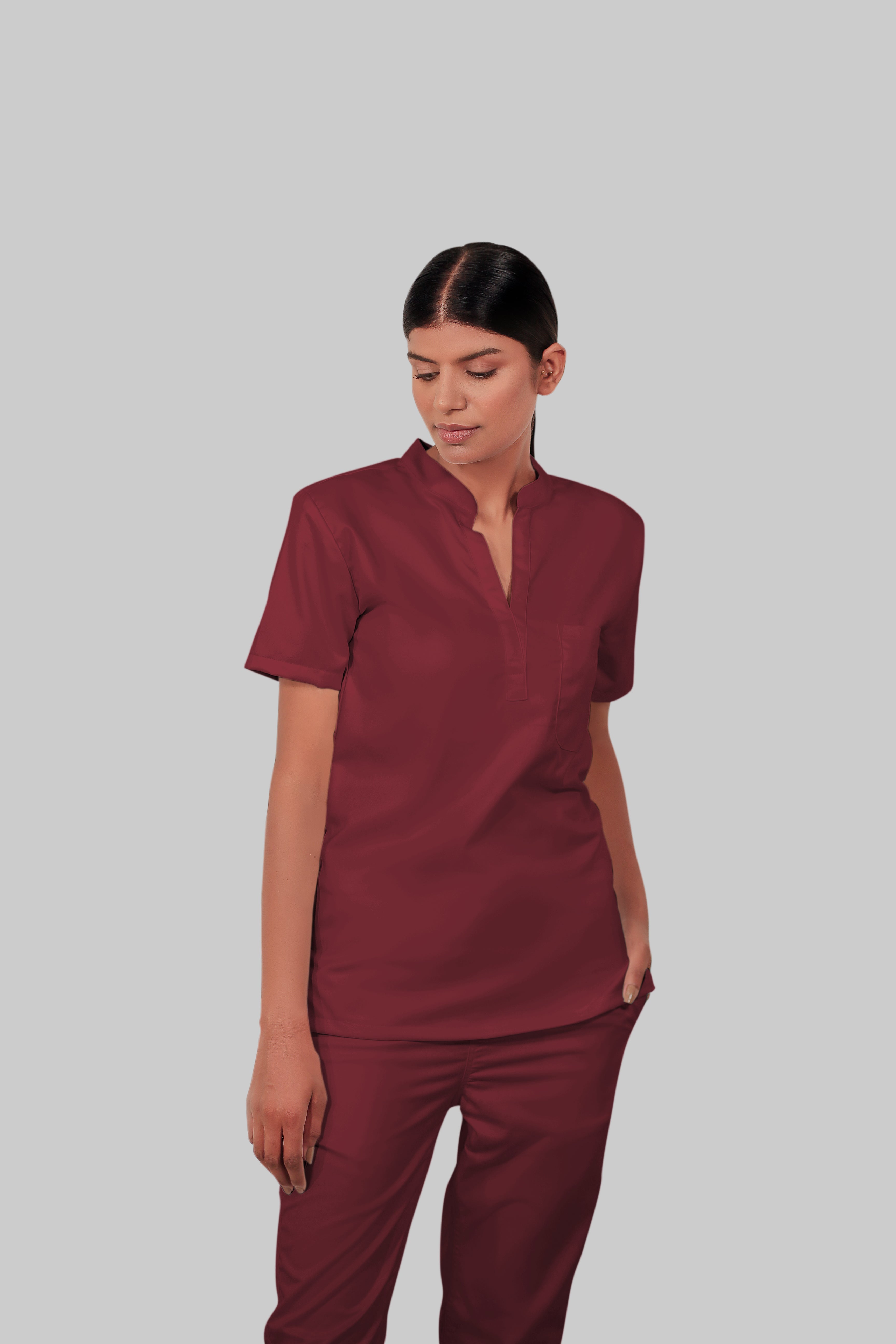 Stretchable (2Way) Female Maroon Mandarin Neck With Jogger Scrub Set