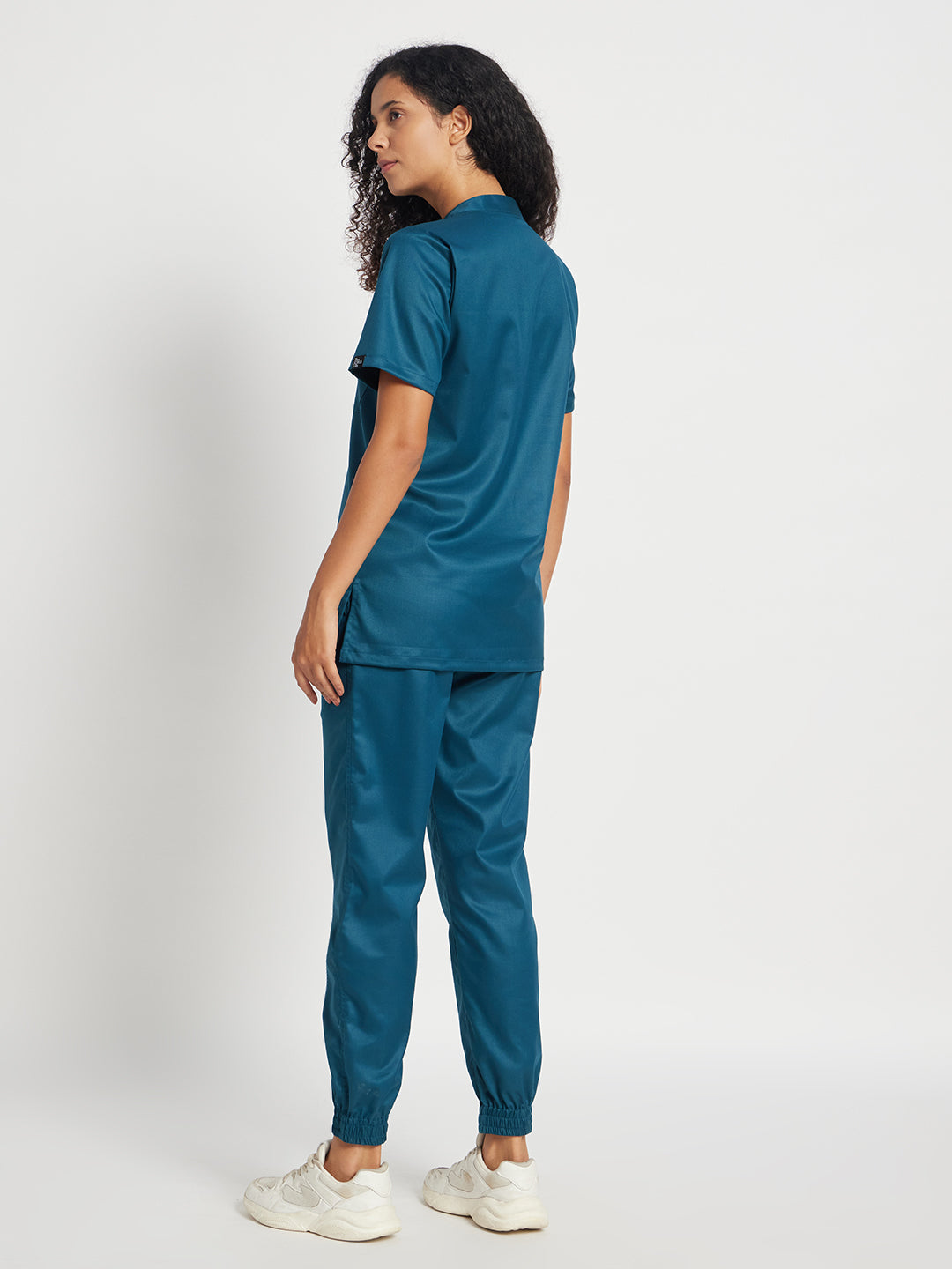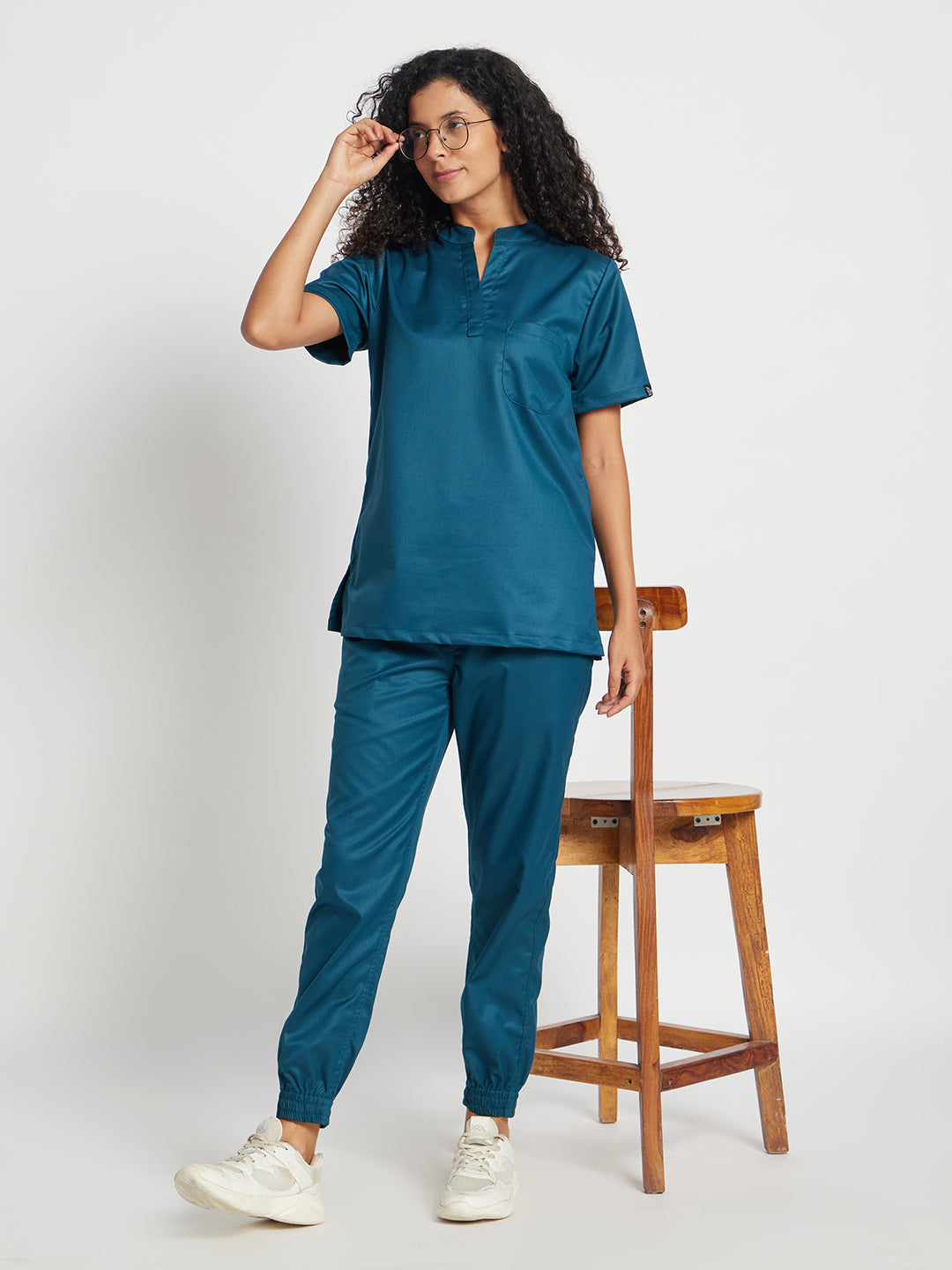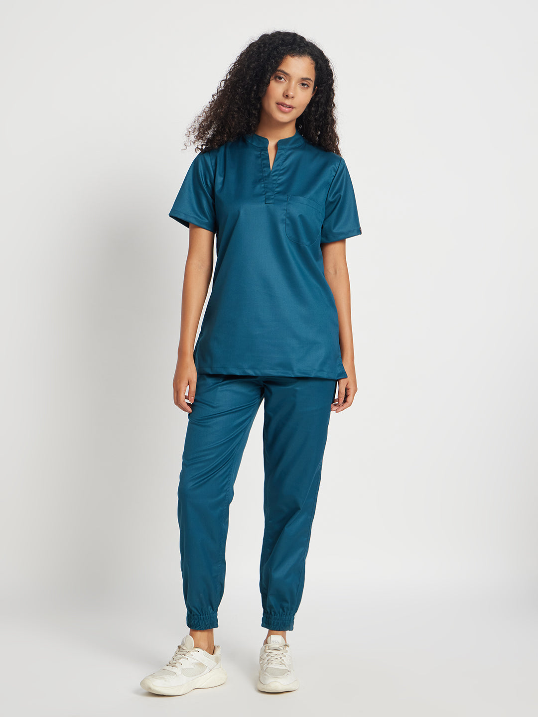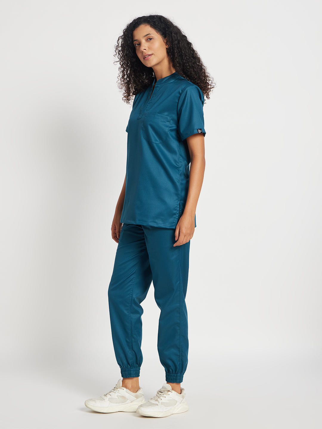 Stretchable (2Way) Female Forest Green Mandarin Neck With Jogger Scrub Set