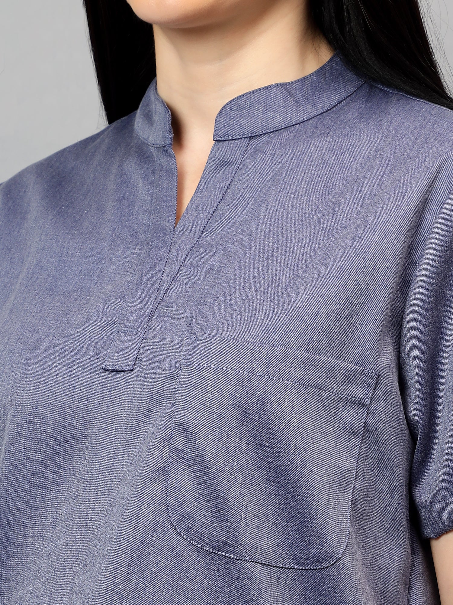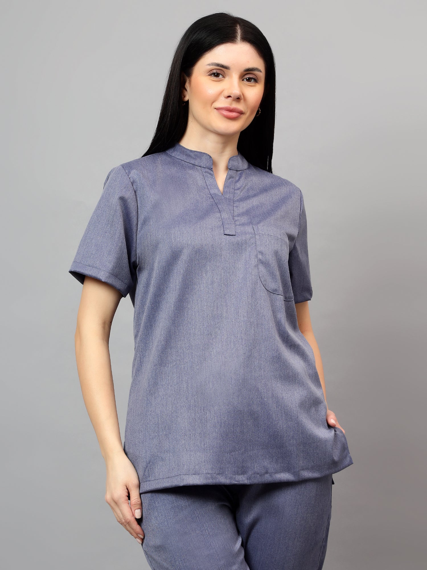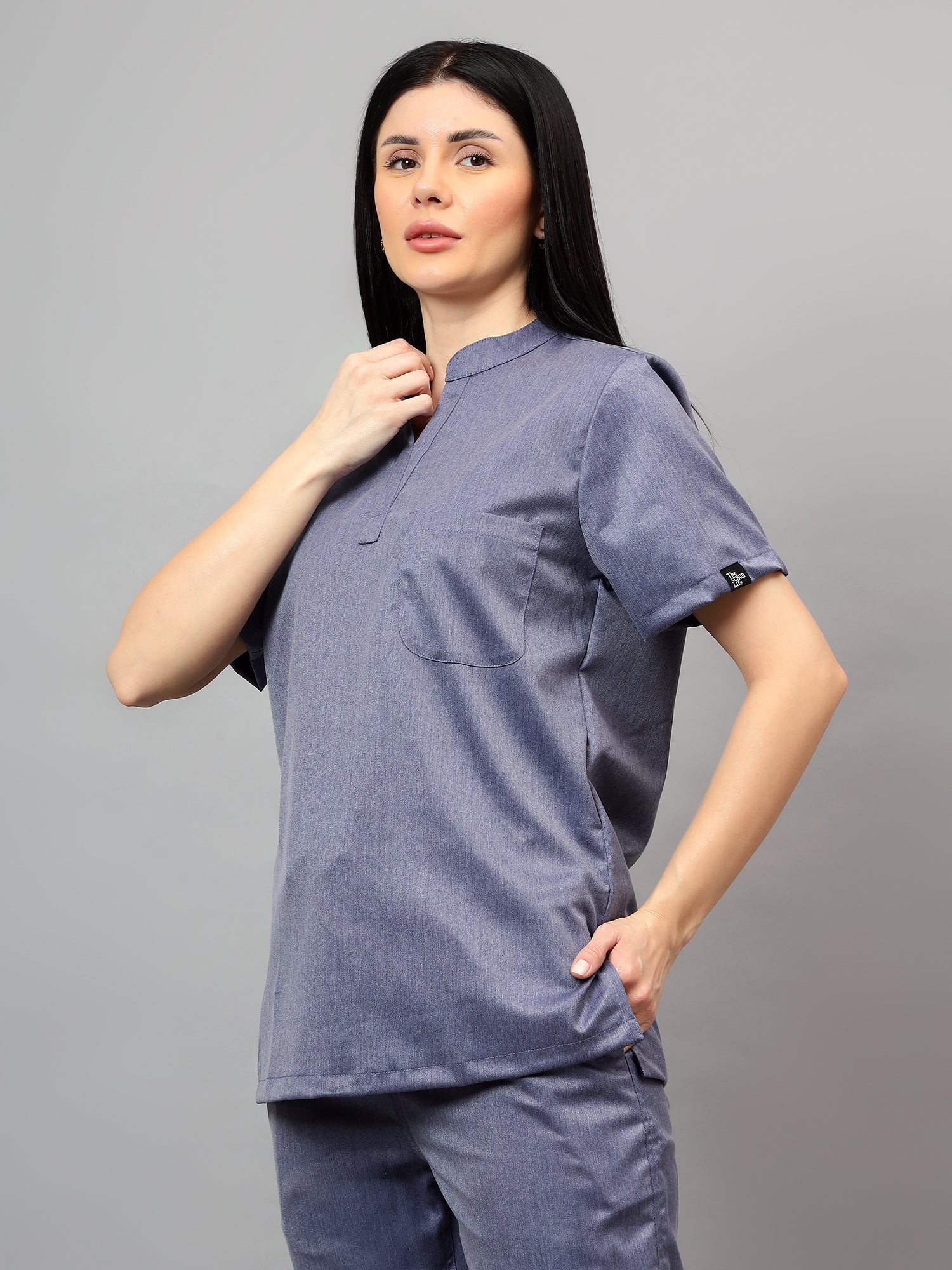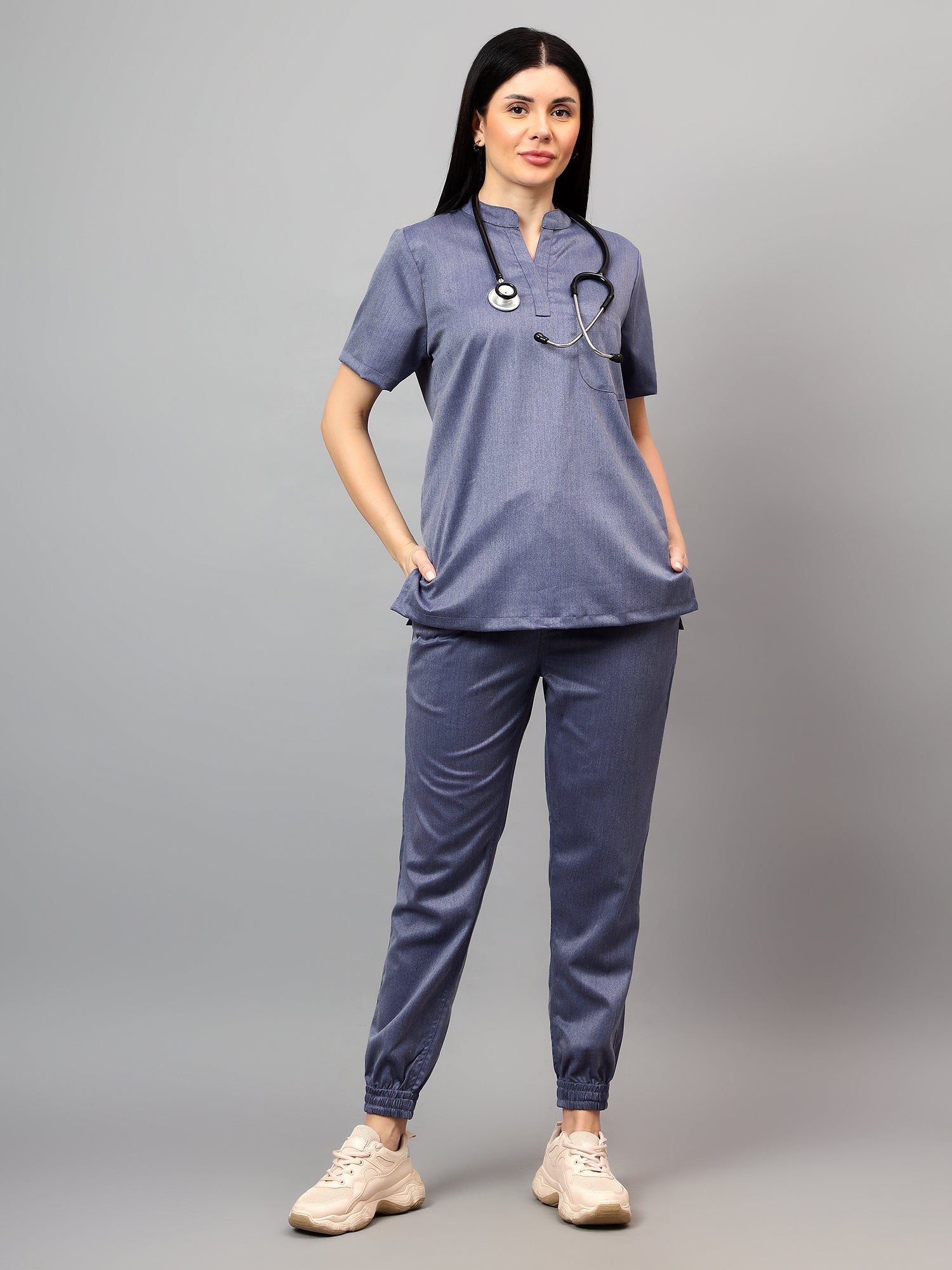 Stretchable (2Way) Female Denim Blue Texture Mandarin Neck With Jogger Scrub Set