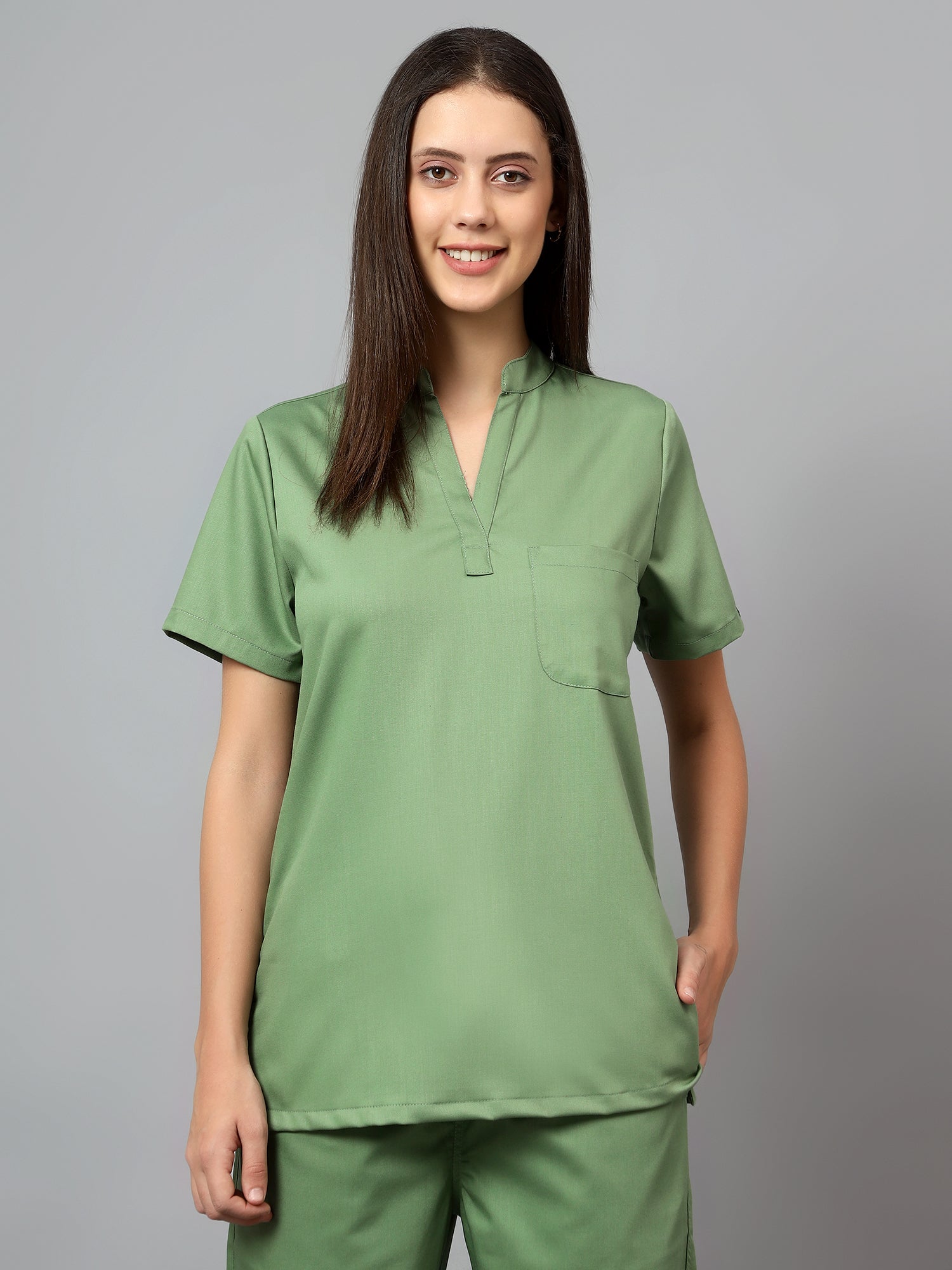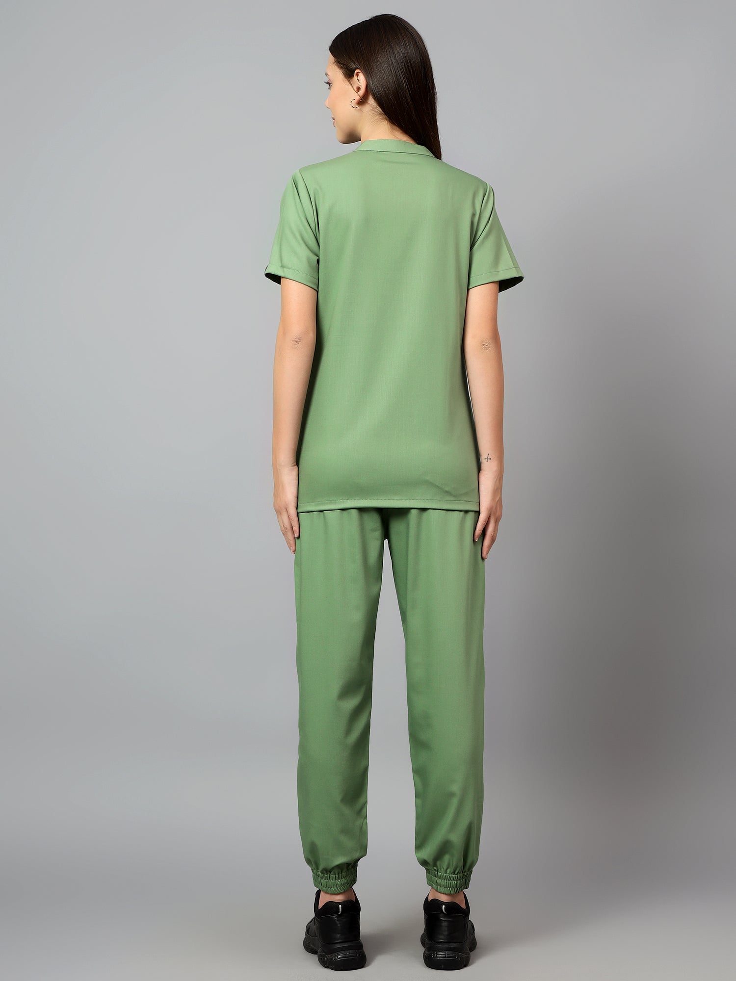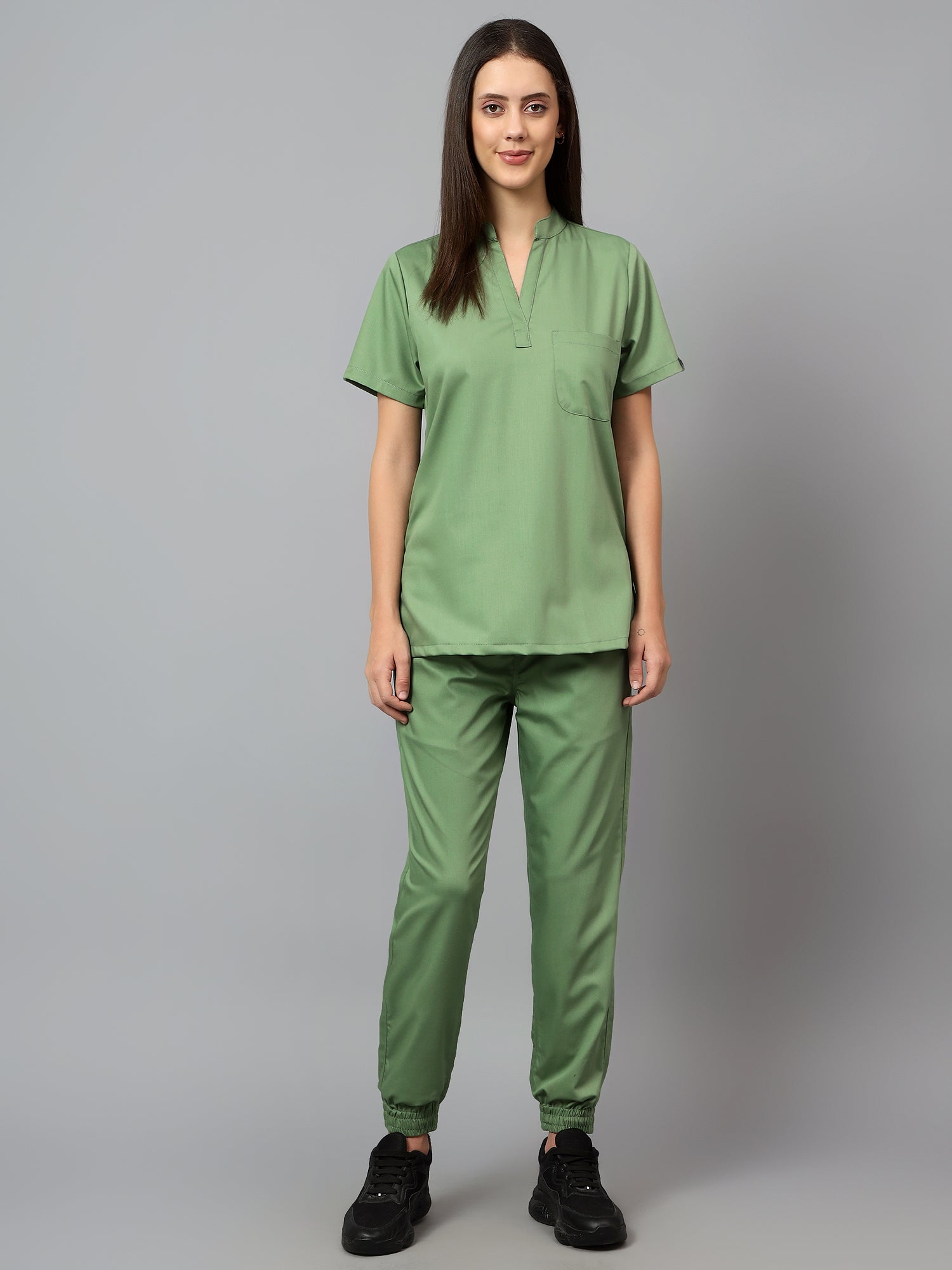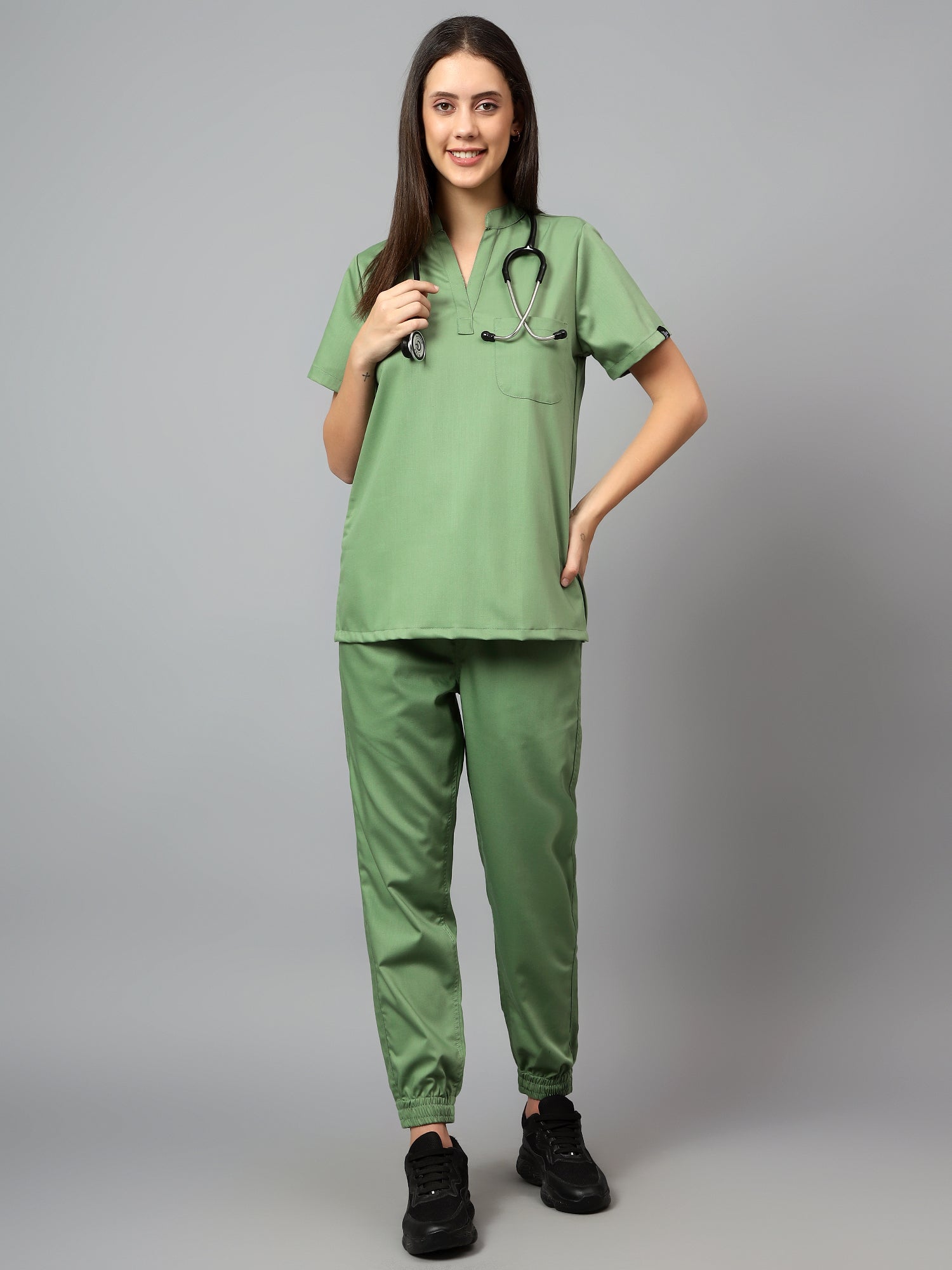 Stretchable (2Way) Female Pista Green Mandarin Neck With Jogger Scrub Set