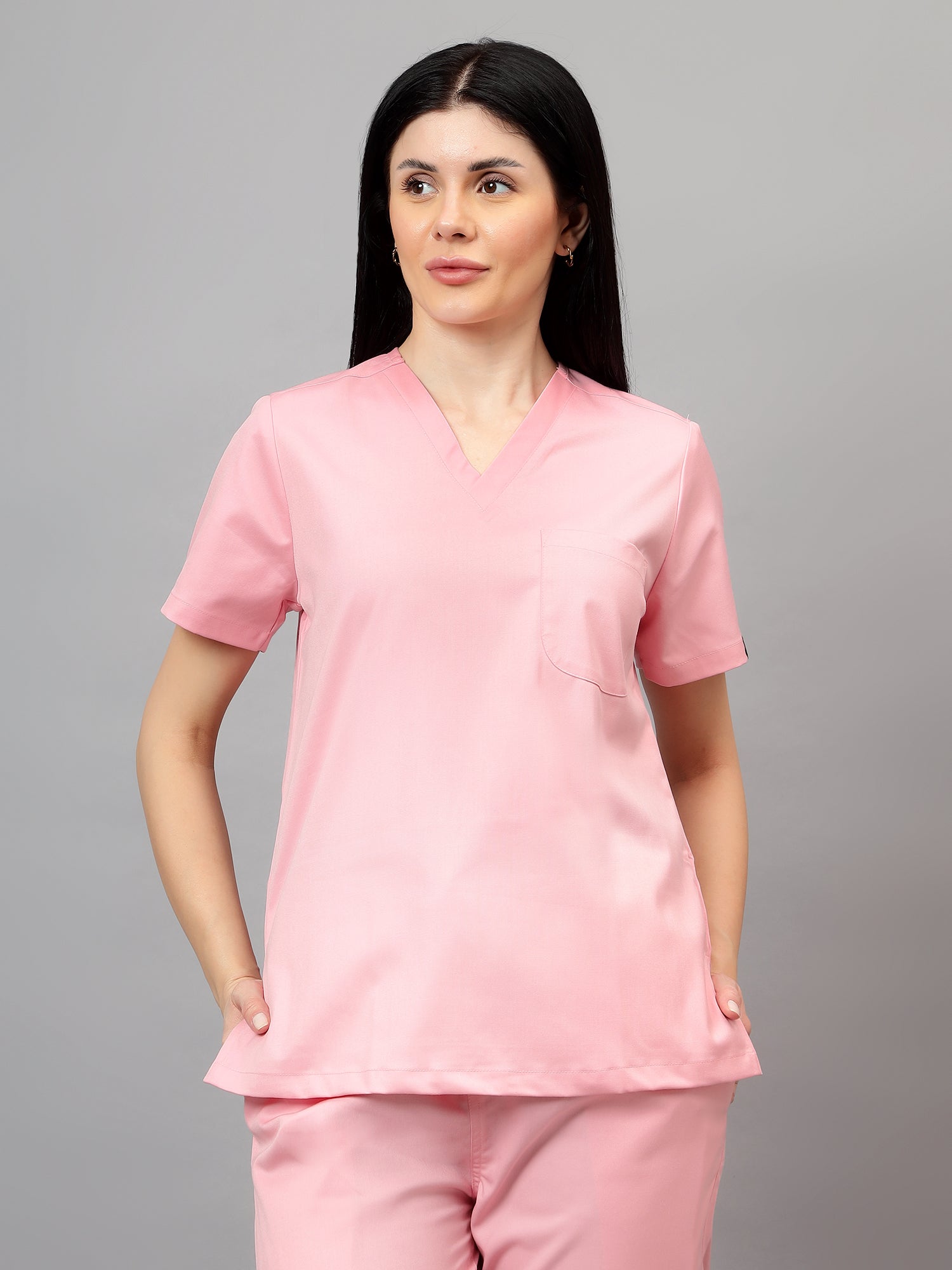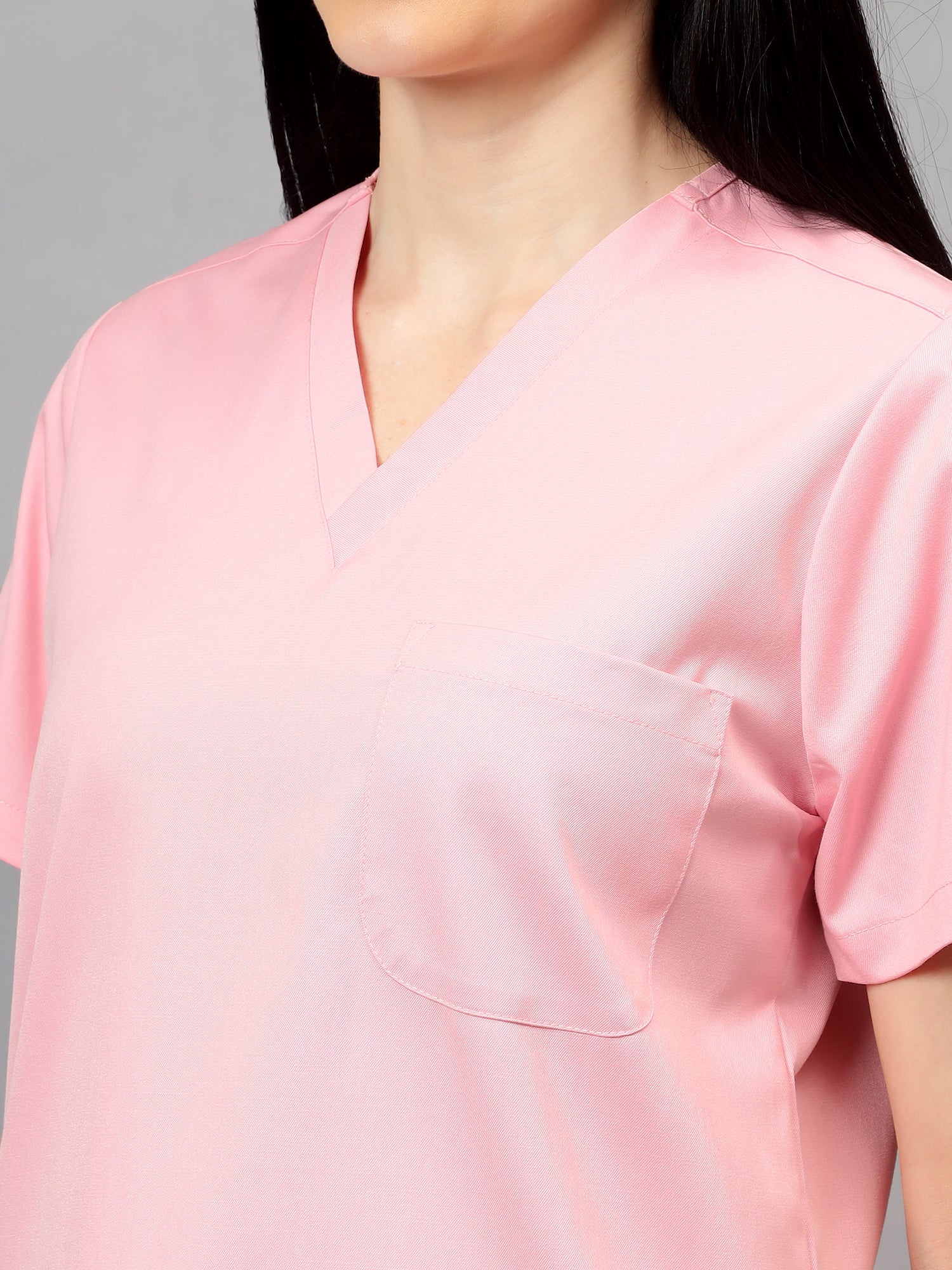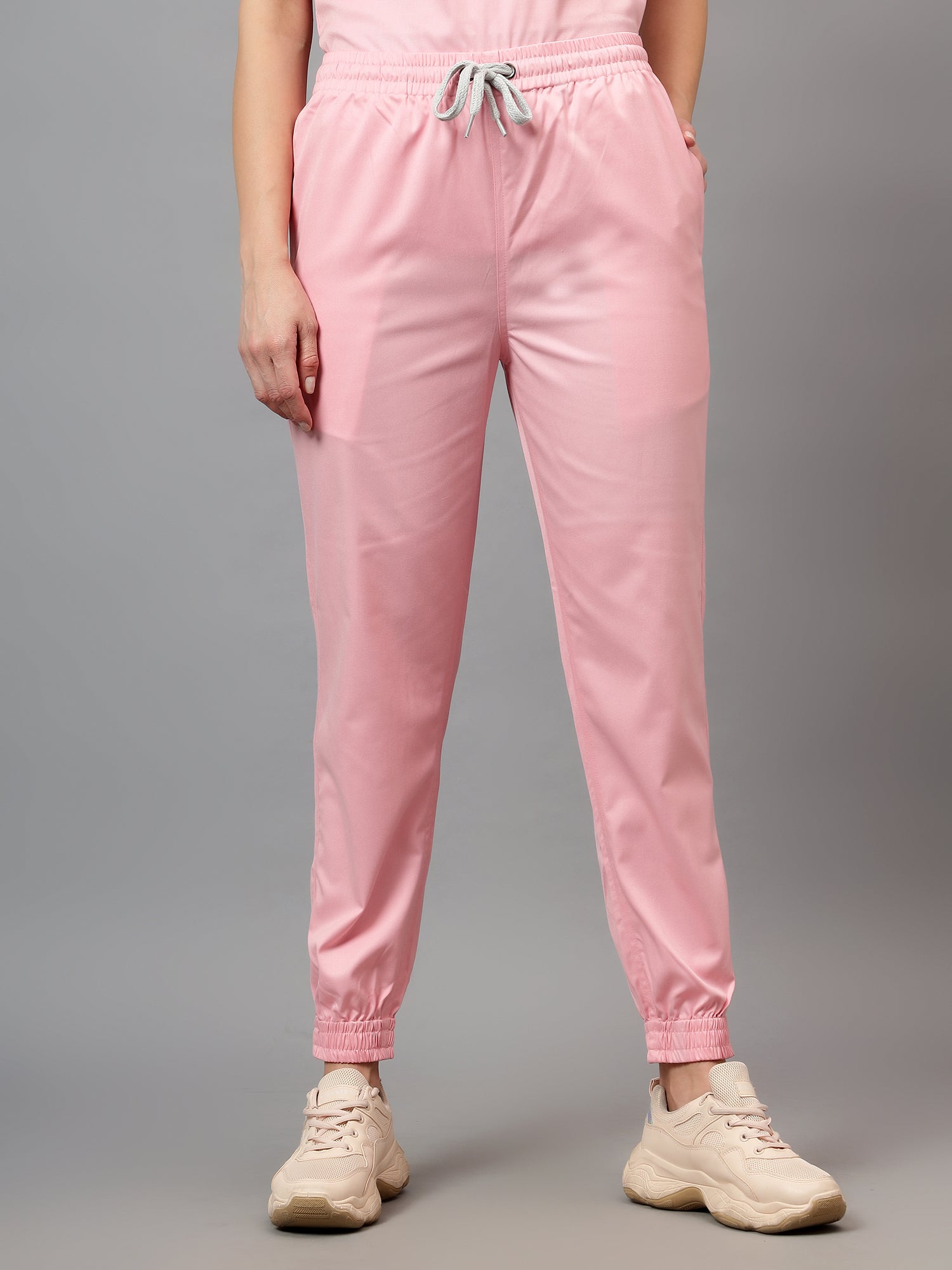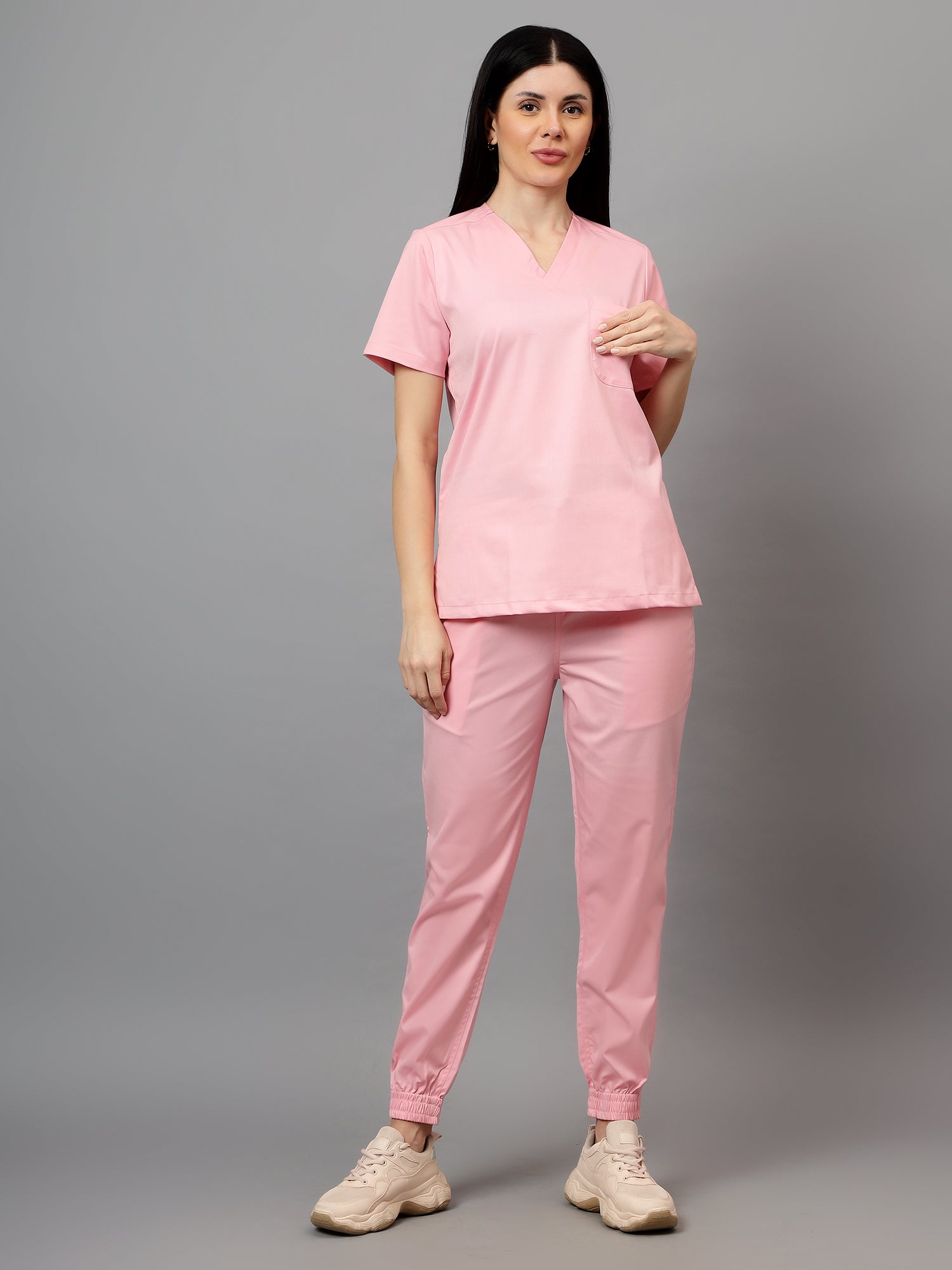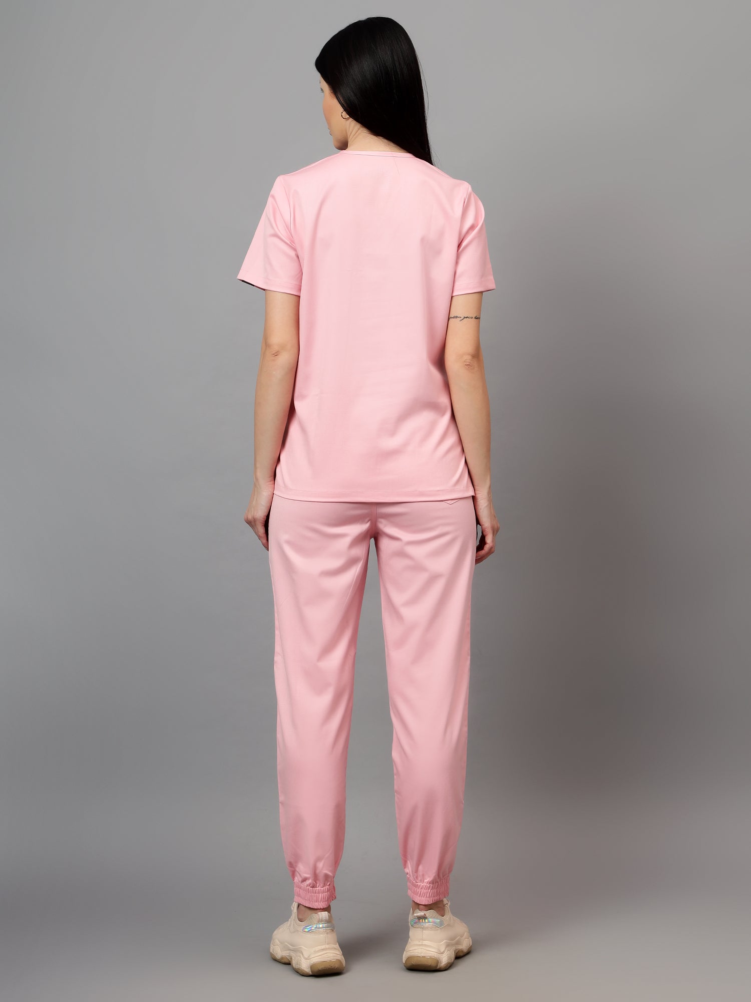 Stretchable (2Way) Female Powder Pink V-Neck With Jogger Scrub Set