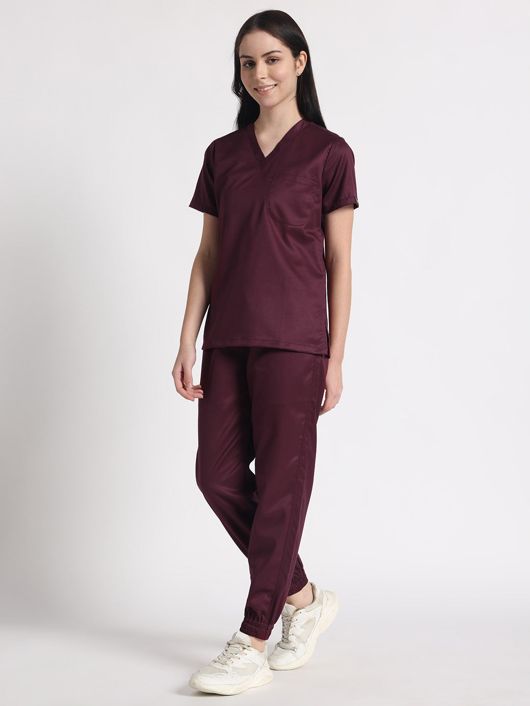 Stretchable (2Way) Female Wine V-Neck With Jogger Scrub Set