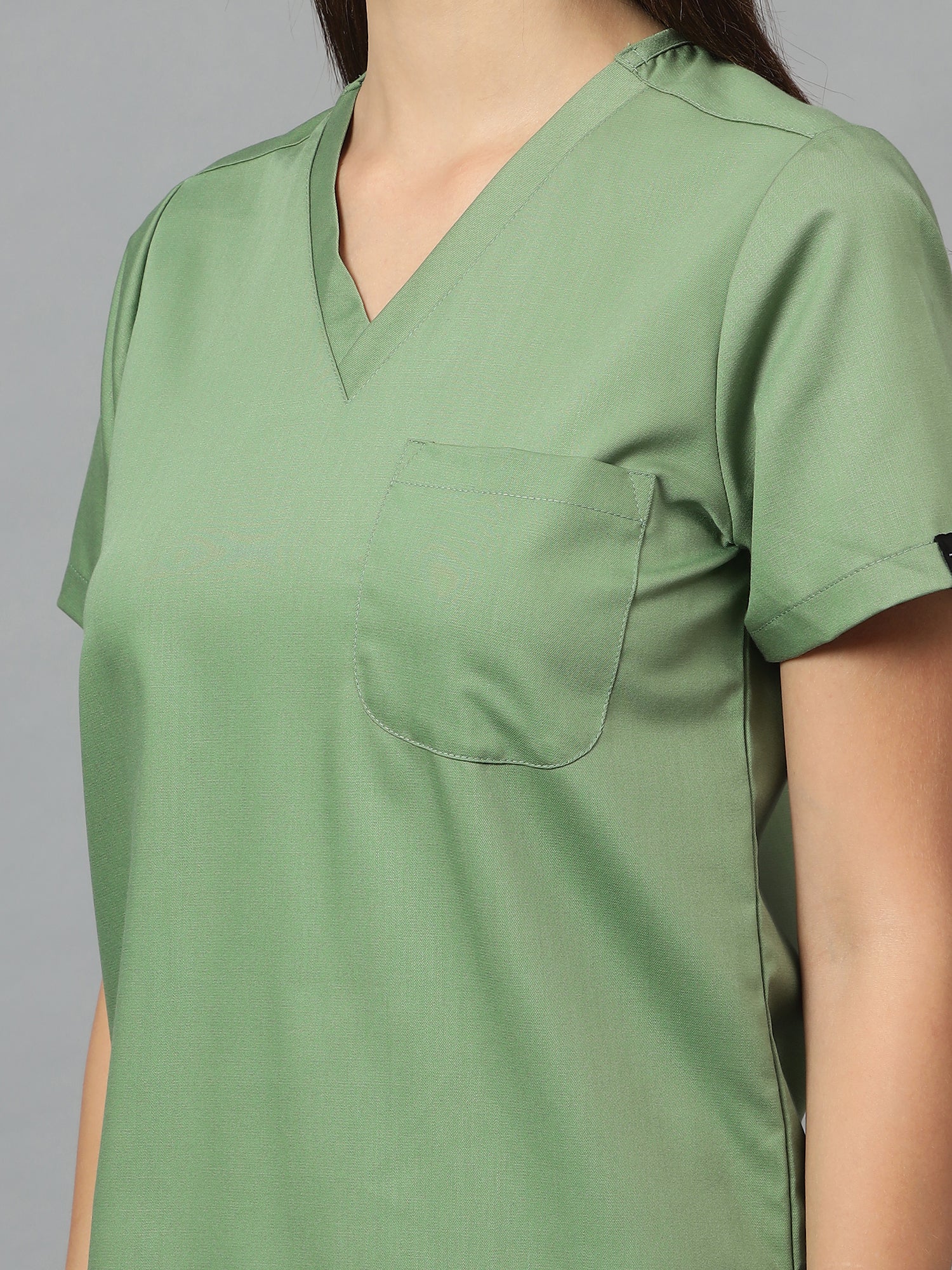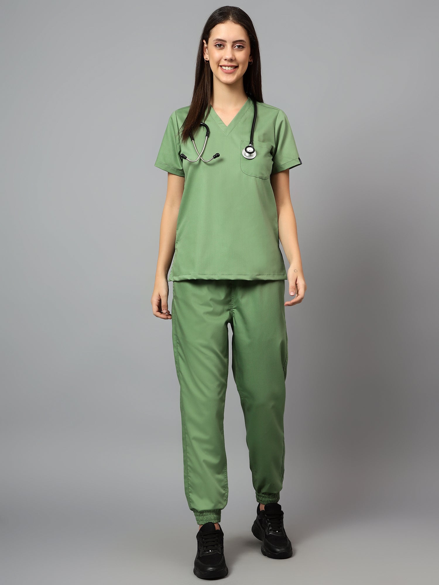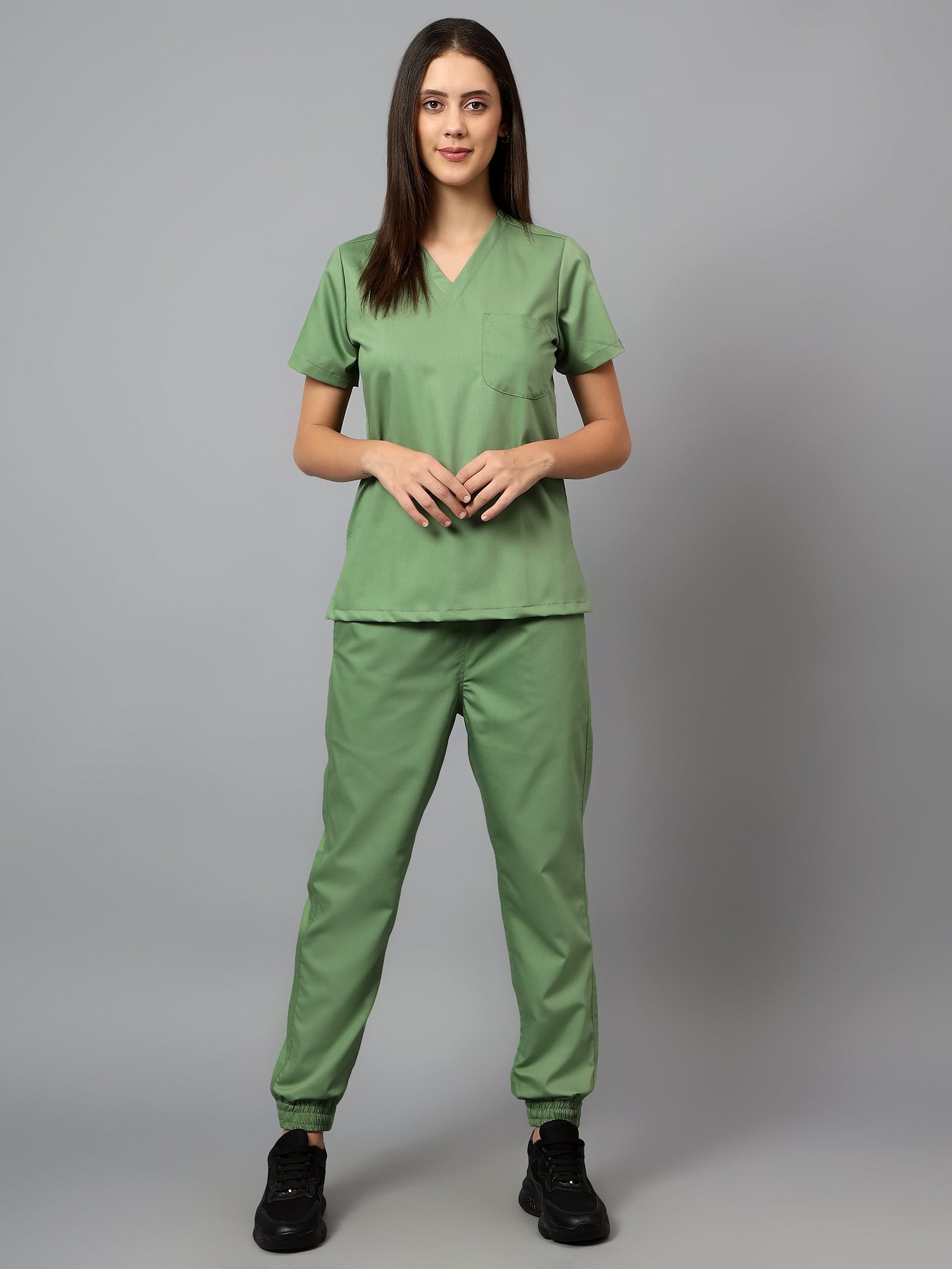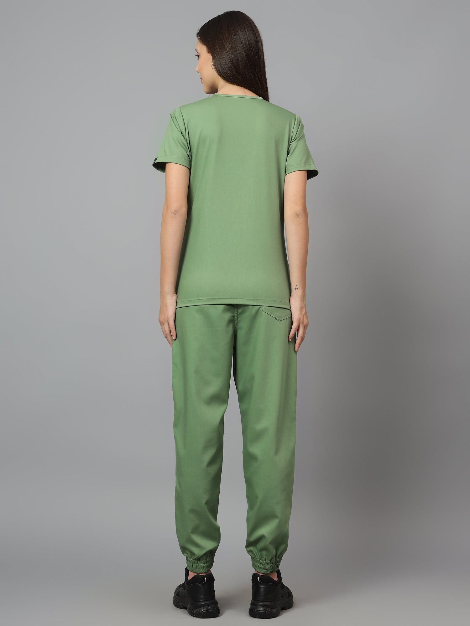 Stretchable (2Way) Female Pista Green V-Neck With Jogger Scrub Set