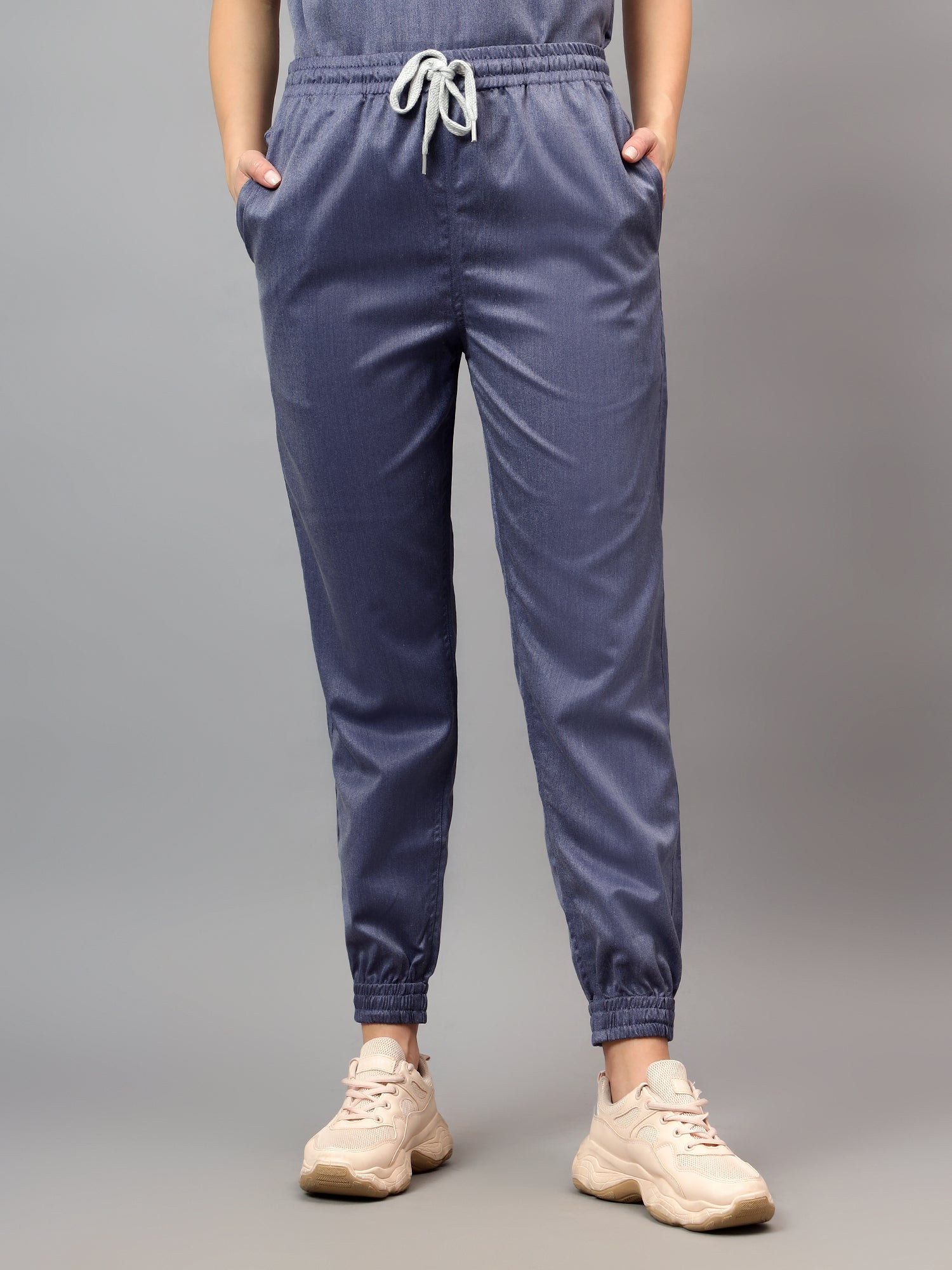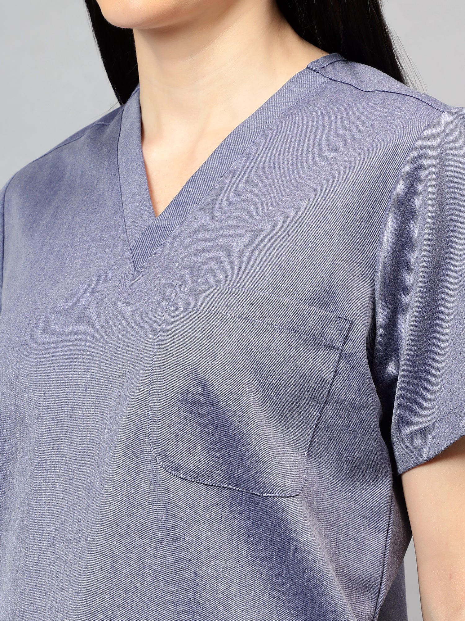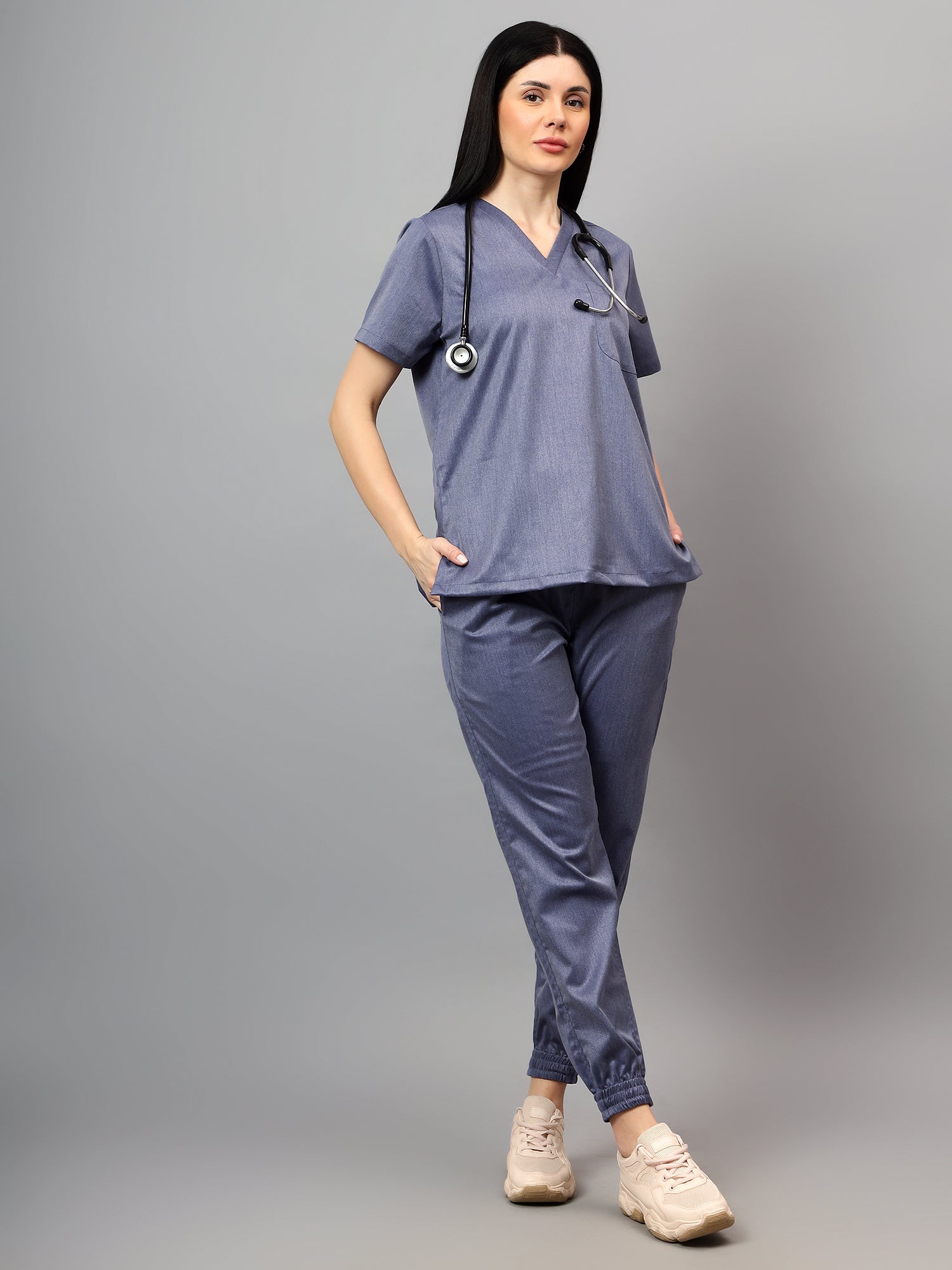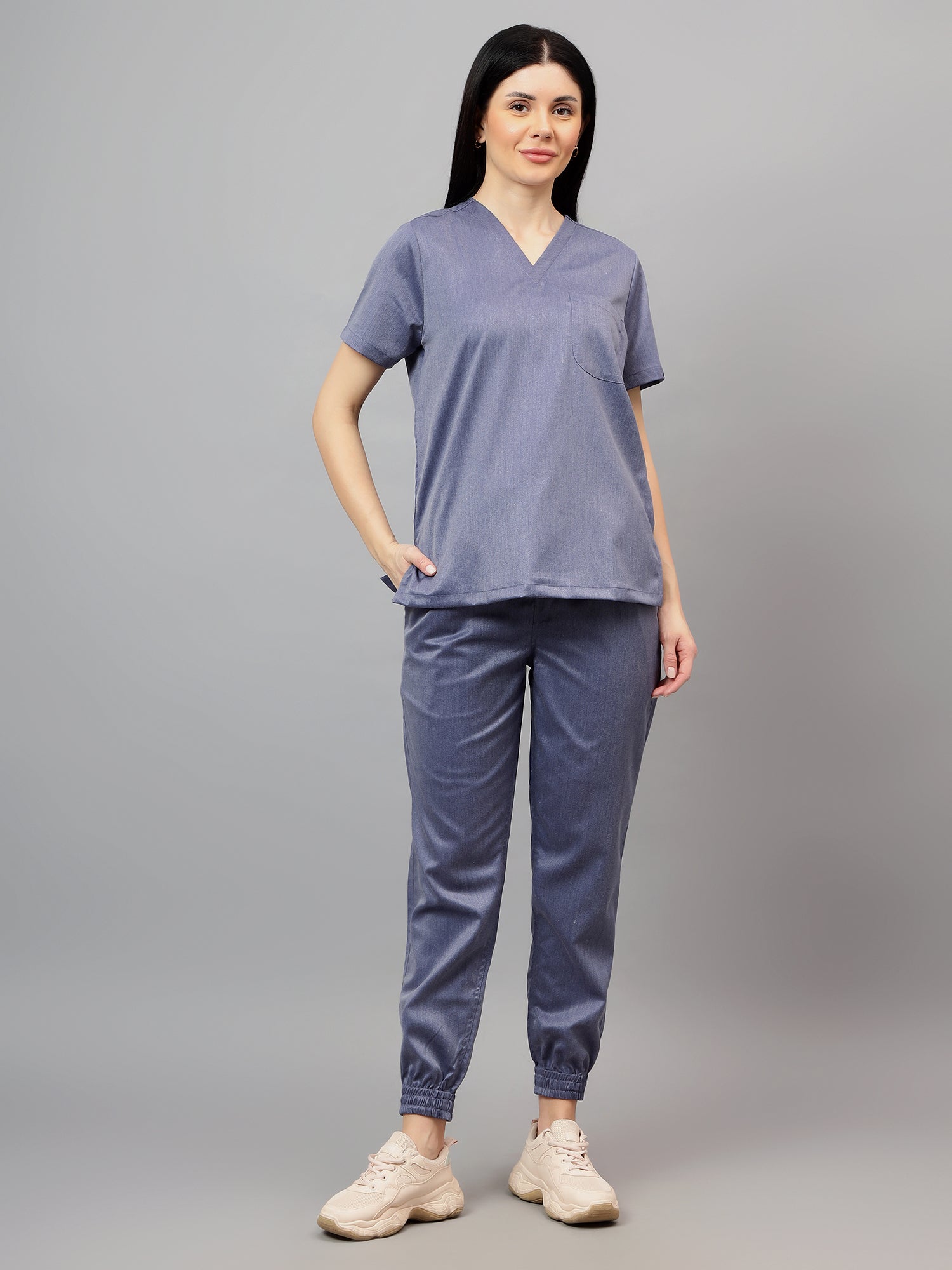 Stretchable (2Way) Female Denim Blue Texture V-Neck With Jogger Scrub Set