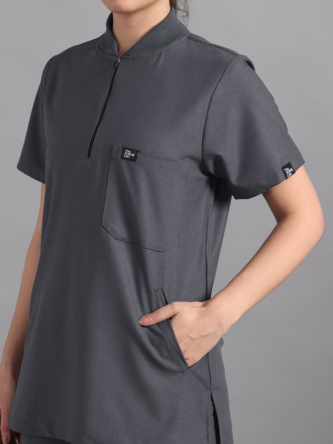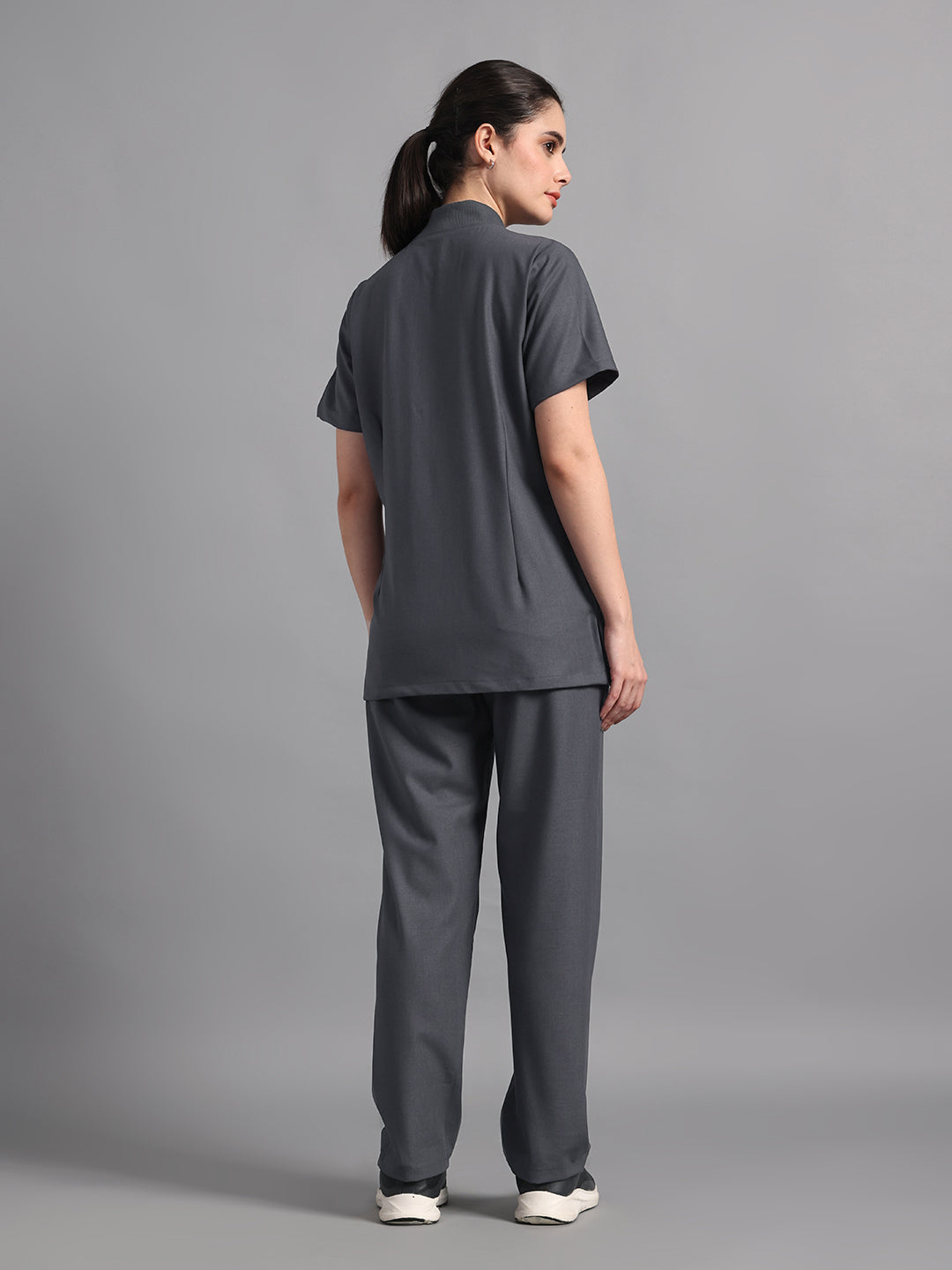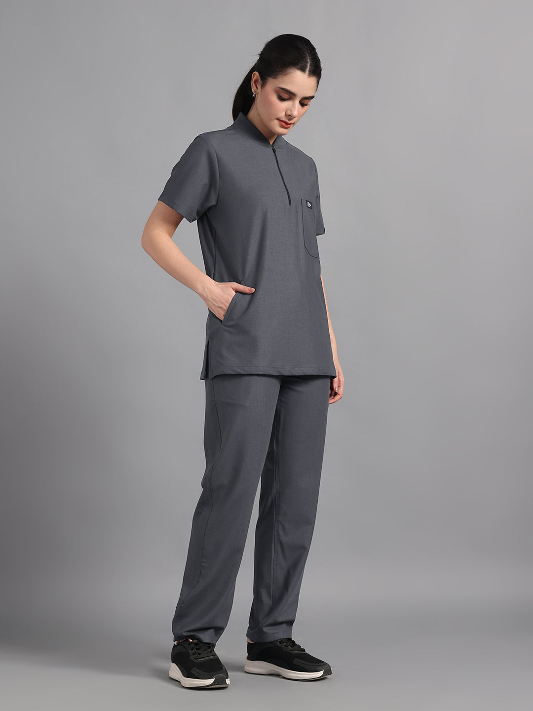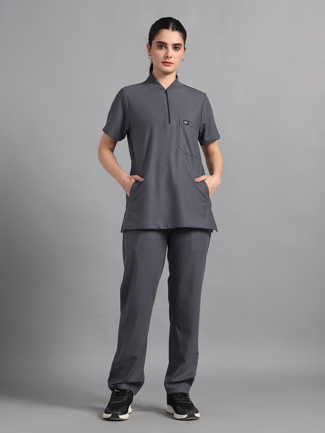 Stretchable (4Way) Charcoal Grey Female Flex Zip Neckline Top With Straight Pants