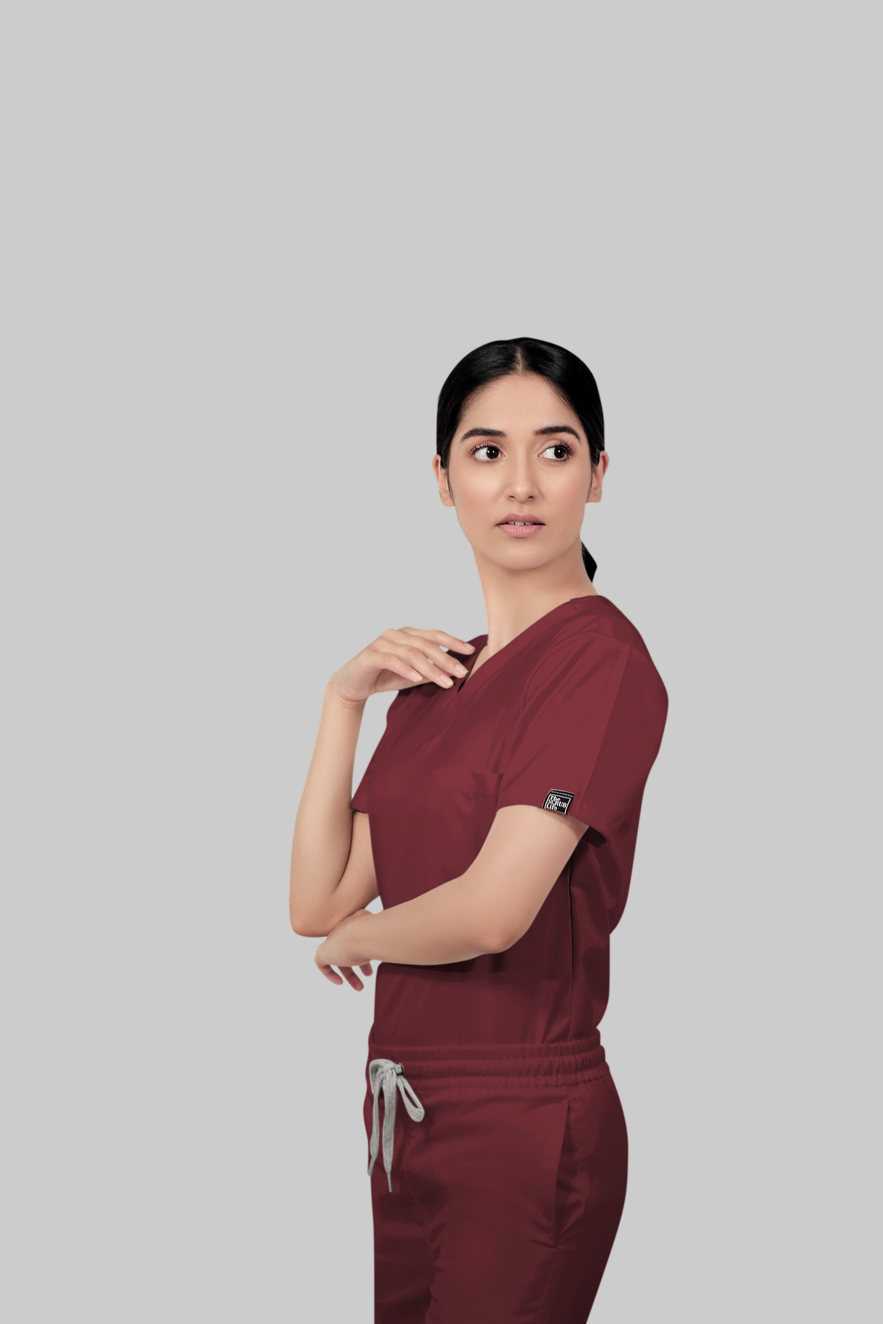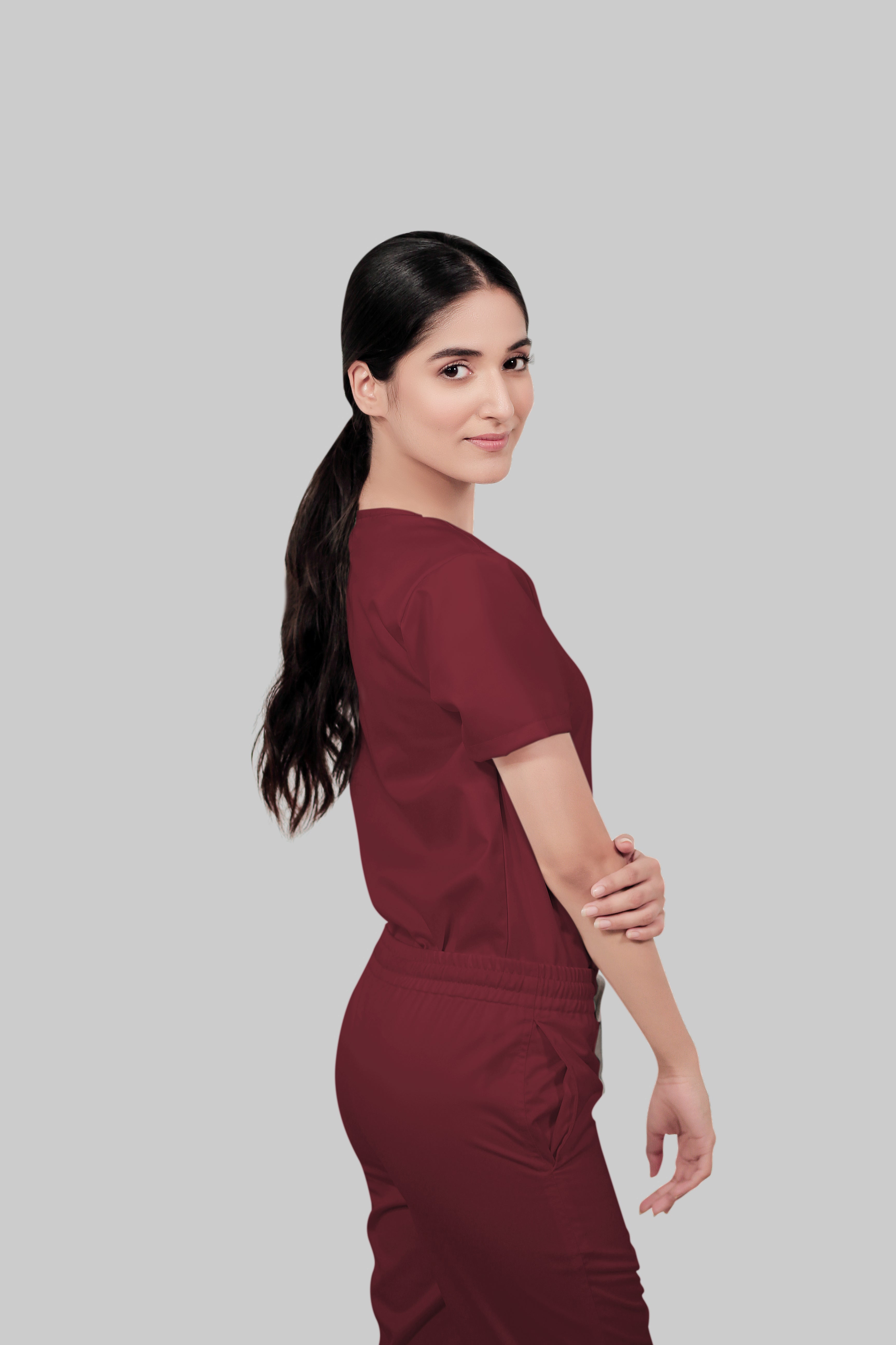 Stretchable (2Way) Female Maroon V-Neck Scrub Top