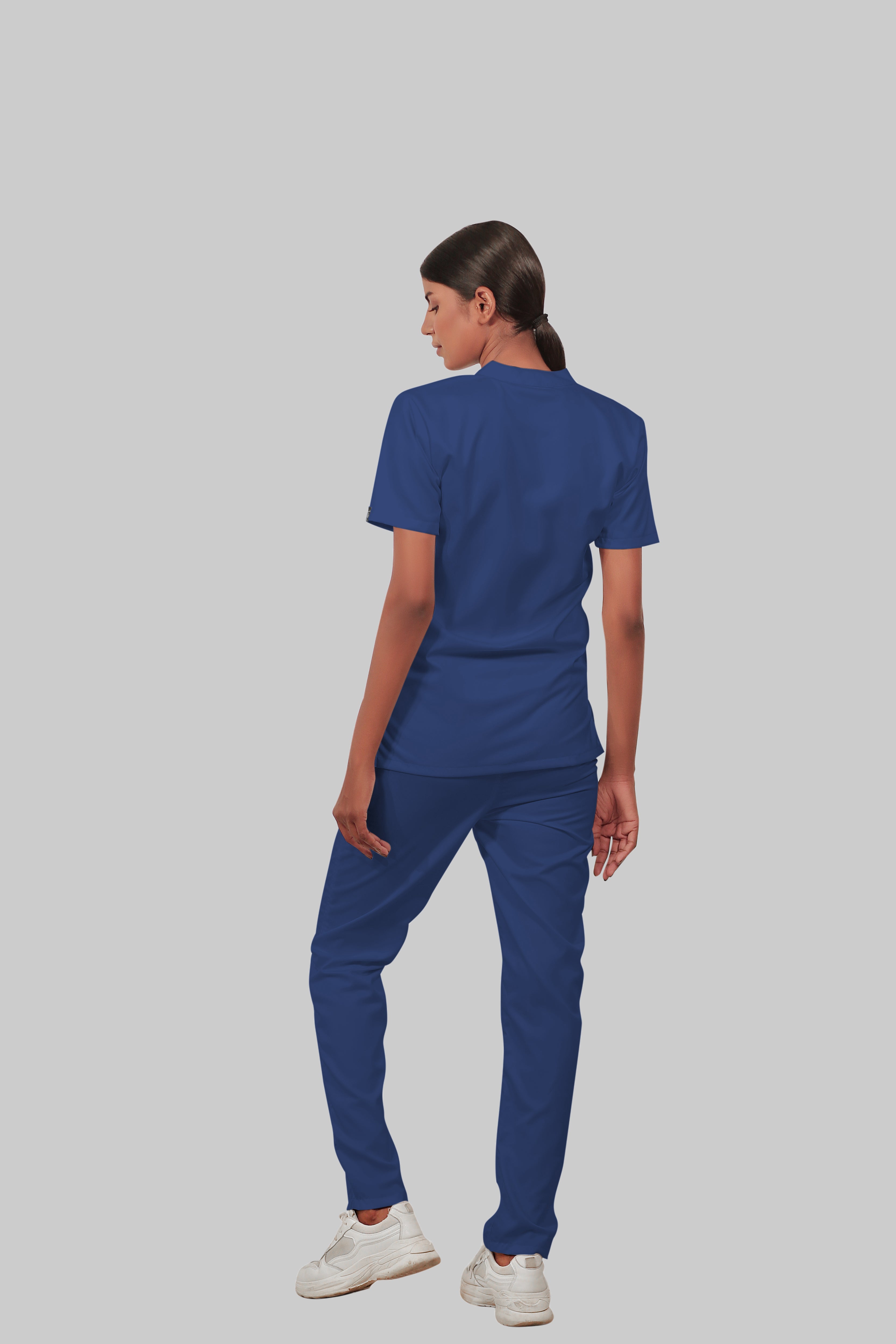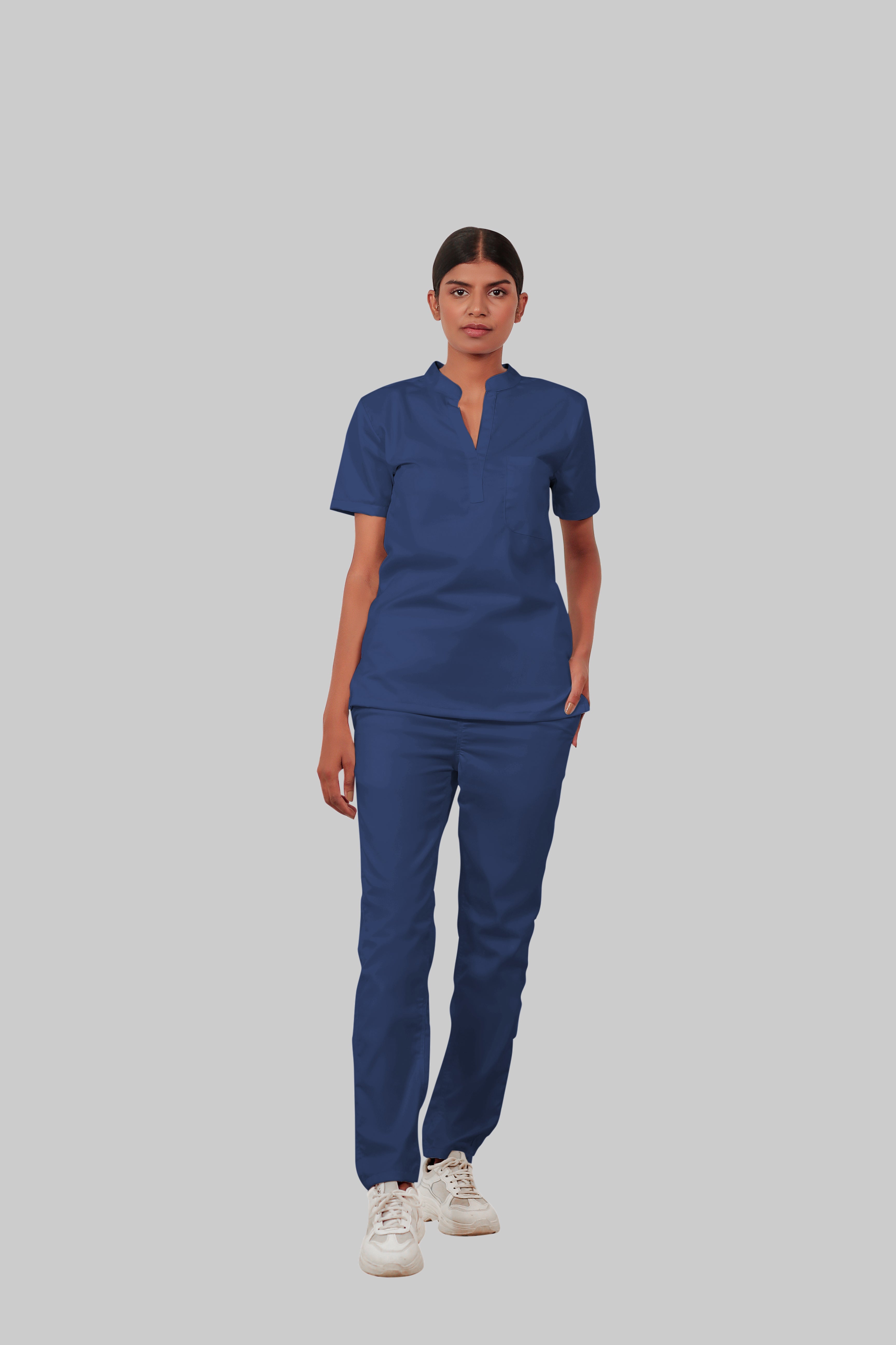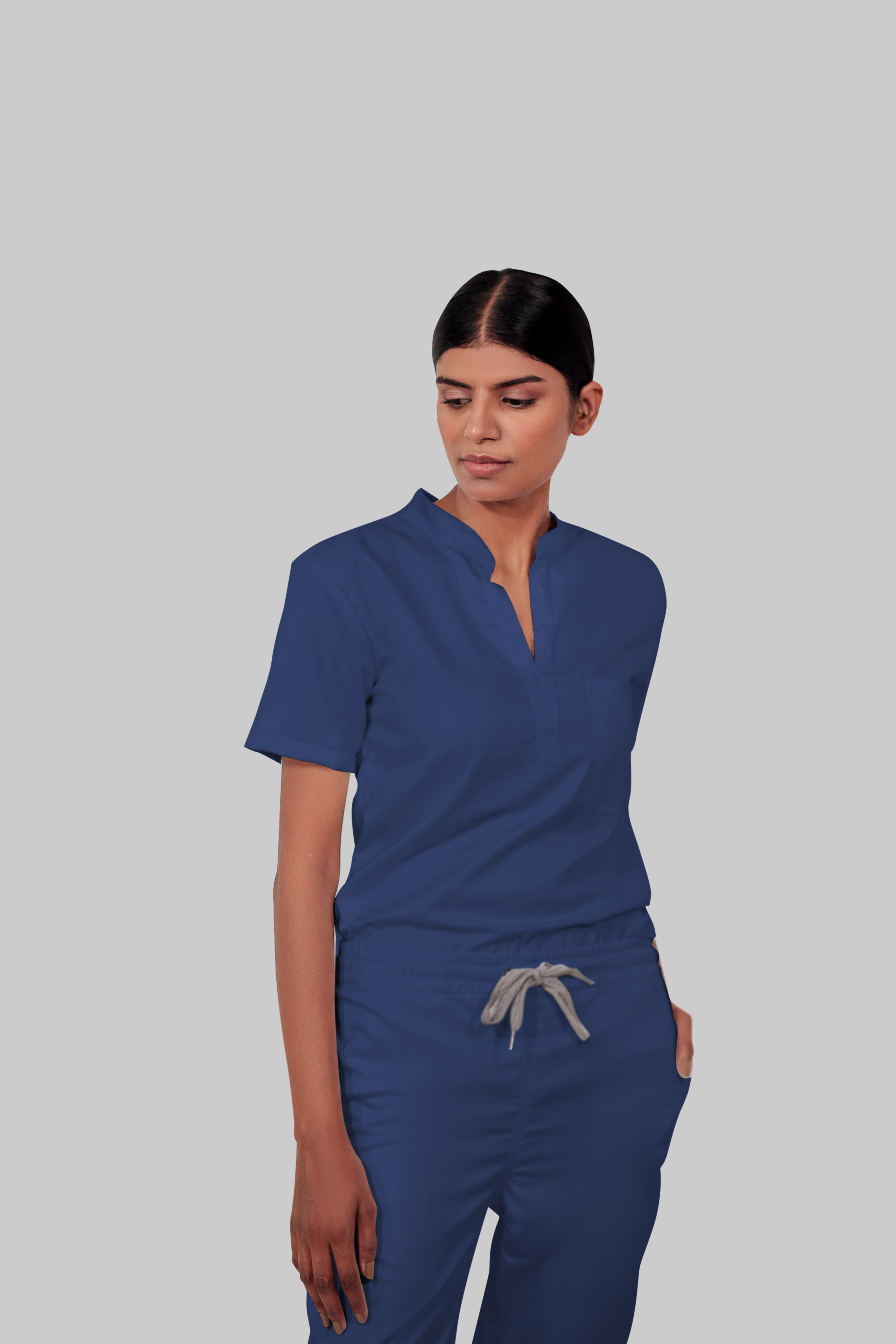 Stretchable (4Way) Female Royal Blue Mandarin Neck With Straight Pant Scrub Set