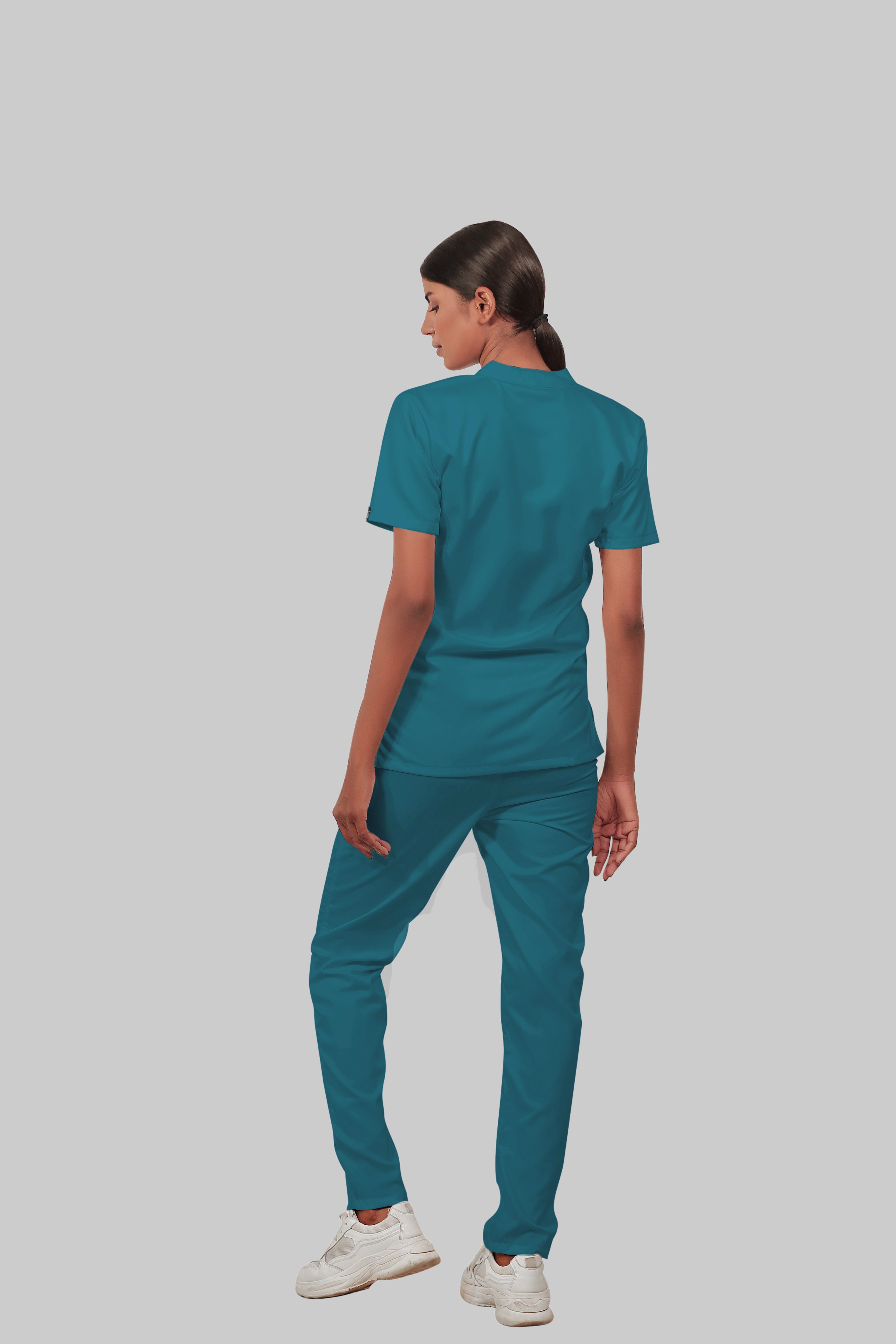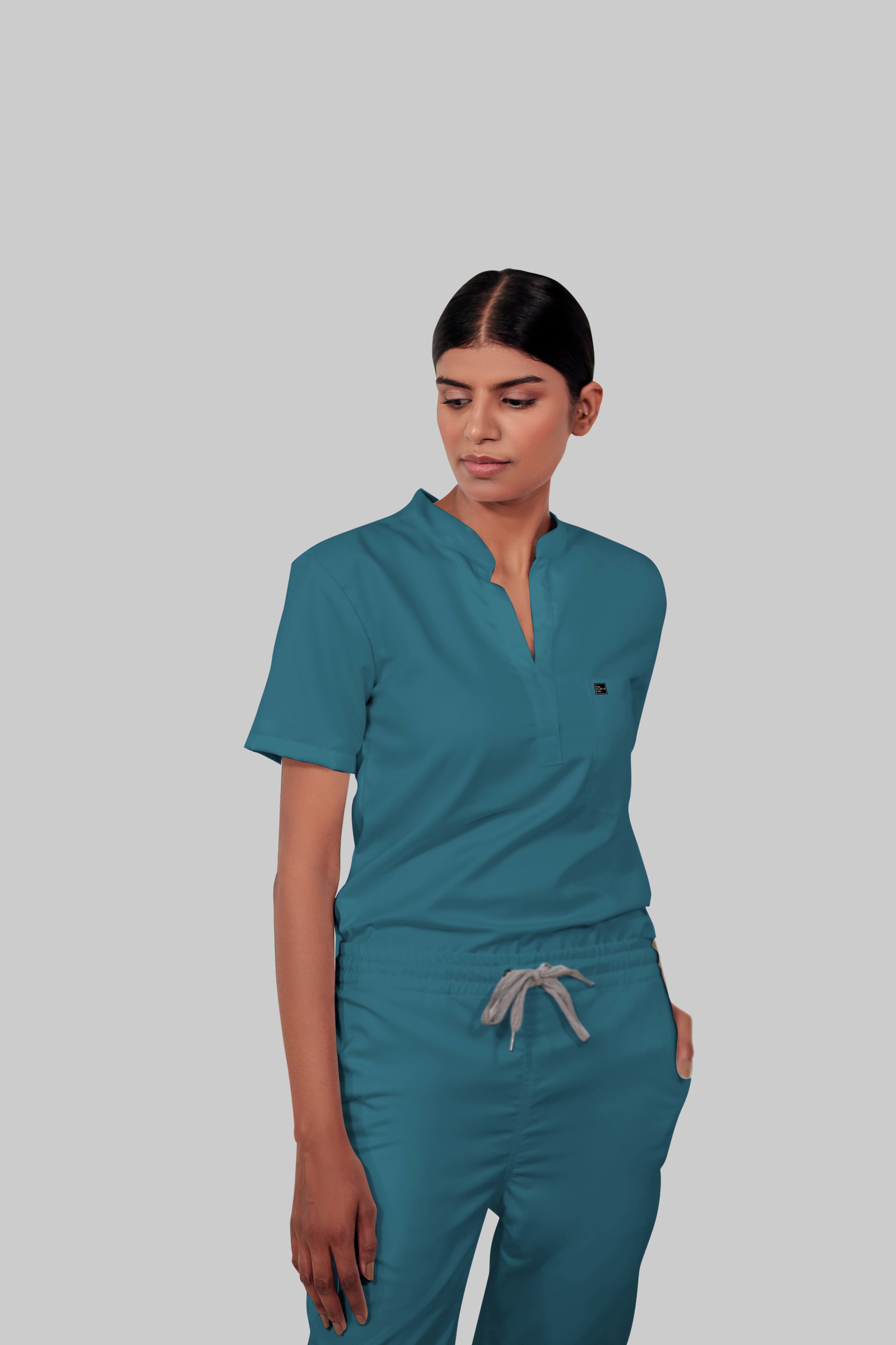 Stretchable (4Way) Female Peacock Blue Mandarin Neck With Straight Pant Scrub Set