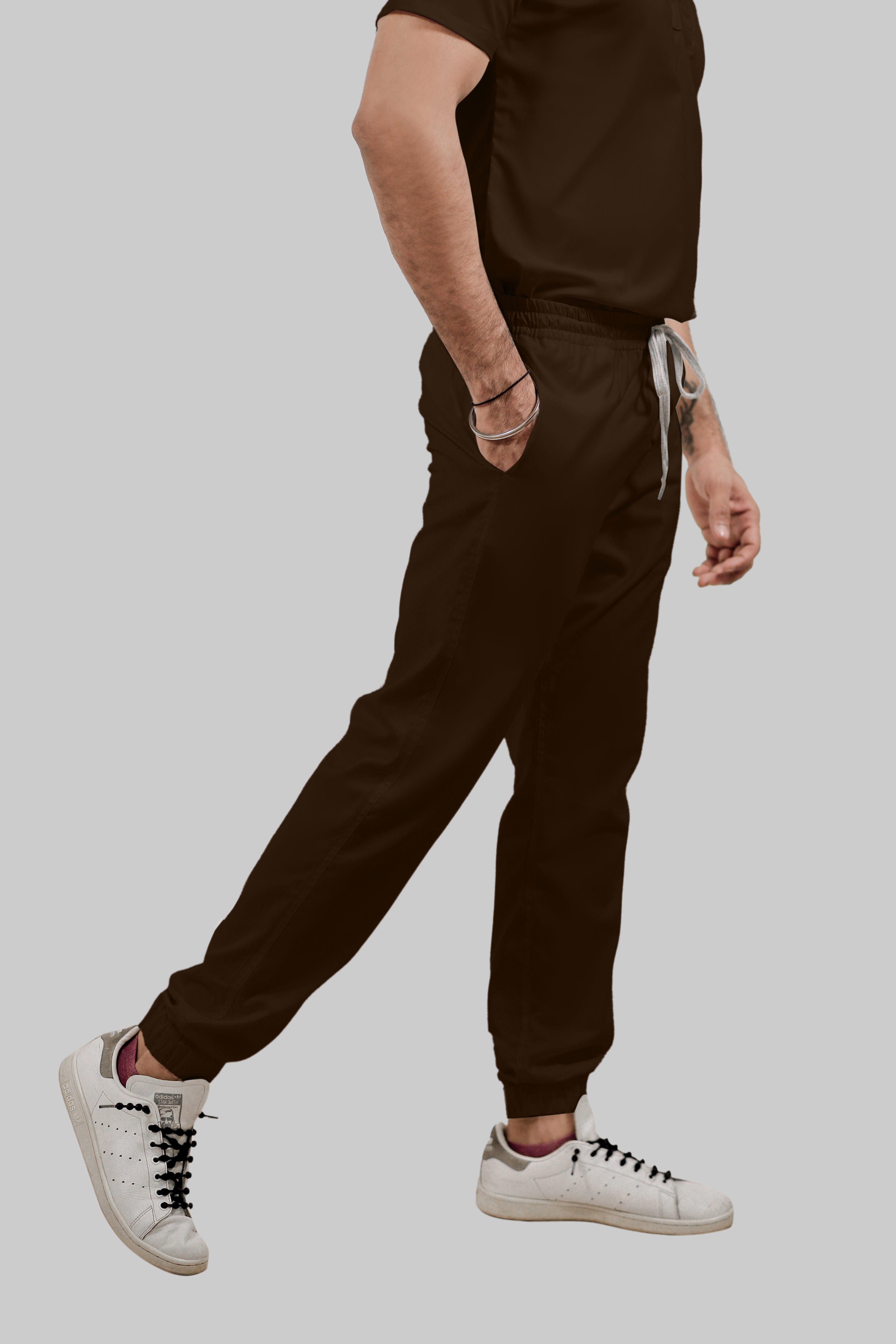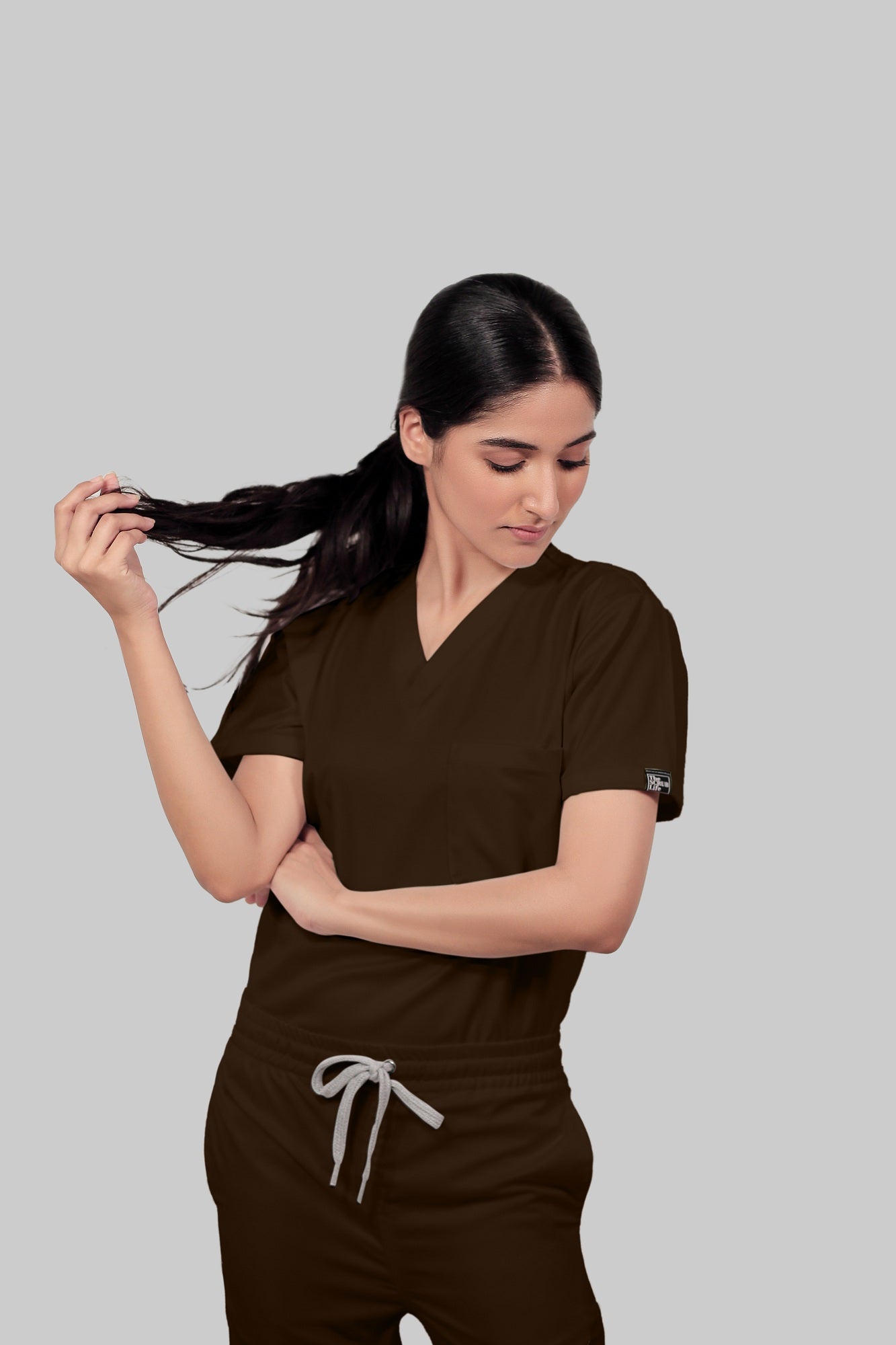 Stretchable (4Way) Female Brown V-Neck With Jogger Scrub Set